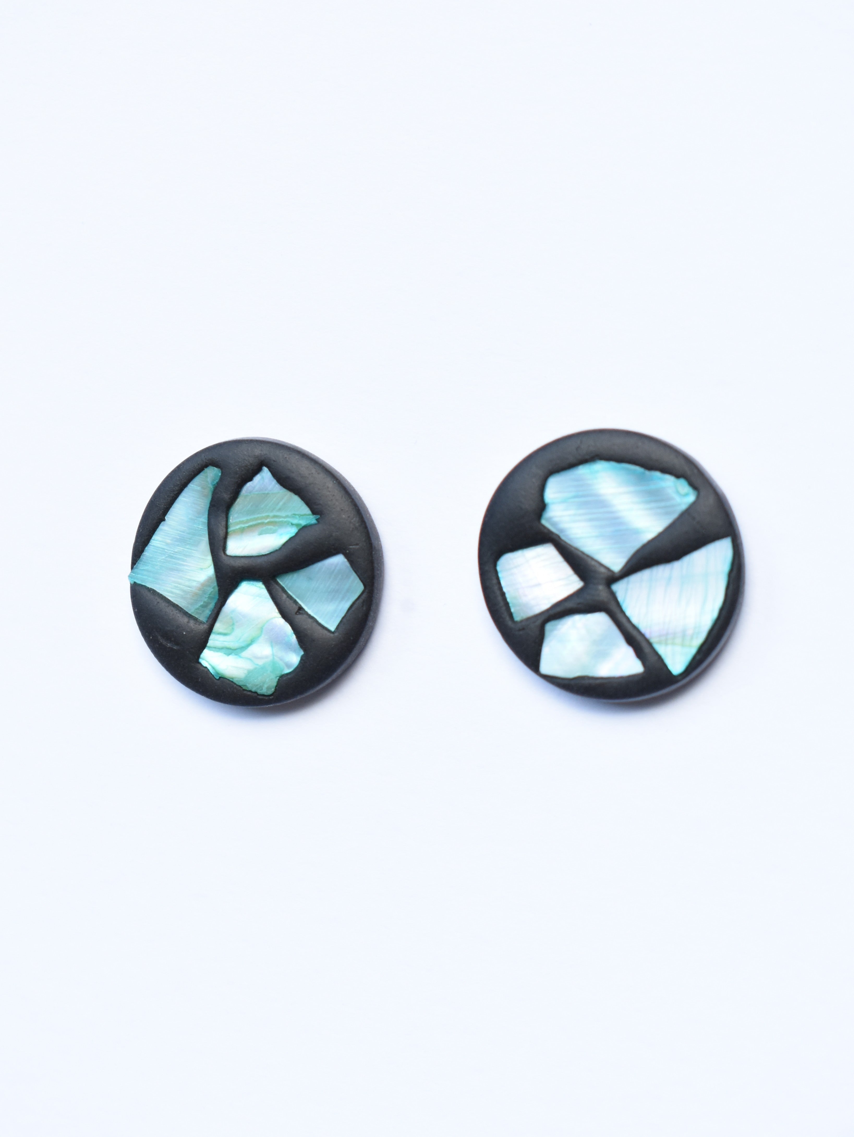 Black Stud Earrings with embedded dyed shell pieces. handmade using polymer clay and nickel free stainless steel posts Diameter: 2cm