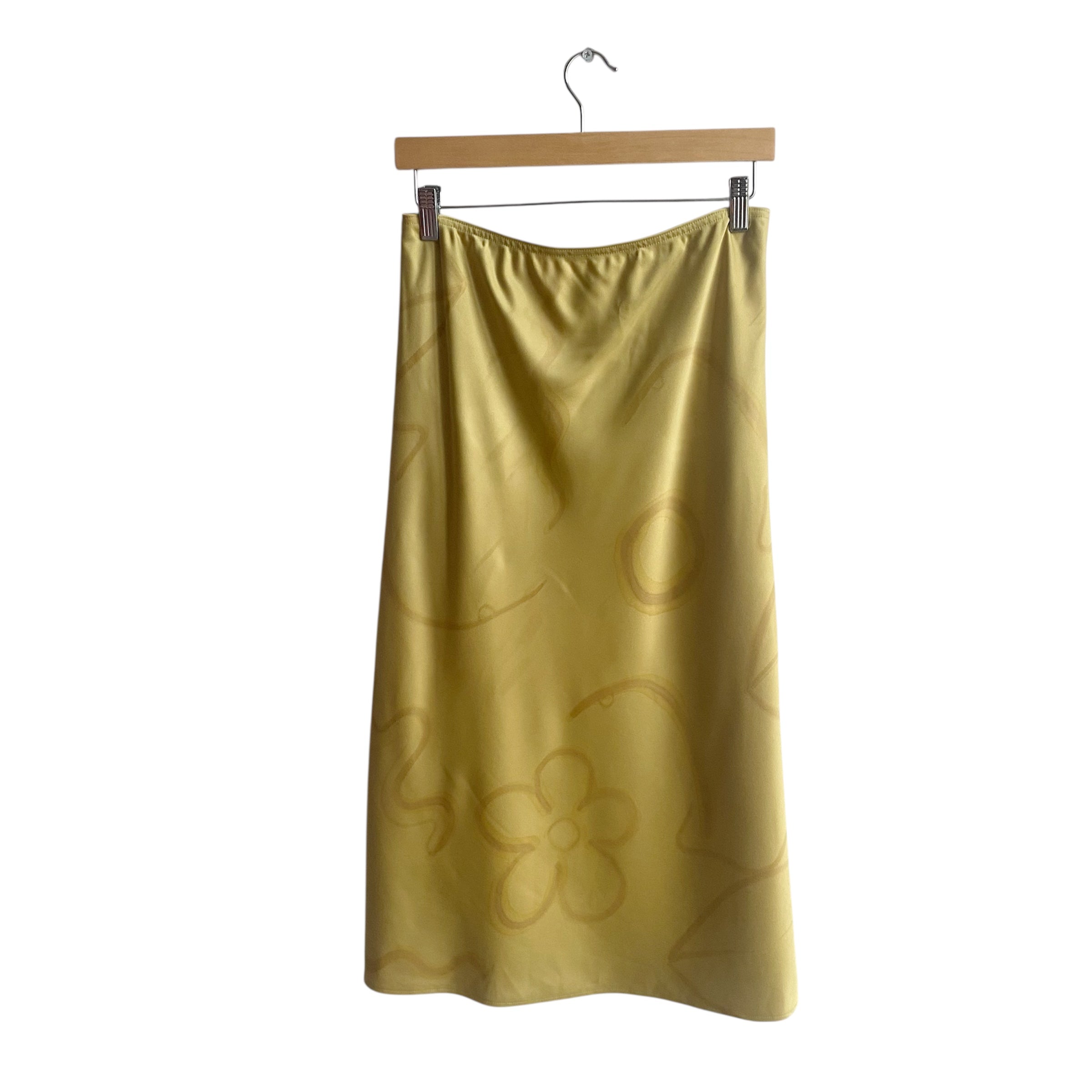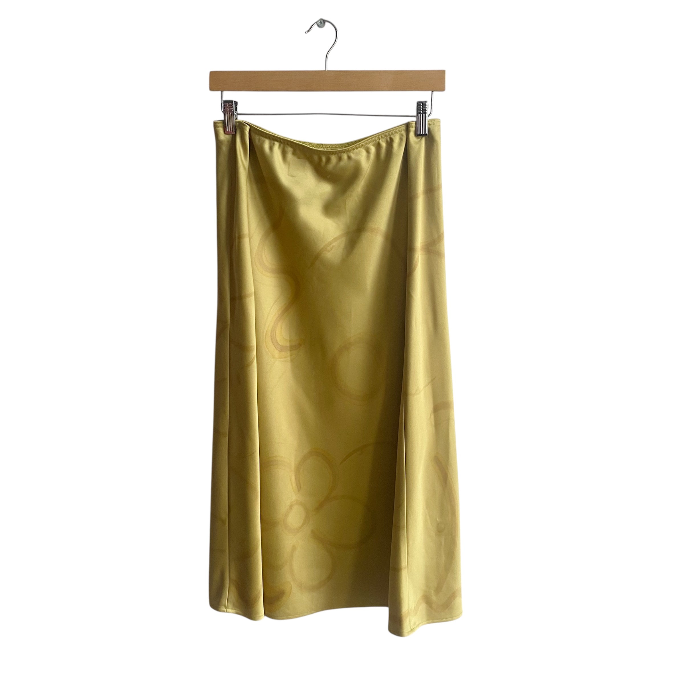 Preloved midi satin skirt. Featurings hand painted designs in golden hues. Polyester. Size X Large