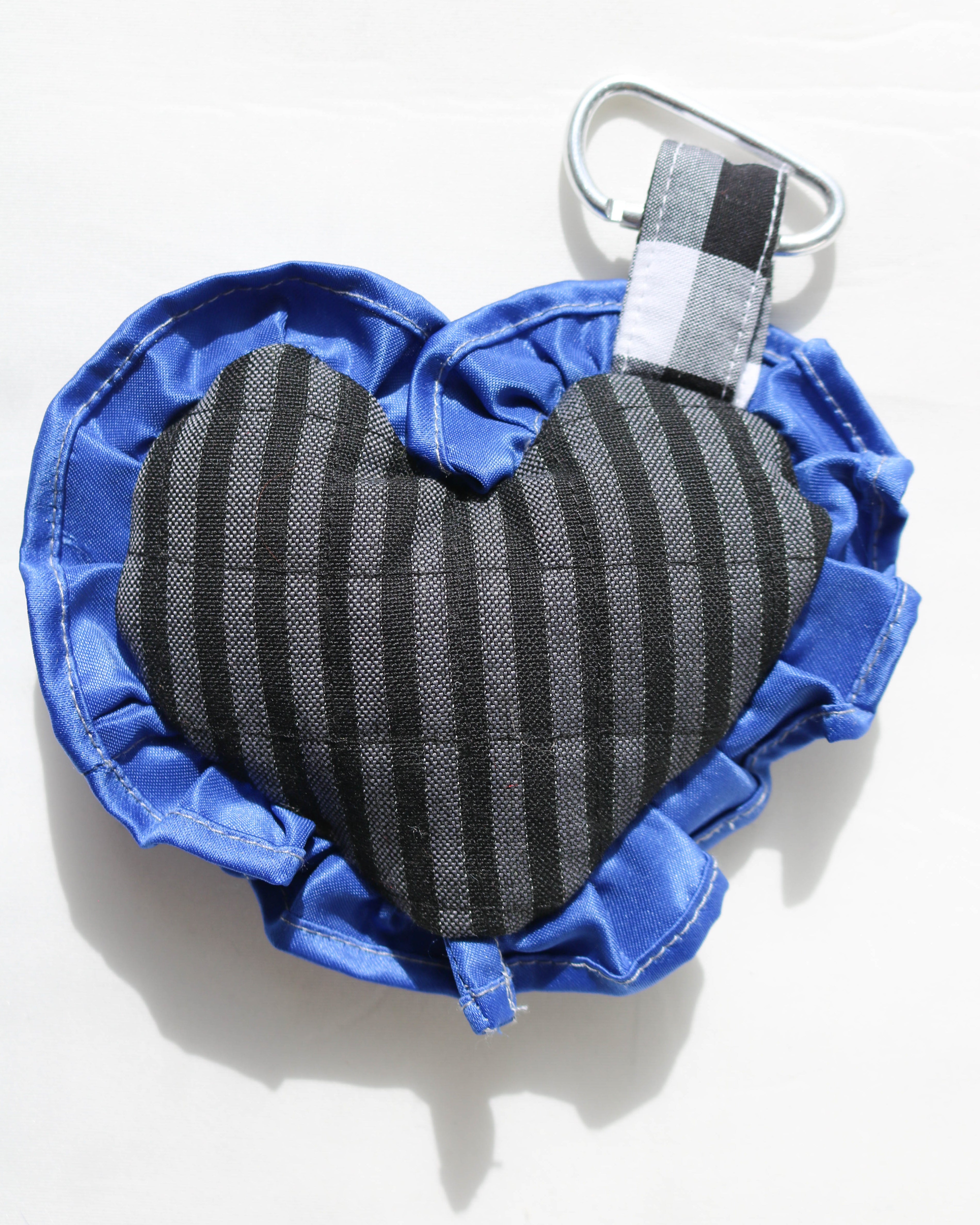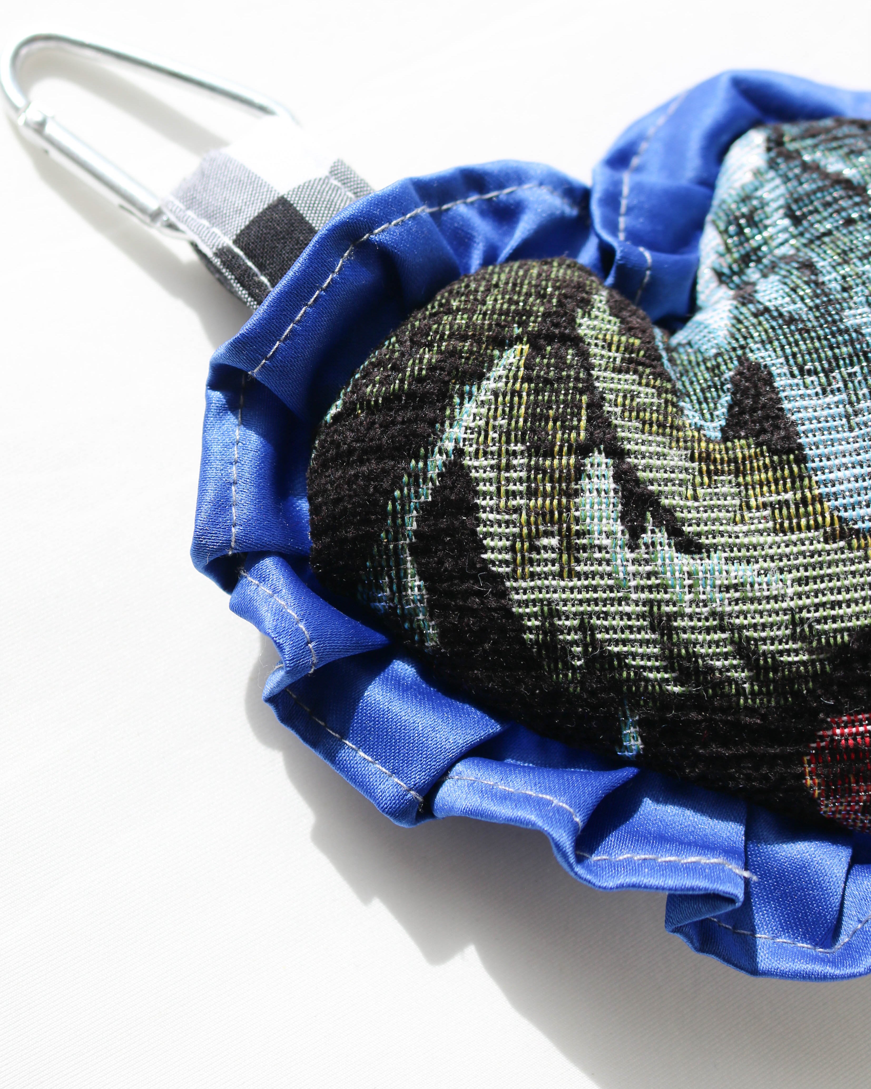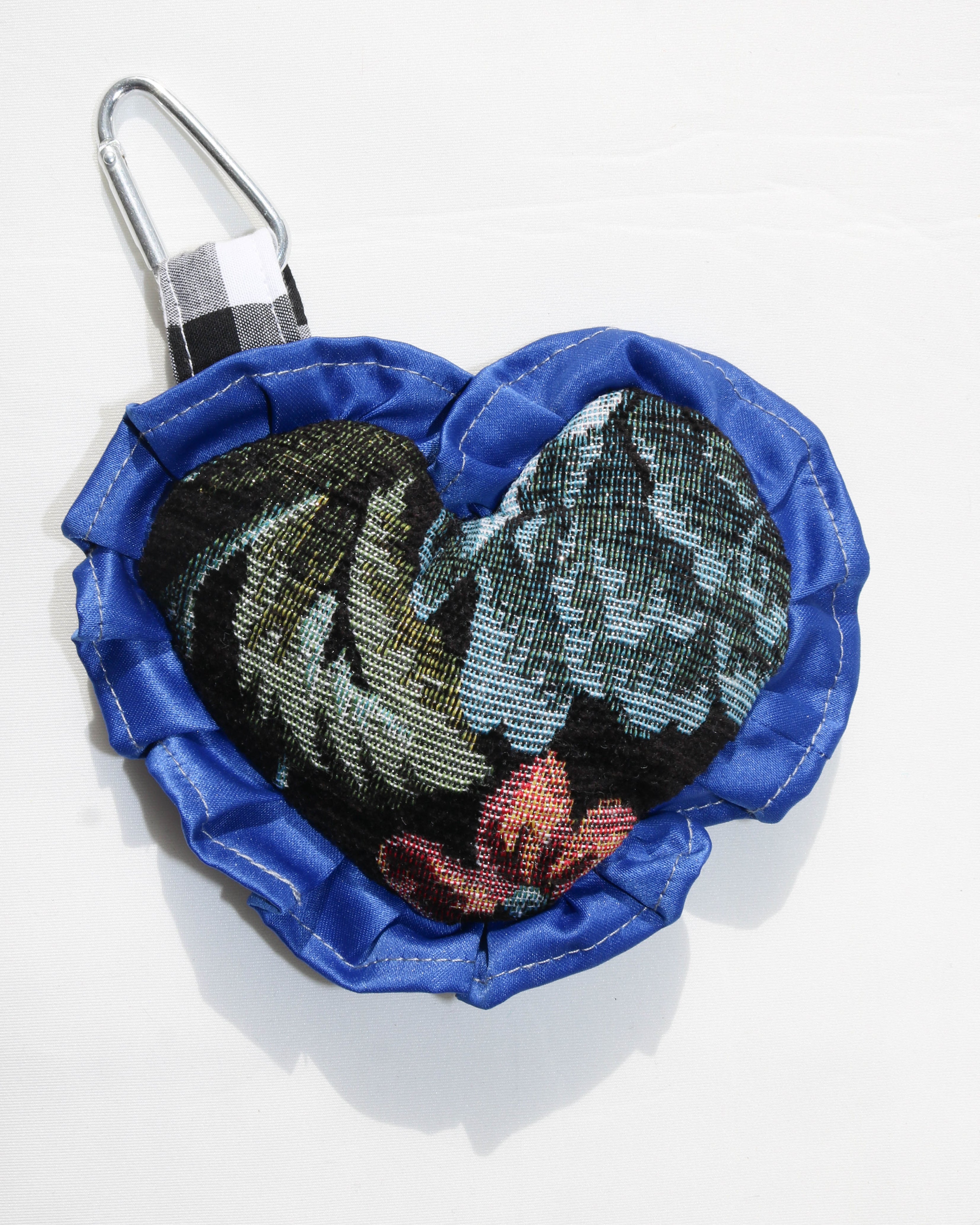 This heart-shaped bag charm features a glittery vintage floral fabric, black and grey woven fabric and a blue satin trim.