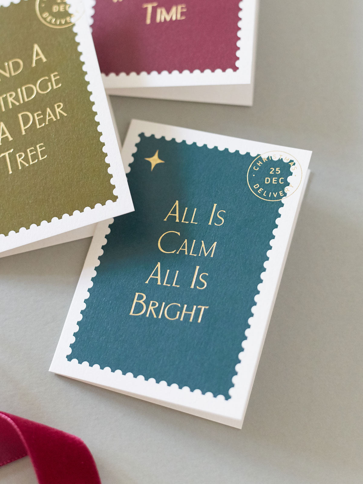 Inspired by Festive Postage Stamps, our Christmas card collection pays homage to the age-old tradition of sending warm wishes through letters and postcards during the holiday season. Jewel tones, mottled gold foil and retro typography all encapsulate the magic of communication and connection.