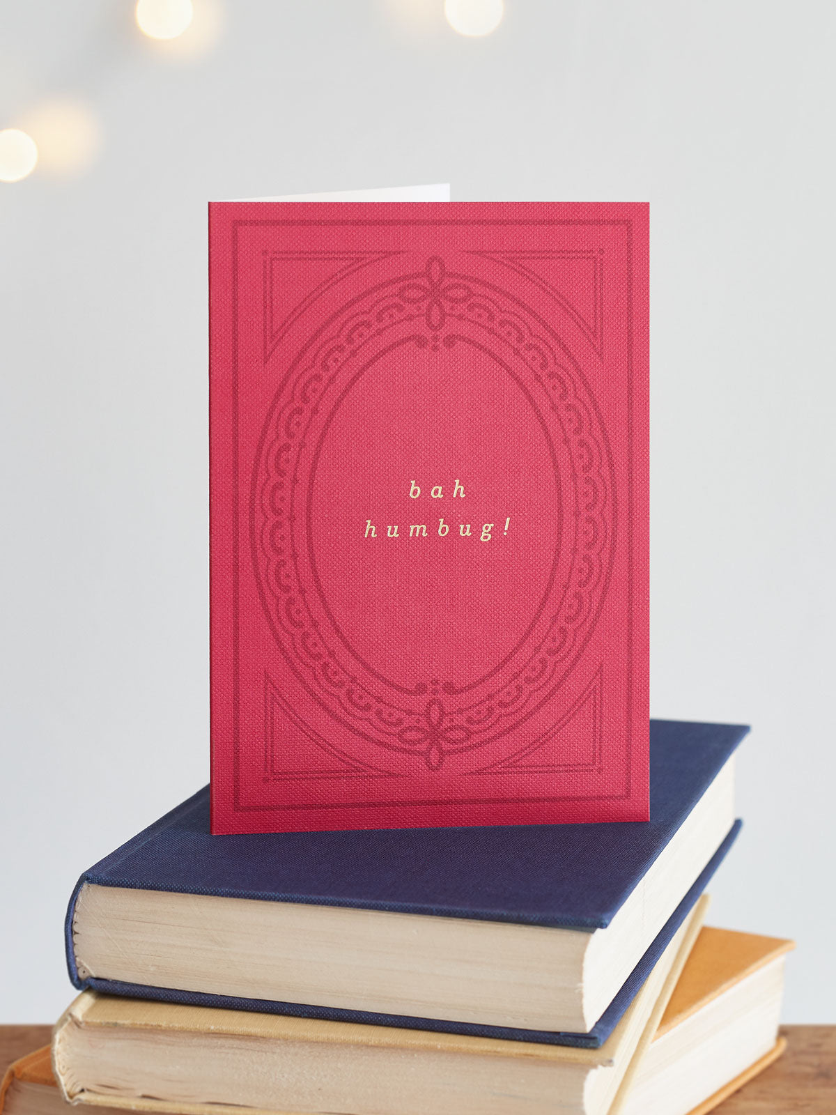 A dry seasonal sentiment for the discerning Scrooge. This card from our Book Club collection takes inspiration from vintage book covers, with rich colour, tactile buckram card stock, and hot foil detailing that mimics the texture of a classic clothbound novel. A wry choice for lovers of literature and anyone with a taste for timeless design and tongue-in-cheek festive cheer.