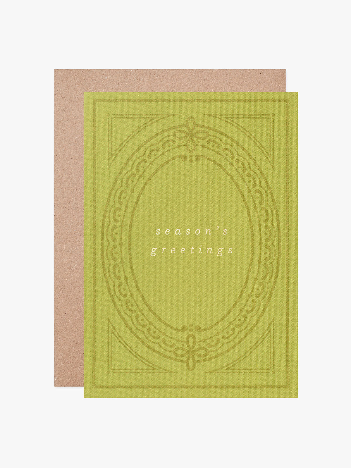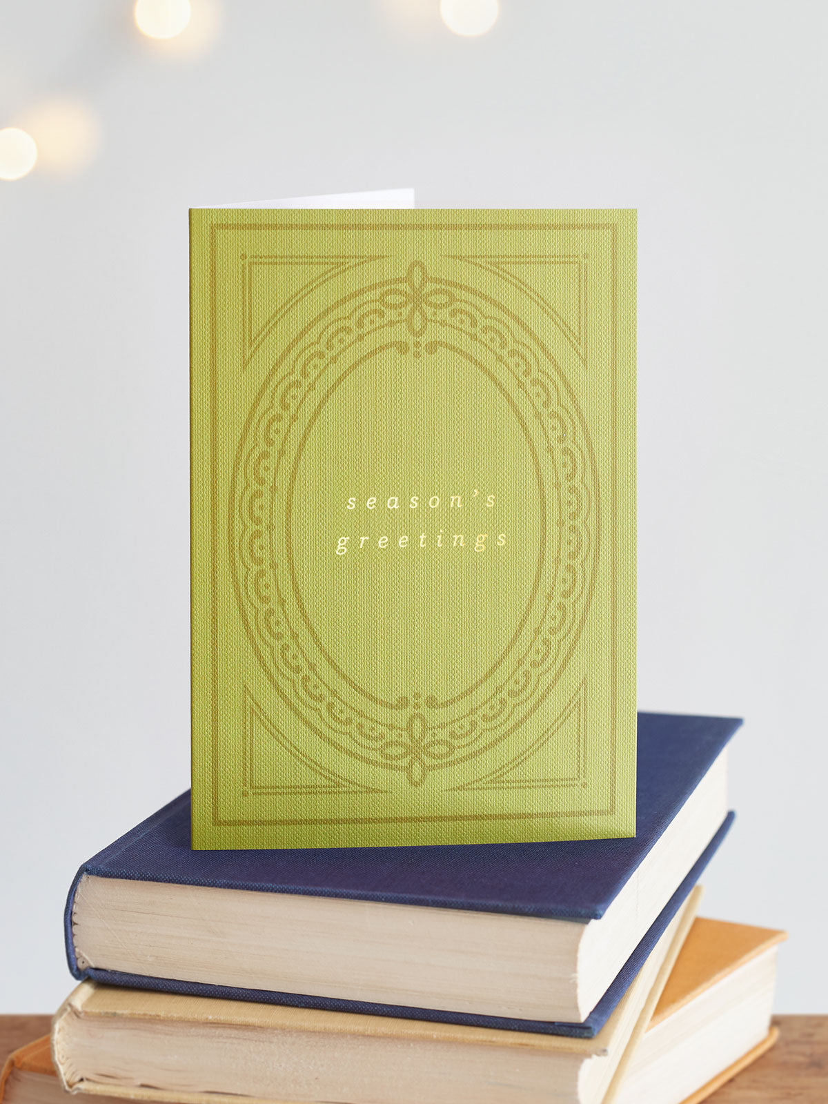 From our Book Club collection, this card combines the warm familiarity of a classic hardback with the elegance of hot foil detailing. ‘Season’s Greetings’ is rendered in festive lettering on textured buckram card stock — a nod to vintage book design and a nostalgic approach to holiday style.