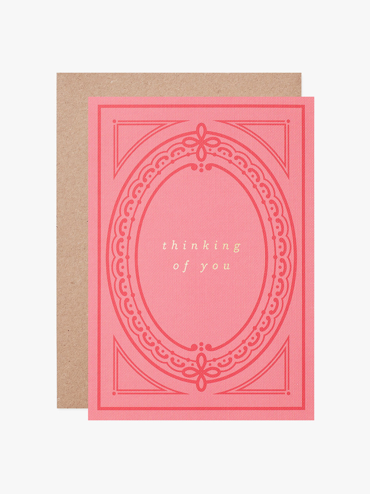From our Book Club collection, this colourful yet understated design takes cues from vintage book covers and the joy of thoughtful correspondence. The phrase ‘Thinking of You’ is hot foil stamped by hand in our small studio onto pink, buckram-textured card stock that echoes the feel of a classic hardback.