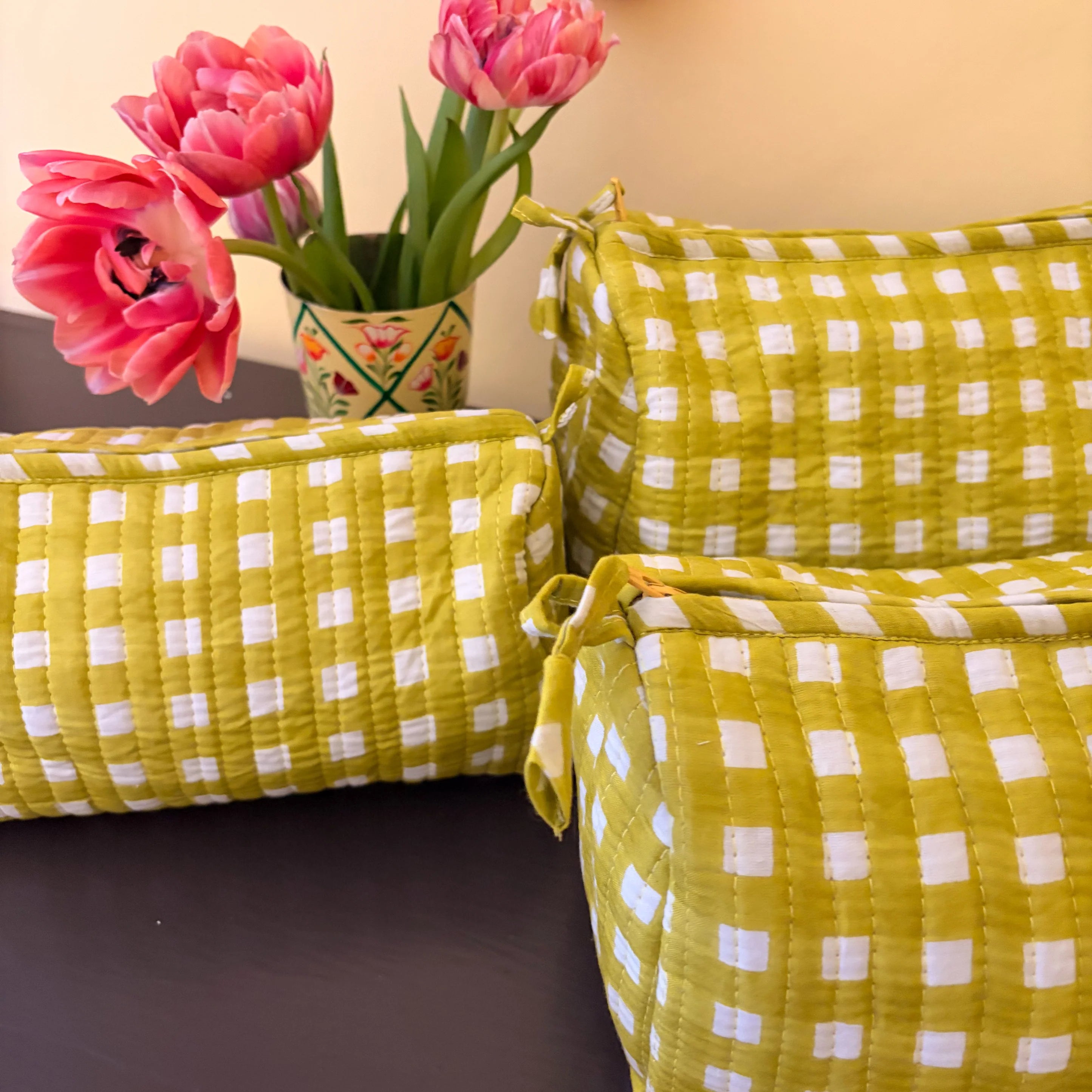 A beautifully practical cosmetic bag made from screen printed cotton, in check pattern. Softly quilted for structure and durability, this spacious bag is perfect for storing toiletries, cosmetics, or everyday essentials whether at home or travelling.