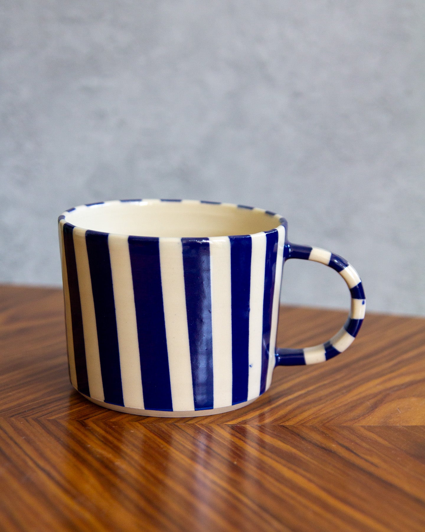 The perfect mug to use every day for your morning tea or coffee. Hand thrown on the pottery wheel from white stoneware clay, with a handpainted geometric line design.