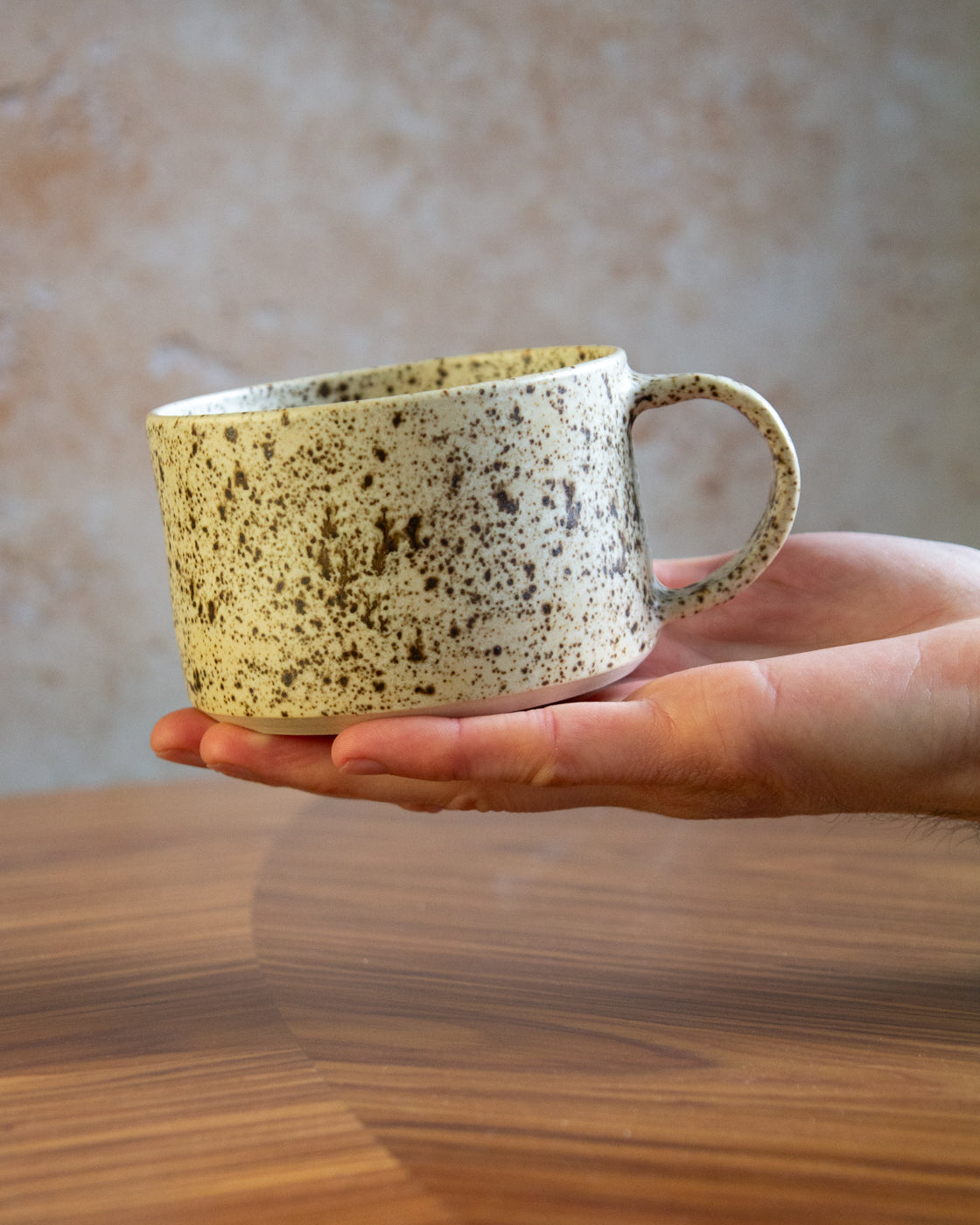 The perfect mug to use every day for your morning tea or coffee. Hand thrown on the pottery wheel from white stoneware clay and finished in speckled Rustic glaze.