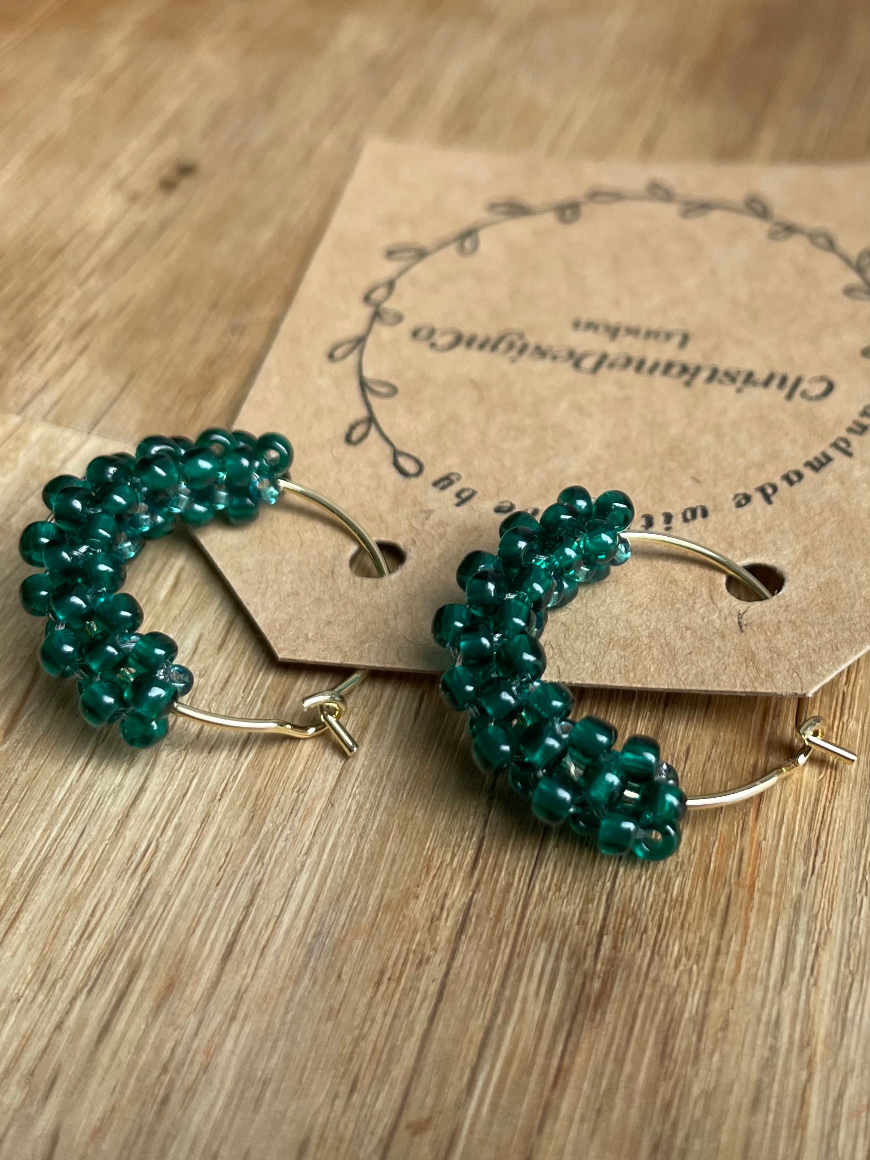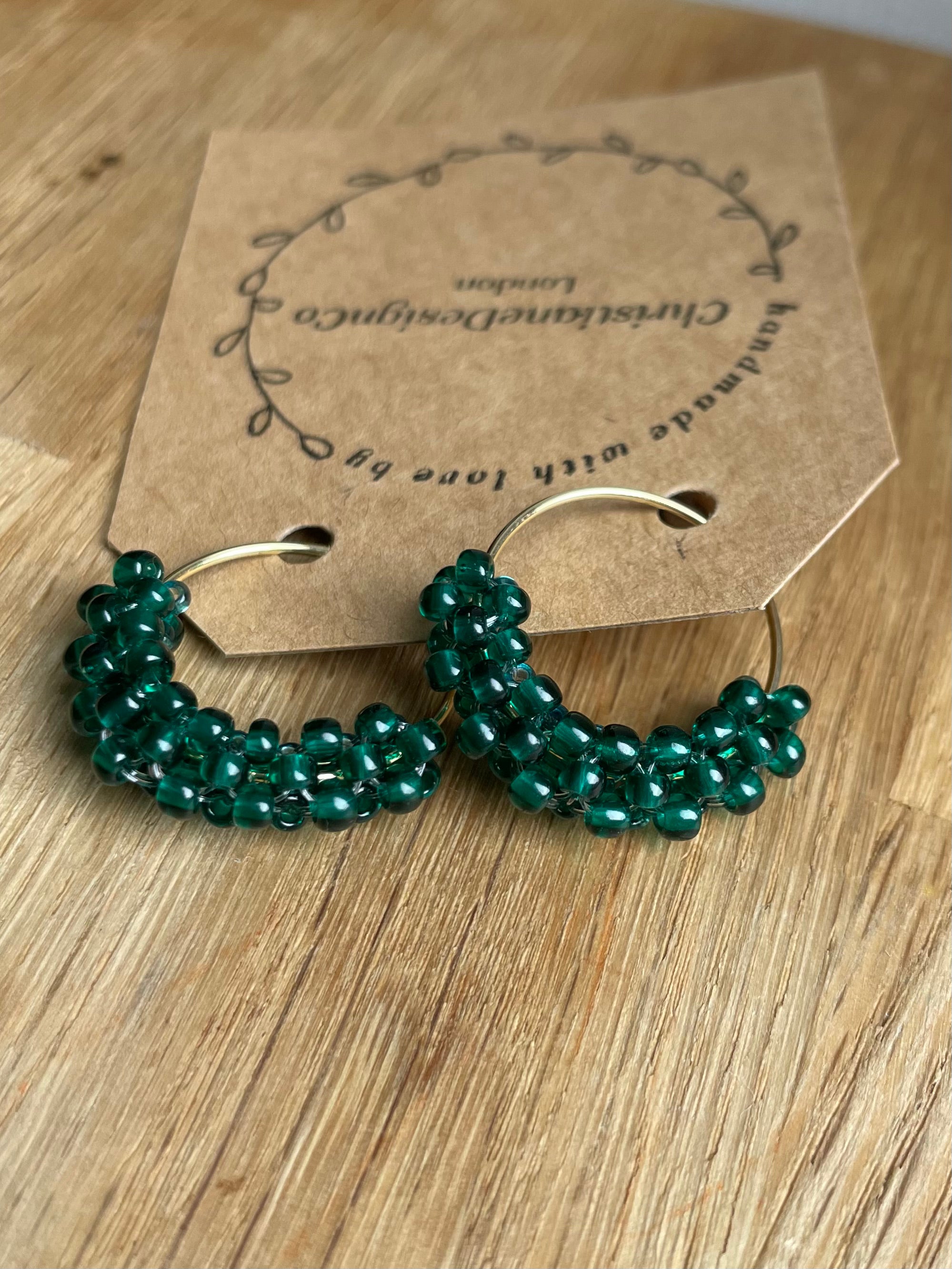 These hoops are made with Japanese Miyuki glass beads in two different sizes. Knitted around 14 carat gold plated 2cm hoops.