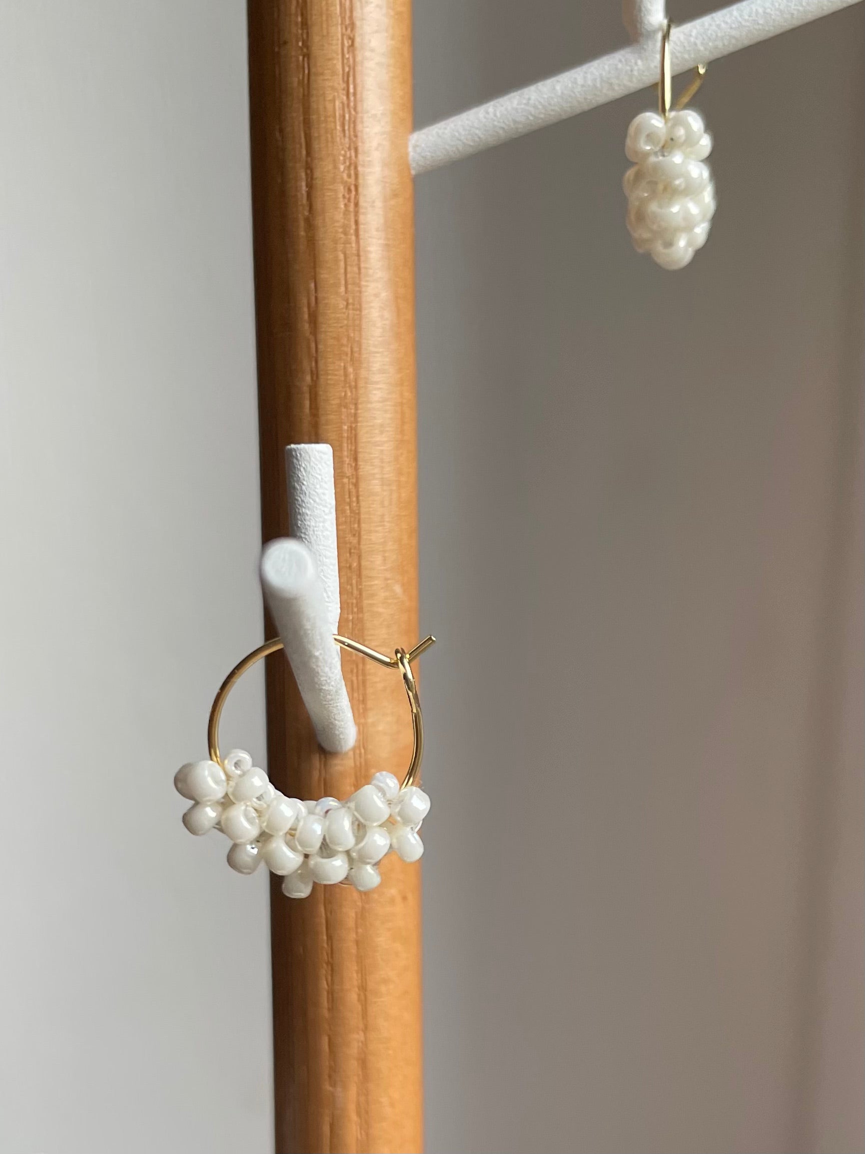 These hoops are made with Japanese Miyuki glass beads in two different sizes. Knitted around 14 carat gold plated 1.5 cm hoops.