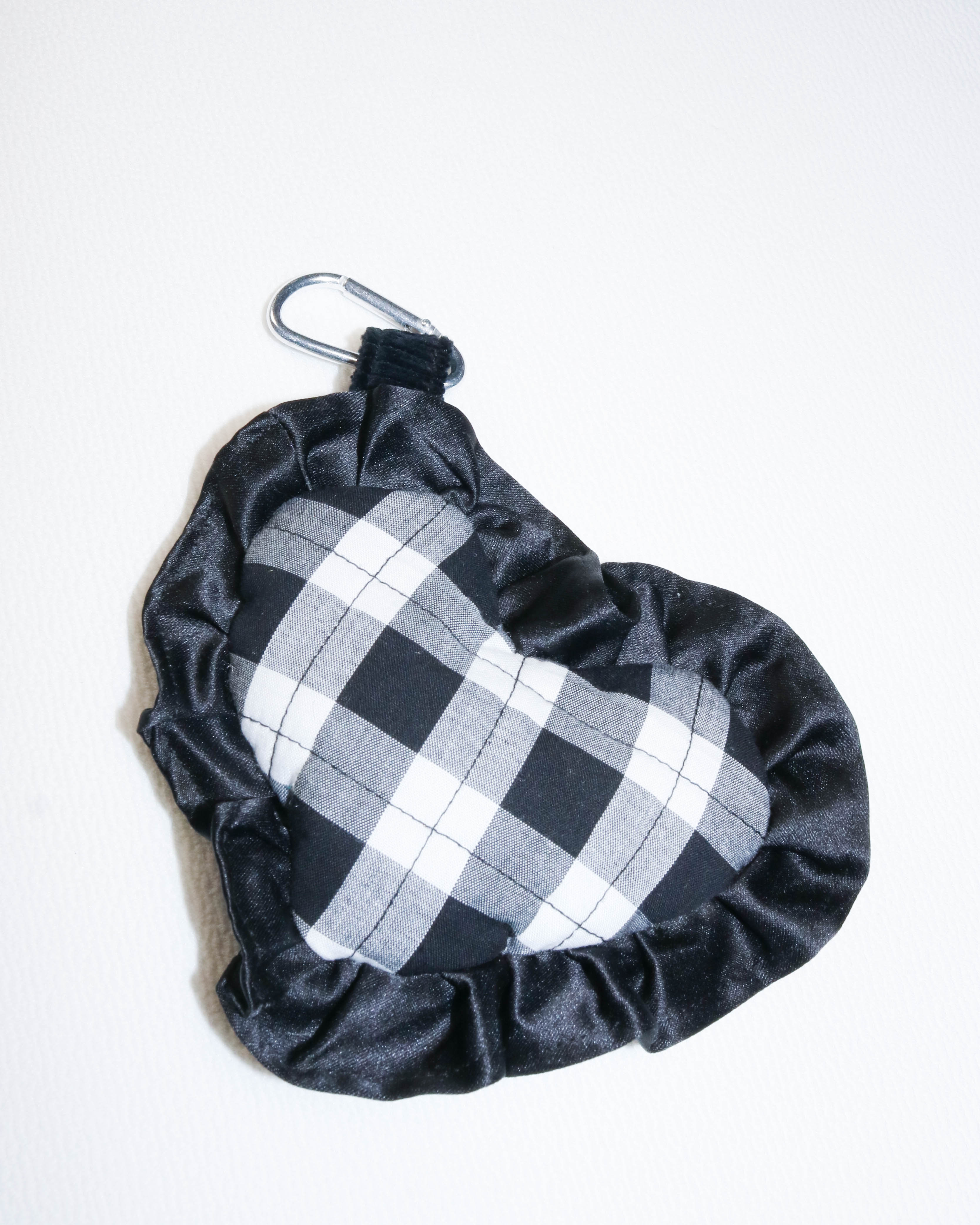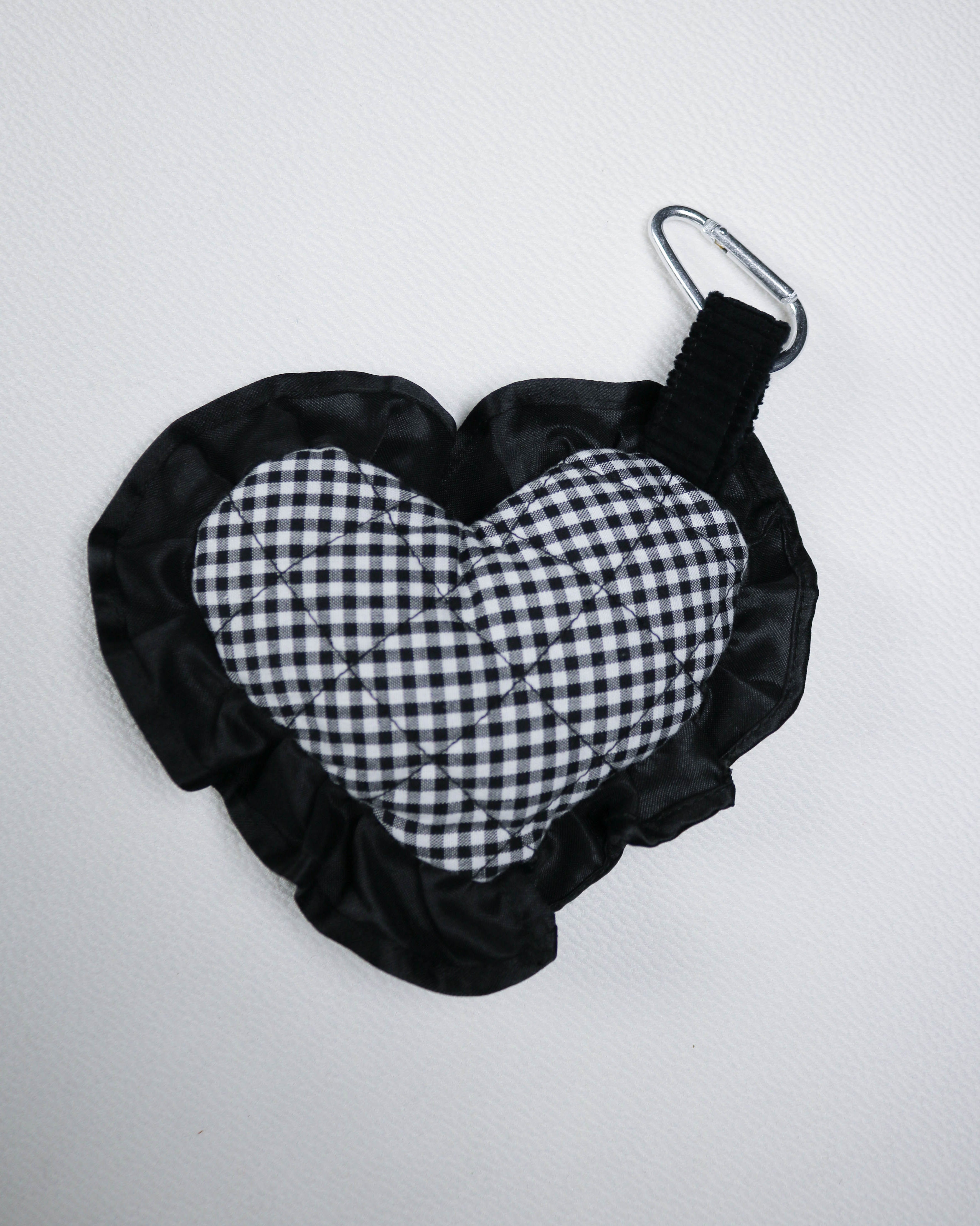 This heart-shaped bag charm proves that you can’t go wrong with black. Two types of gingham, satin ruffles and a touch of chunky cord showcase my favourite colour in all its forms.