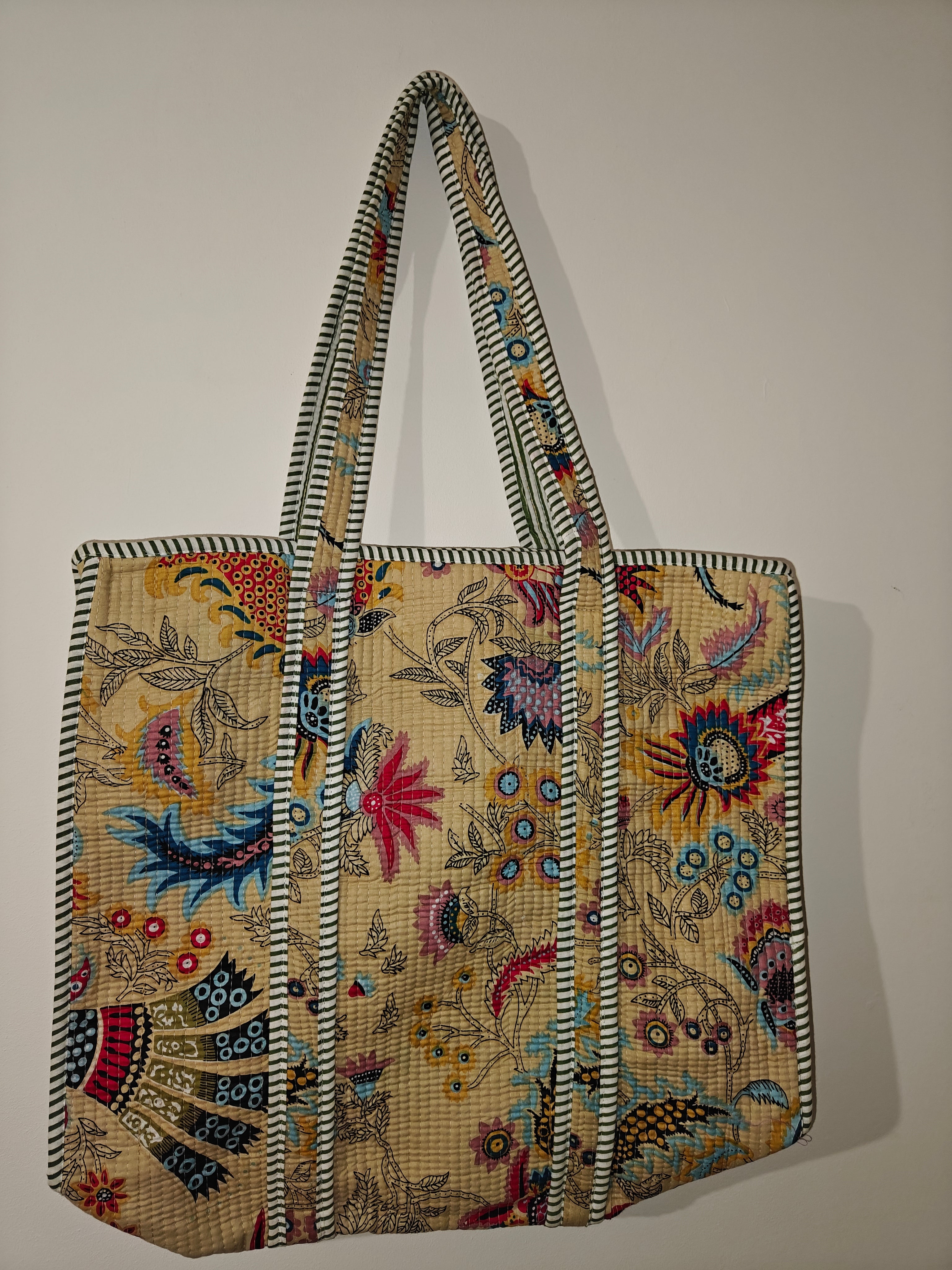 Handmade in India, this large reversible tote bag in made from 100% cotton, quilted with hand screen prints and has an inside pocket. This bag is machine washable on a gentle cycle. Dark colours tend to bleed due to natural dyes which is a natural process so wash them separately. Approx. 18x18 inches.
