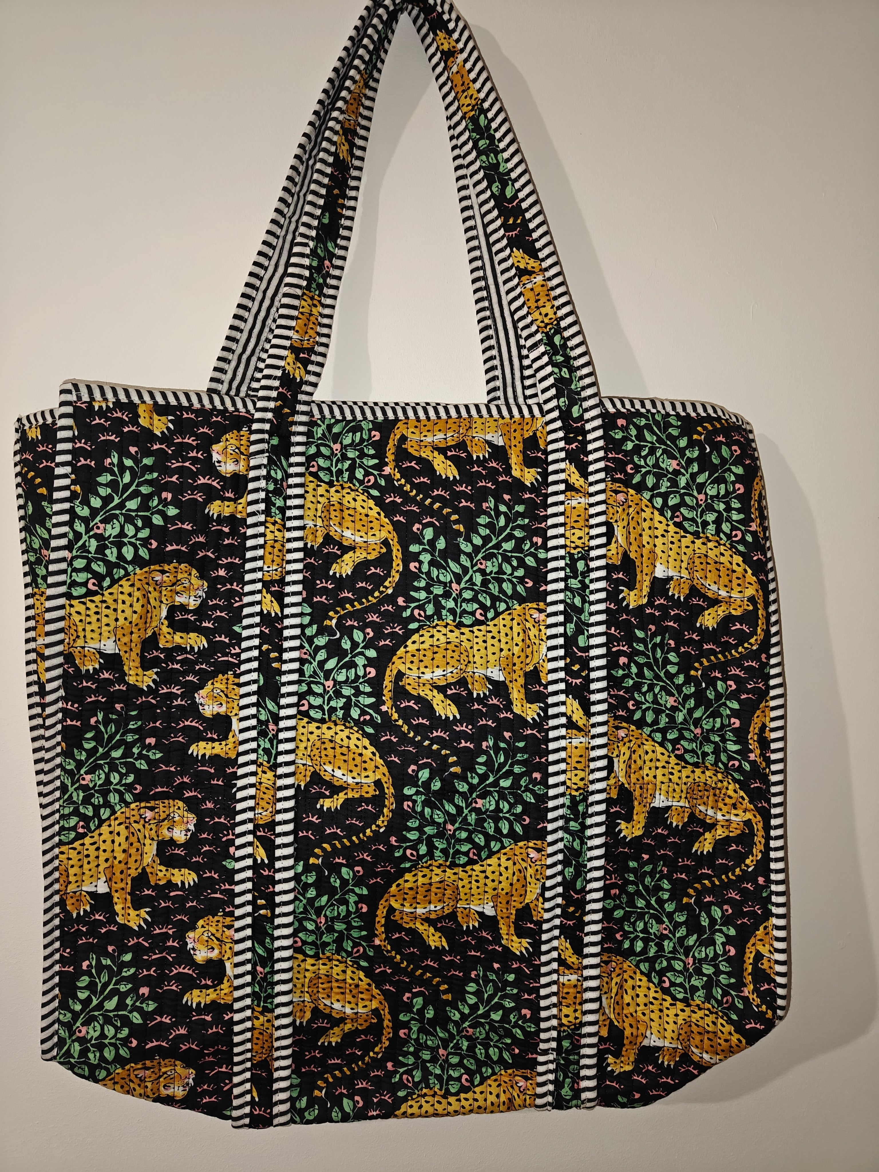 Handmade in India, this large reversible tote bag in made from 100% cotton, quilted with hand screen prints and has an inside pocket. This bag is machine washable on a gentle cycle. Dark colours tend to bleed due to natural dyes which is a natural process so wash them separately. Approx. 18x18 inches.