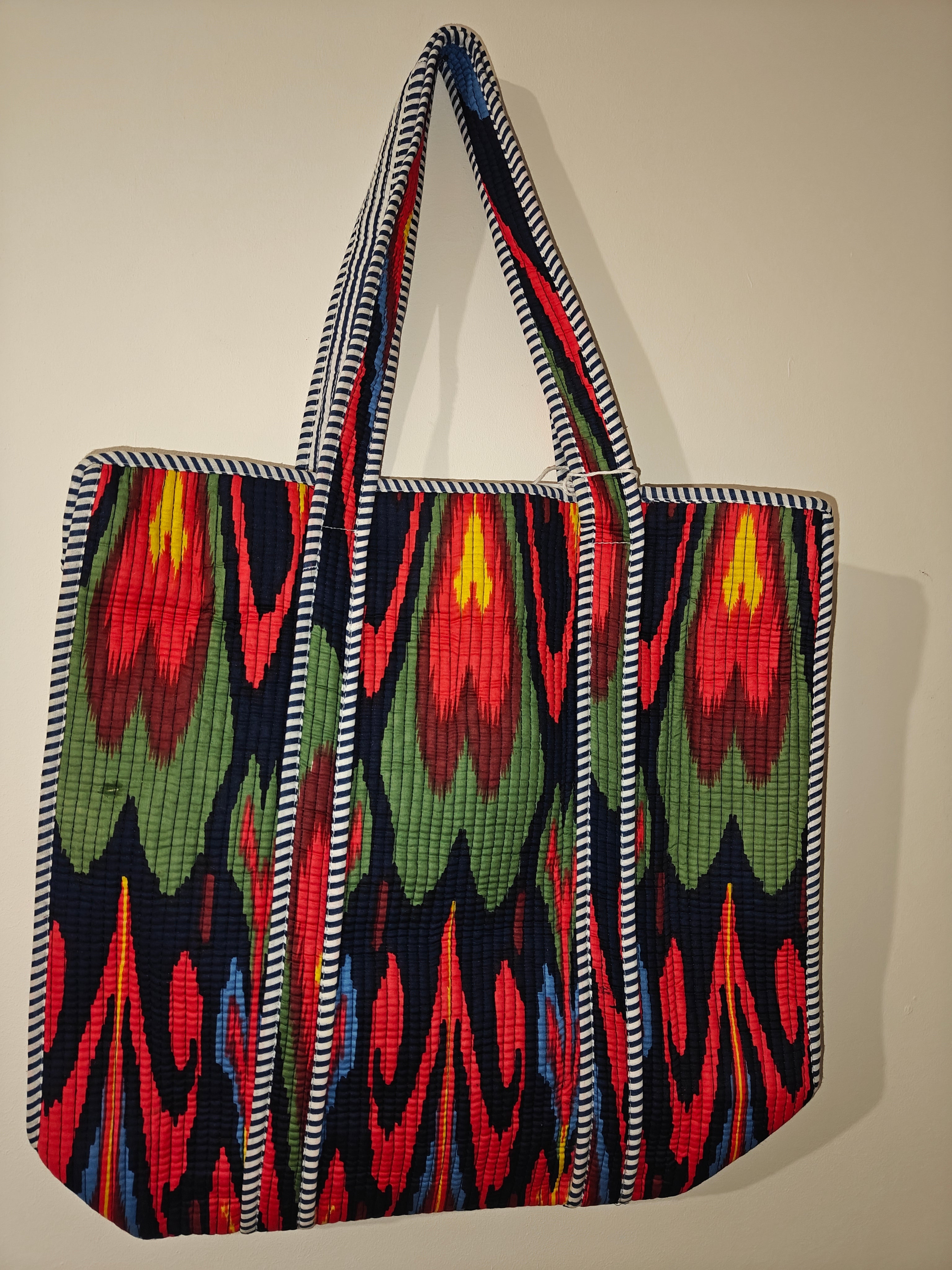 Handmade in India, this large reversible tote bag in made from 100% cotton, quilted with hand screen prints and has an inside pocket. This bag is machine washable on a gentle cycle. Dark colours tend to bleed due to natural dyes which is a natural process so wash them separately. Approx. 18x18 inches.