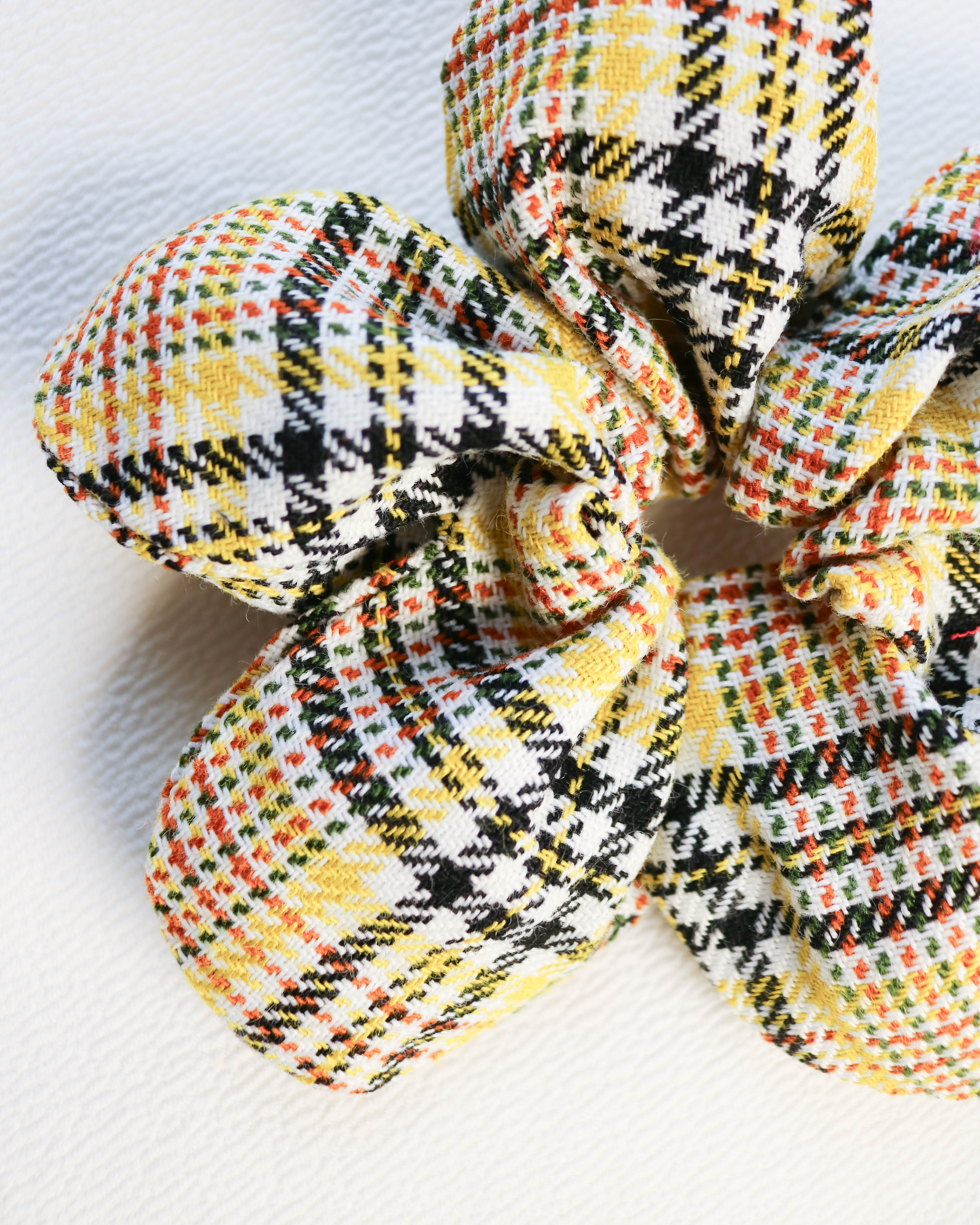 A playful hair accessory in a classically styled yellow tartan fabric which feels light and comfortable when worn. Lightly stuffed to hold its flower shape, with strong elastic for durability.