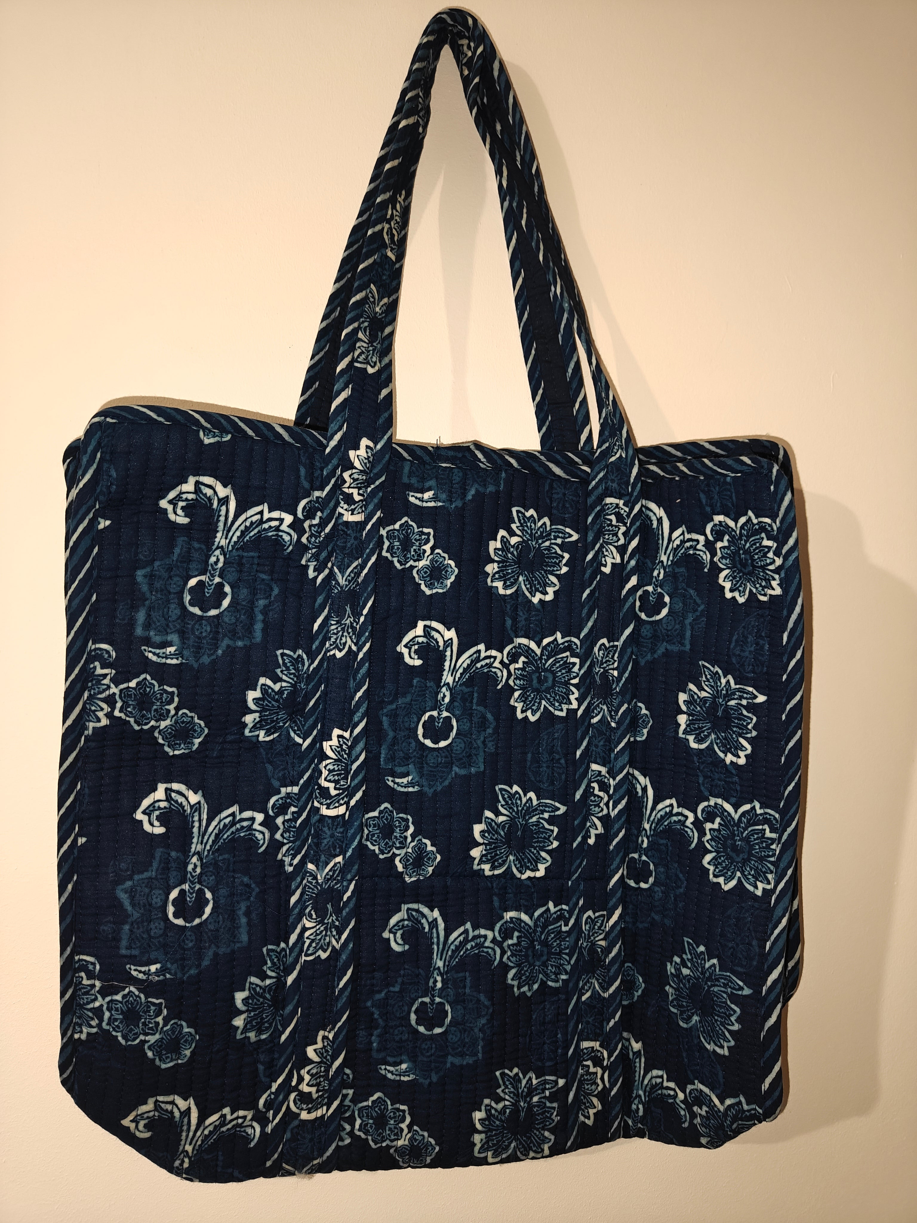 Handmade in India, this tote bag in made from 100% cotton, quilted with hand screen prints and has an inside pocket. This bag is machine washable on a gentle cycle. Dark colours tend to bleed due to natural dyes which is a natural process so wash them separately. Approx. 15x15 inches.