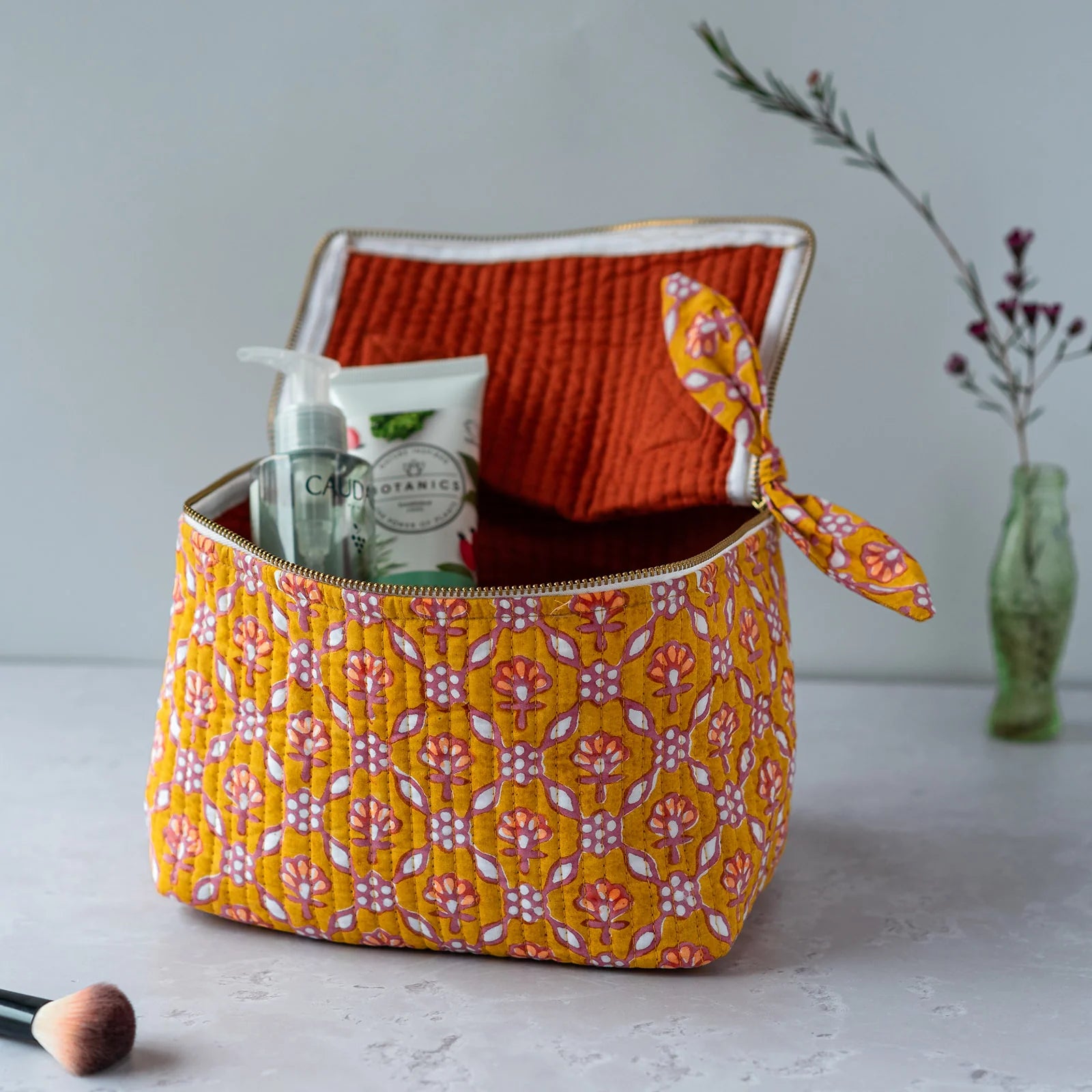 Large hand block printed cosmetic case / bag, perfect for fitting everything in, be it lotions and make up or baby products and wipes. The case is a cube shape with a zip on three sides making it easy to find everything. It has a handy handle on top. Lined with co-ordinating fabric.