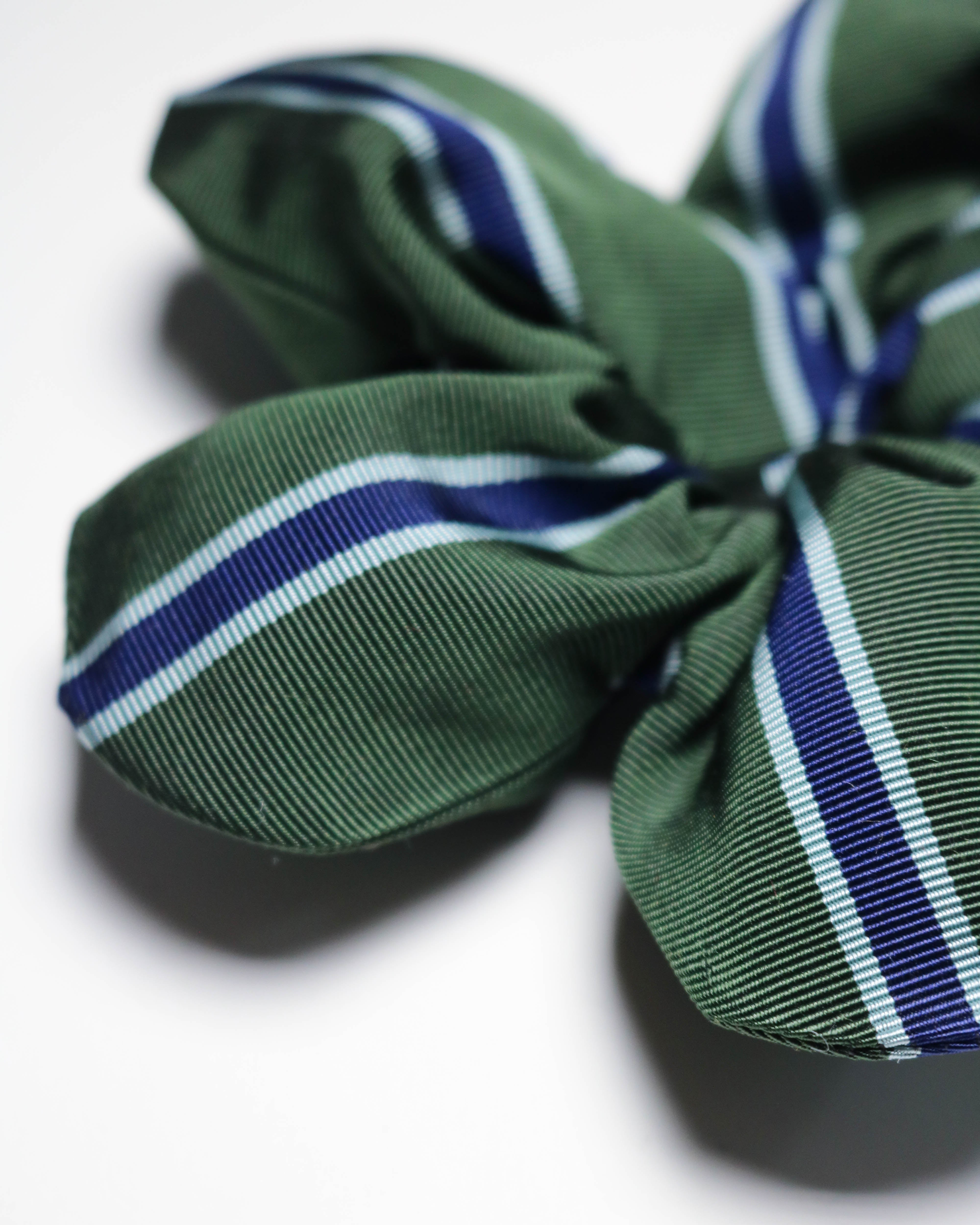 A playful hair accessory in a green fabric with a striped detail, which feels light and comfortable when worn. Lightly stuffed to hold its flower shape, with strong elastic for durability.