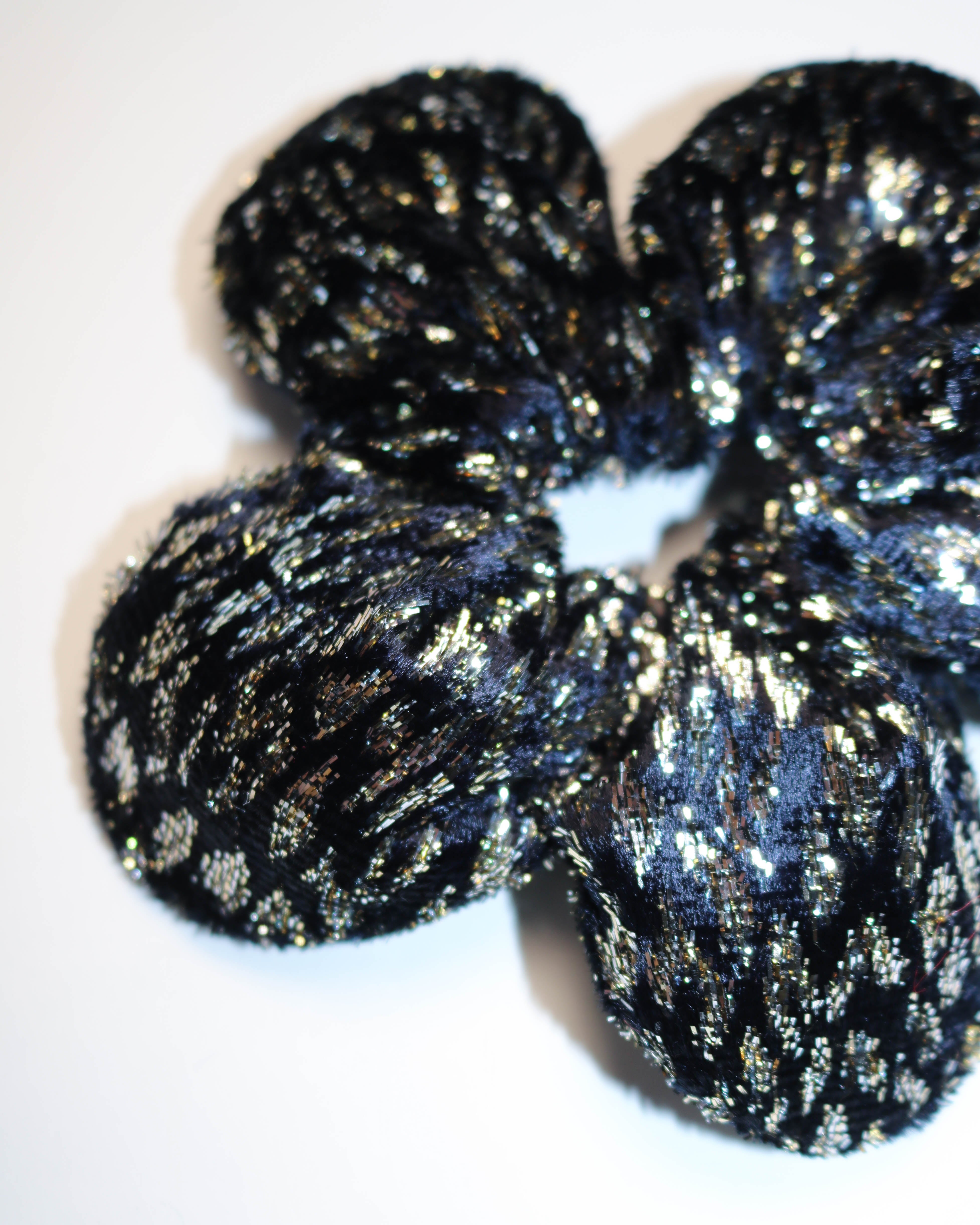 A playful hair accessory in a striking silver velvet fabric which feels light and comfortable when worn. Lightly stuffed to hold its flower shape, with strong elastic for durability.