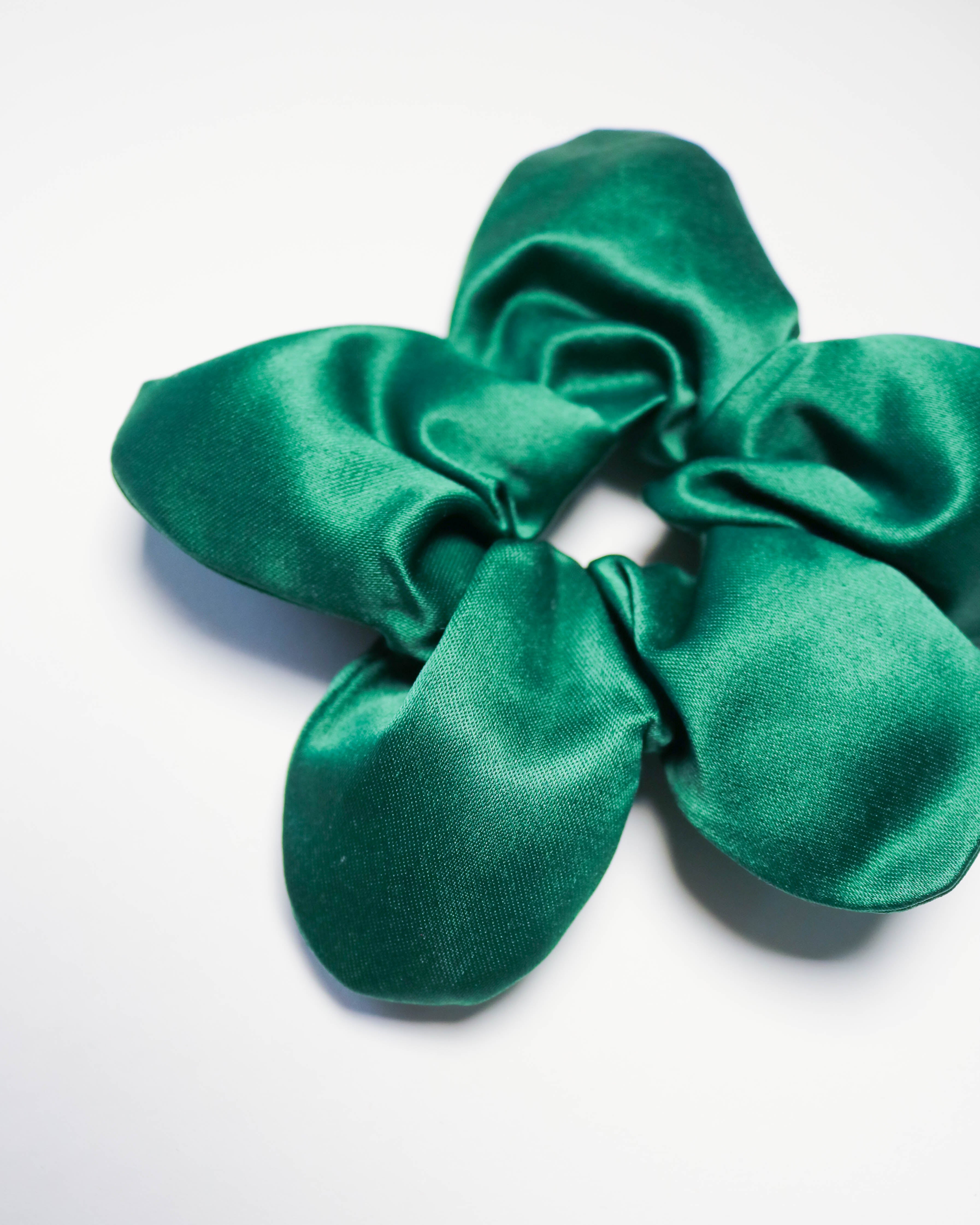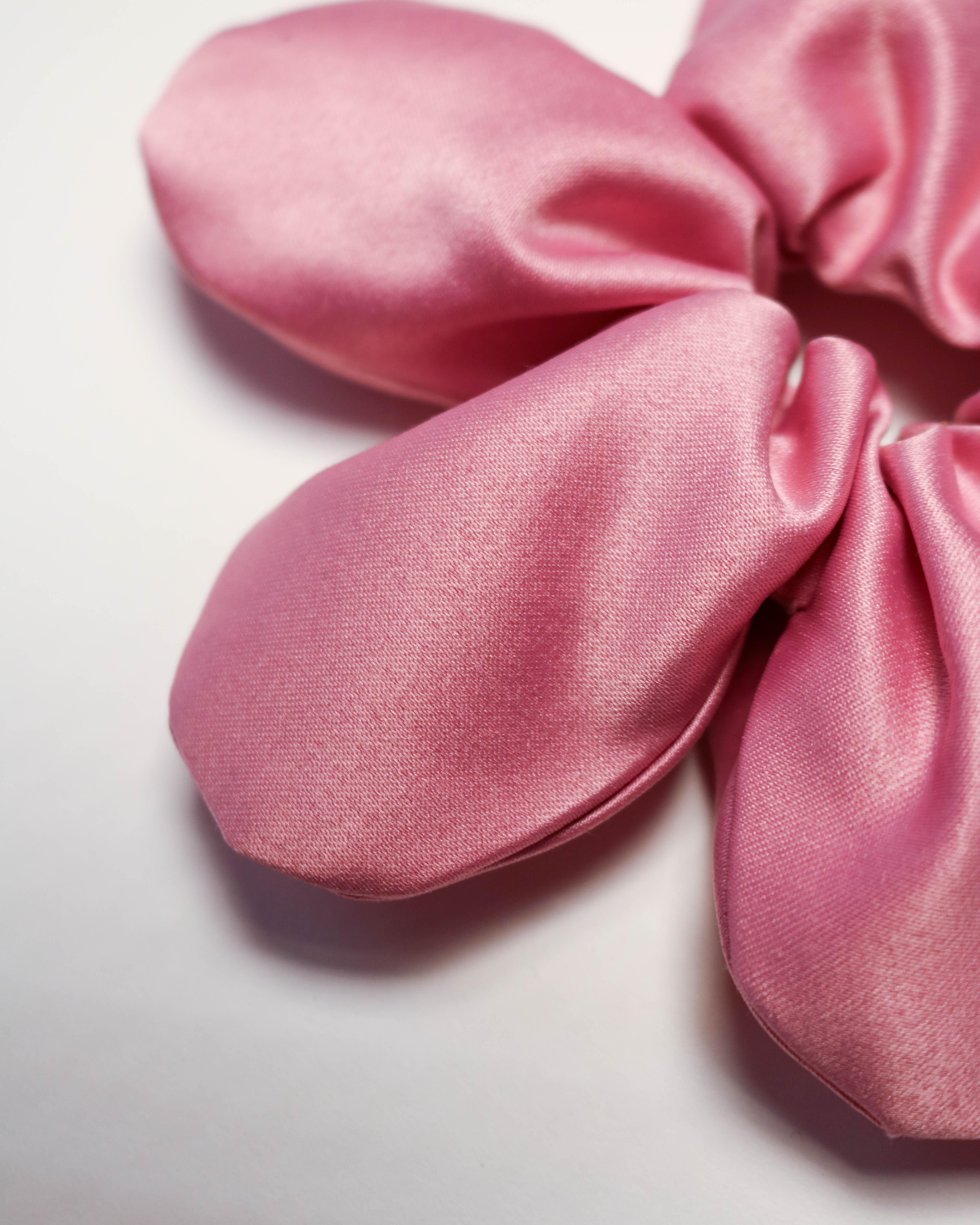 A playful hair accessory in satin which feels light and comfortable when worn. Lightly stuffed to hold its flower shape, with strong elastic for durability.