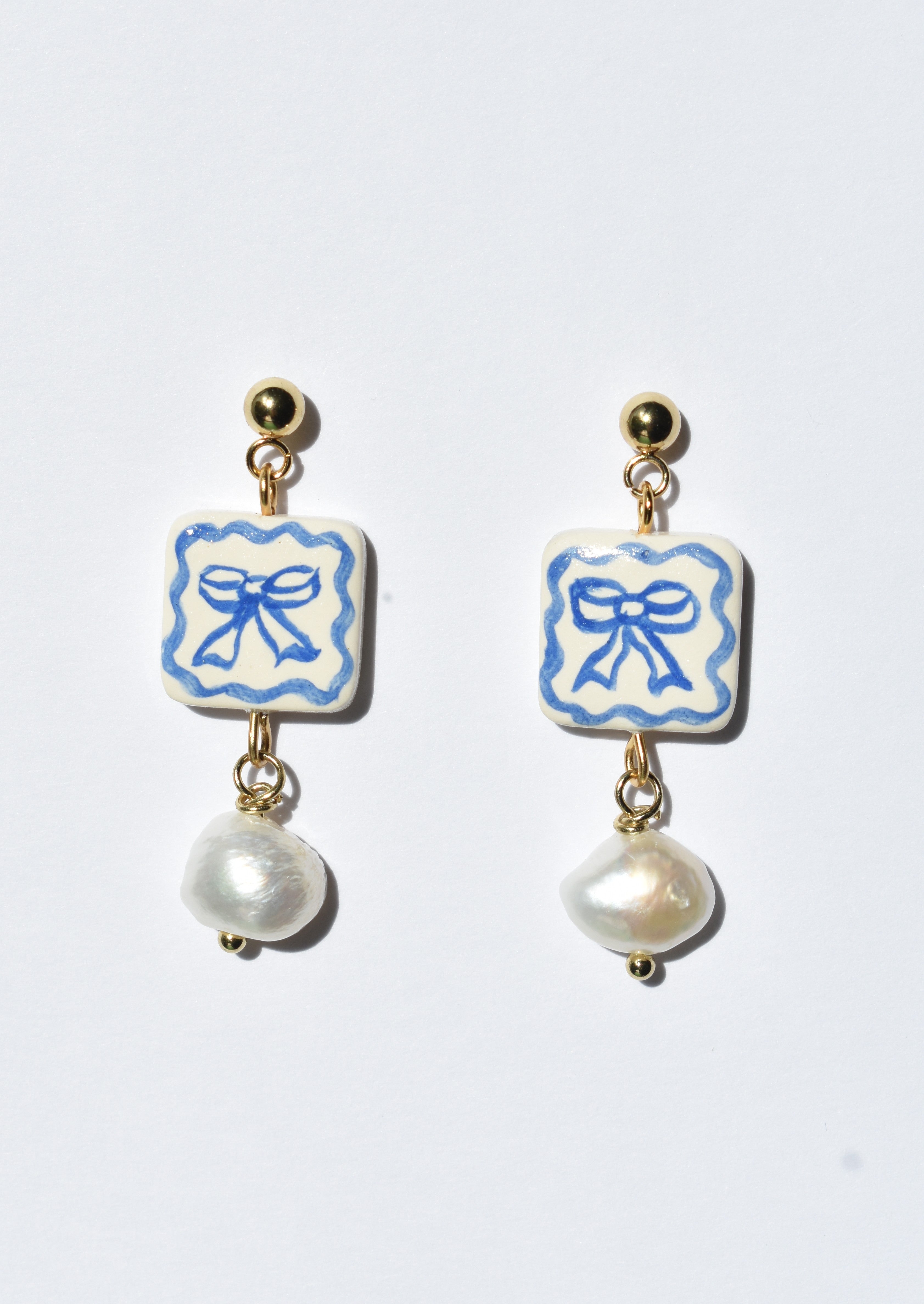 Handpainted bow earrings with freshwater pearls. Attached to nickel free gold plated stainless