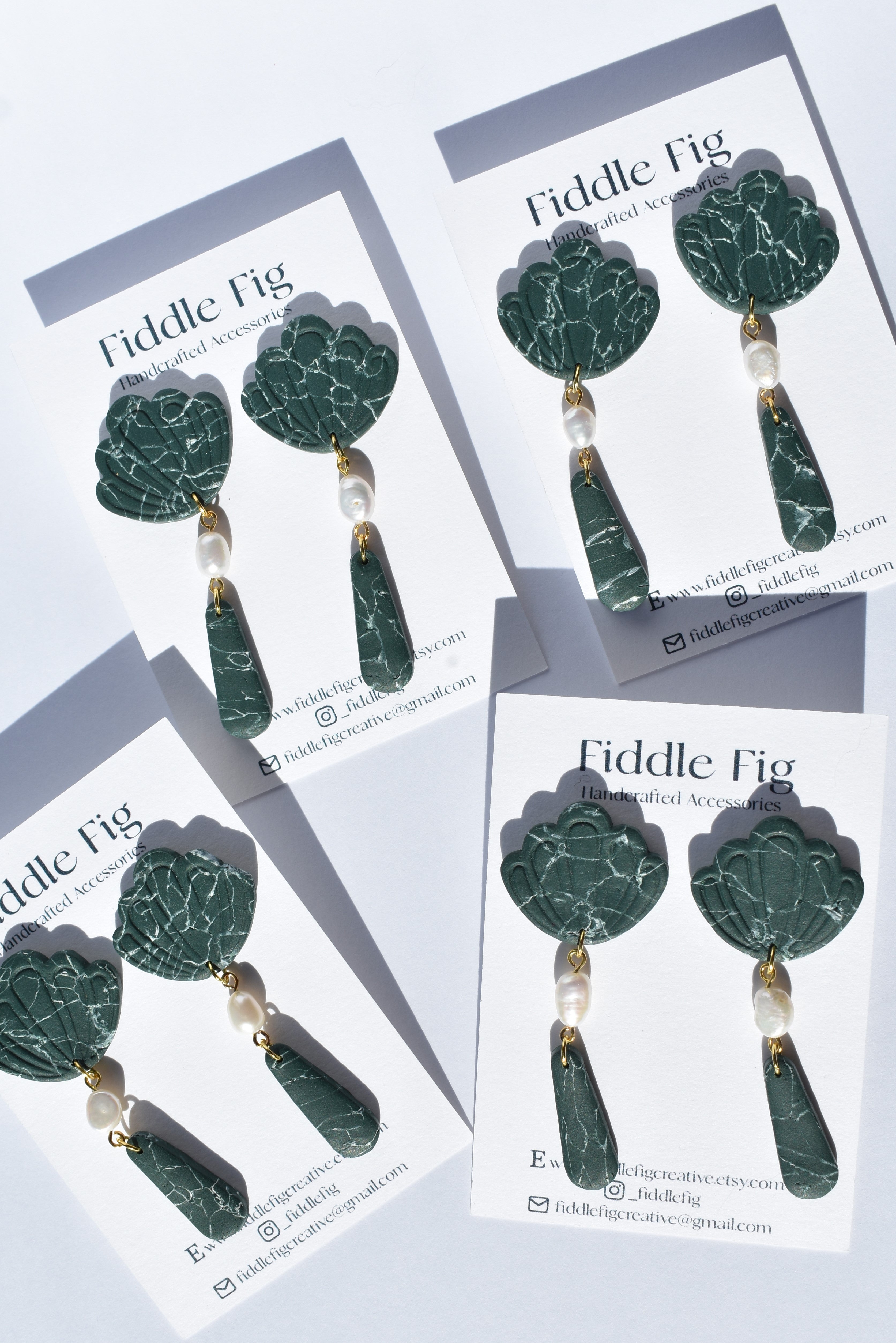 Green marble shell shaped earrings. Featuring freshwater pearls. With nickel free stainless steel posts with butterfly clasps