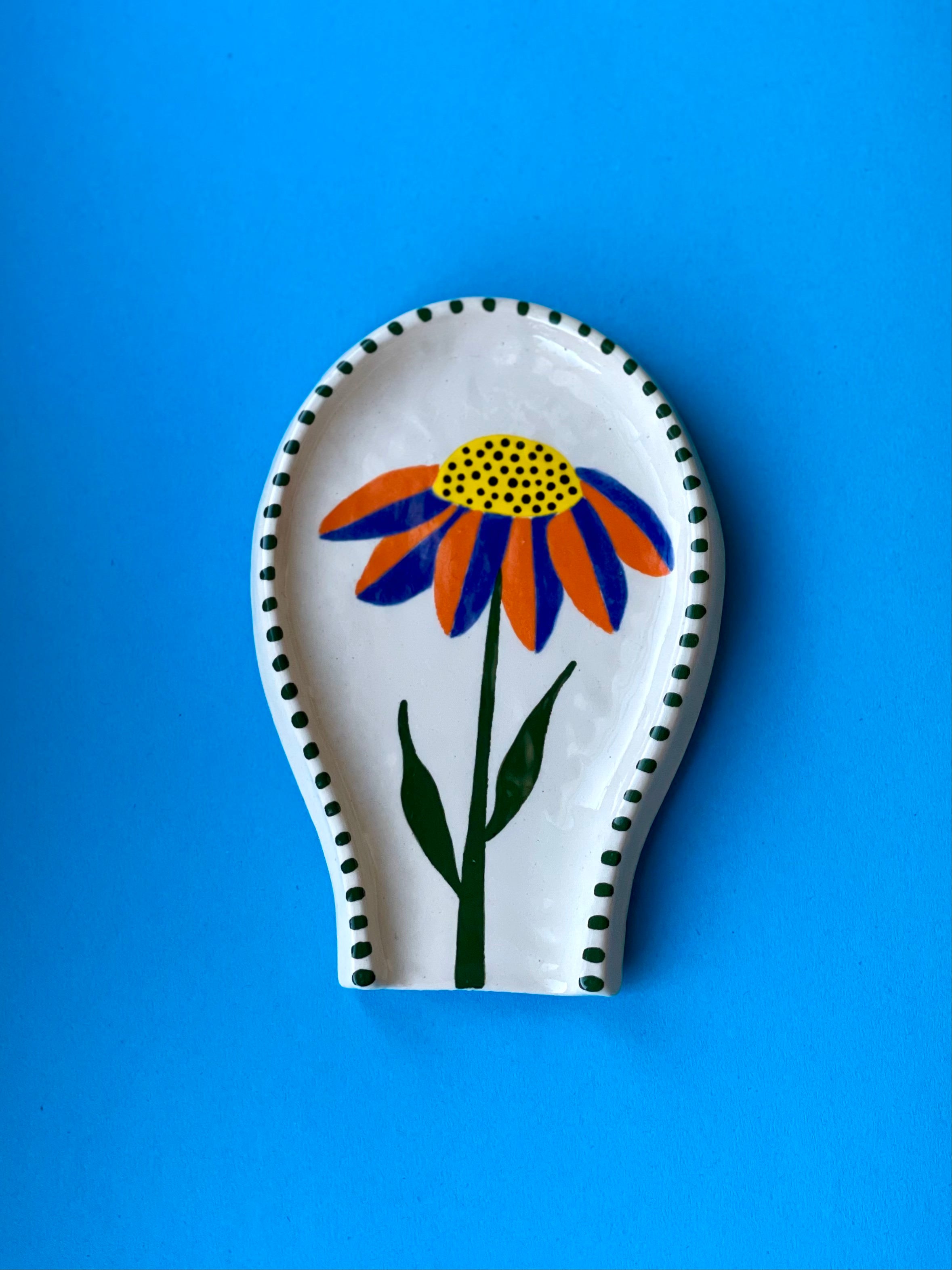 This spoon rest is handmade using a slab building technique in white stoneware clay. The ecinachea flower is hand painted with underglaze, finished with a transparent glaze. Dimensions: W9cm x L14cm