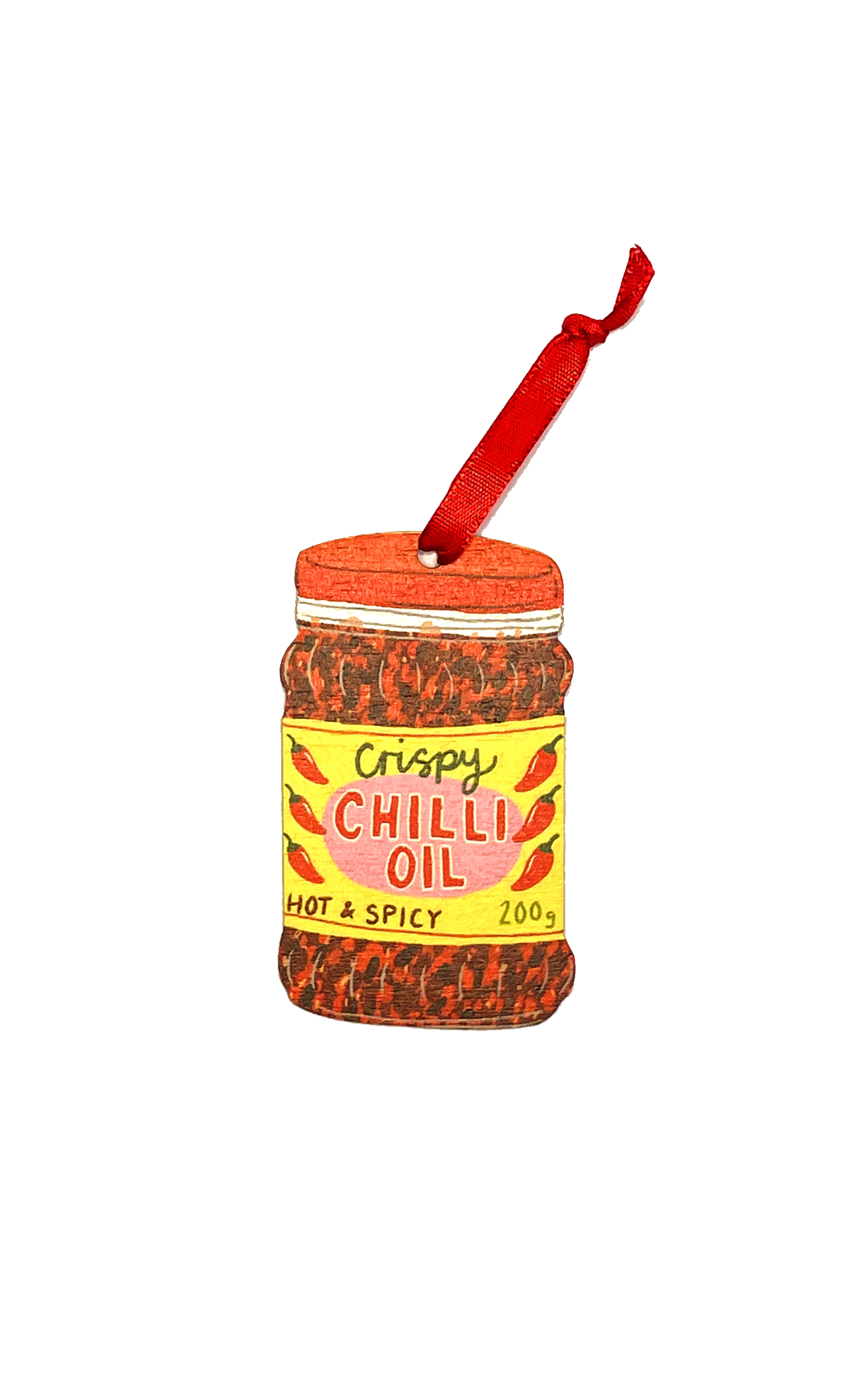 Crispy Chilli Oil Decoration. A colourful, illustrated wooden tree decoration, perfect for foodies and anyone who likes to put chilli oil on everything. This lightweight wooden decoration works perfectly sent as a small gift in a card or attached to a pressie as a gift tag. UV printed on one side and laser cut in the UK using wood from sustainable sources. Comes with a ribbon ready to hang and a branded swing tag.  Pair with one of the other foodie decrations for a cute set.