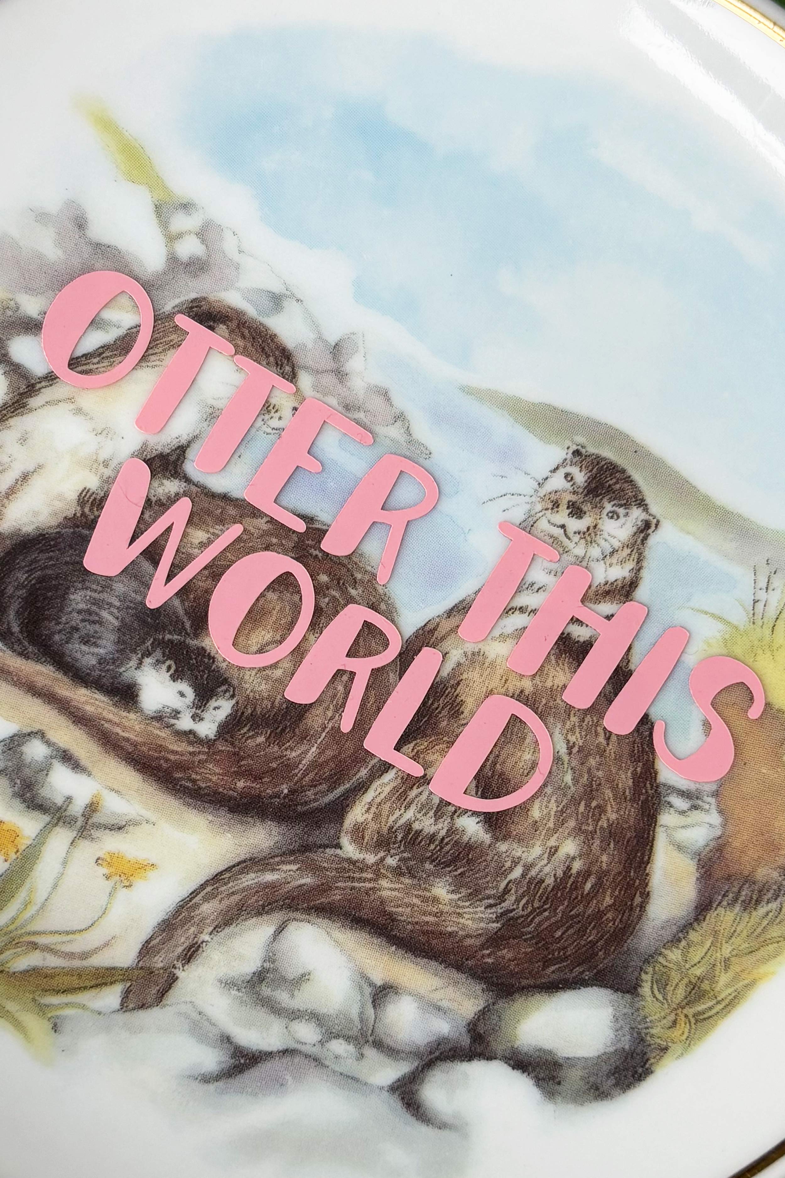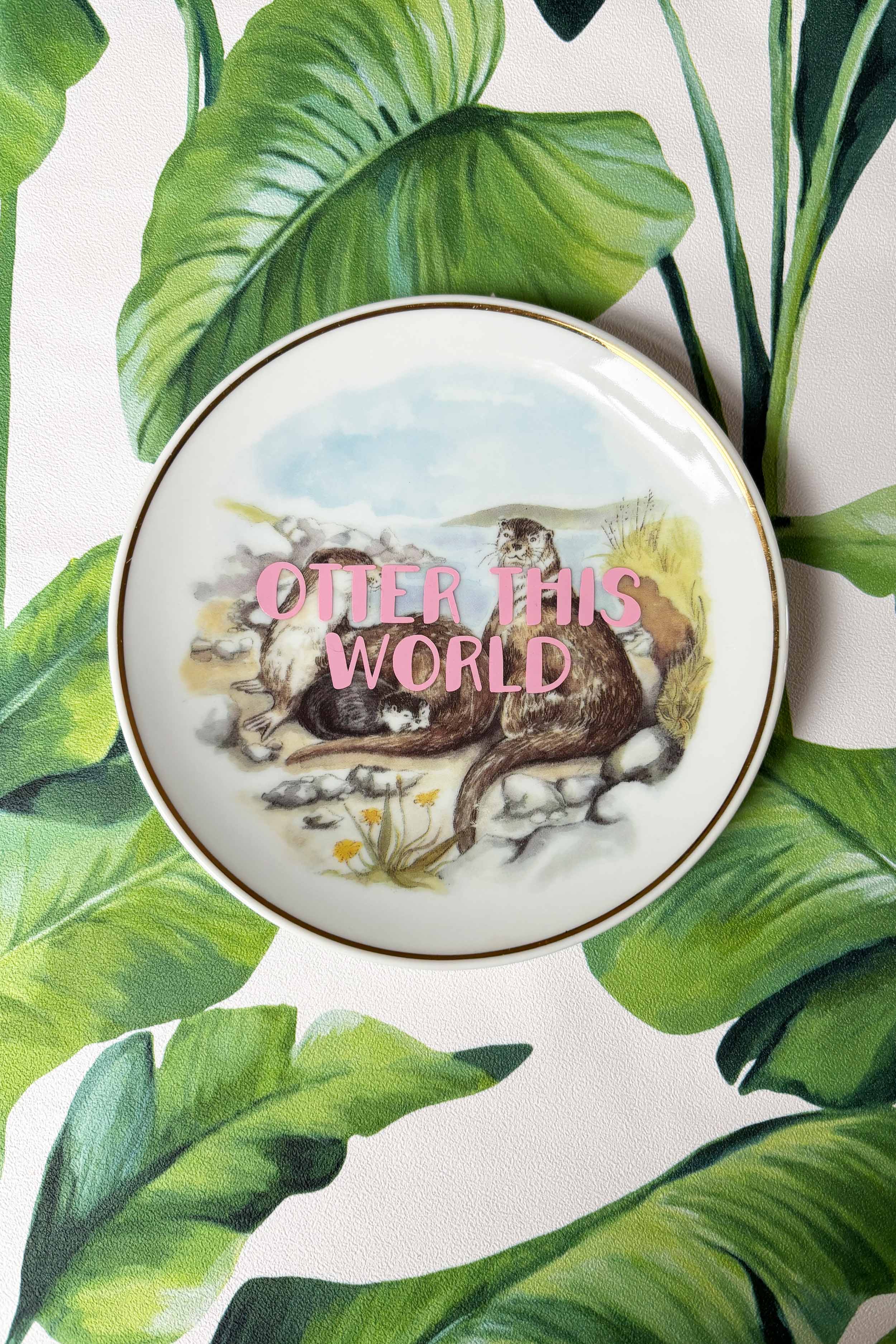 This preloved ceramic plate has been given a new lease of life by adding a fun otter related pun in Pink vinyl. The plate size is approx. 15cm x 15cm and is decorative use only not for food use. It can be hung on the wall in a No.1 sized hanger or placed in a small plate stand which is also available to purchase.