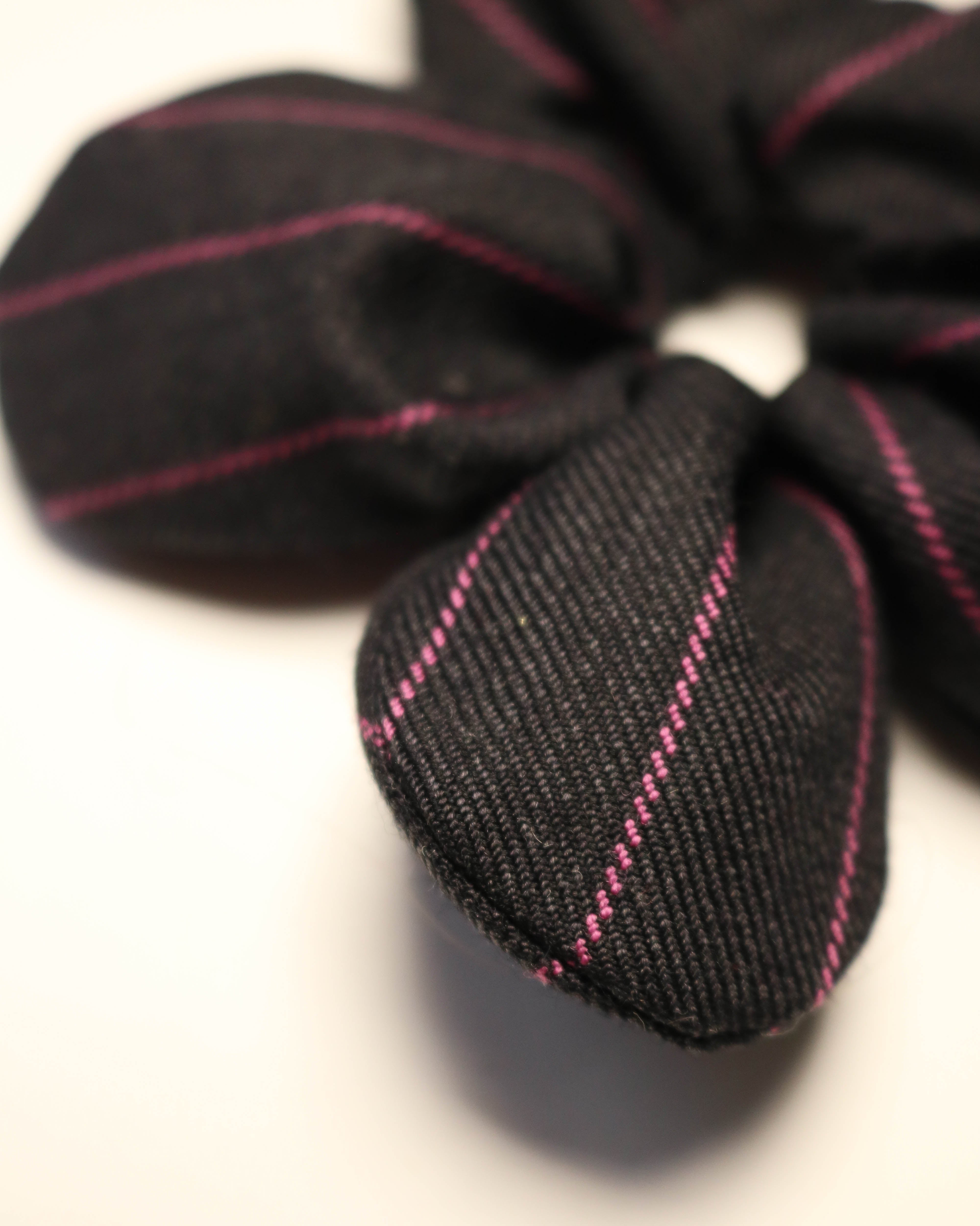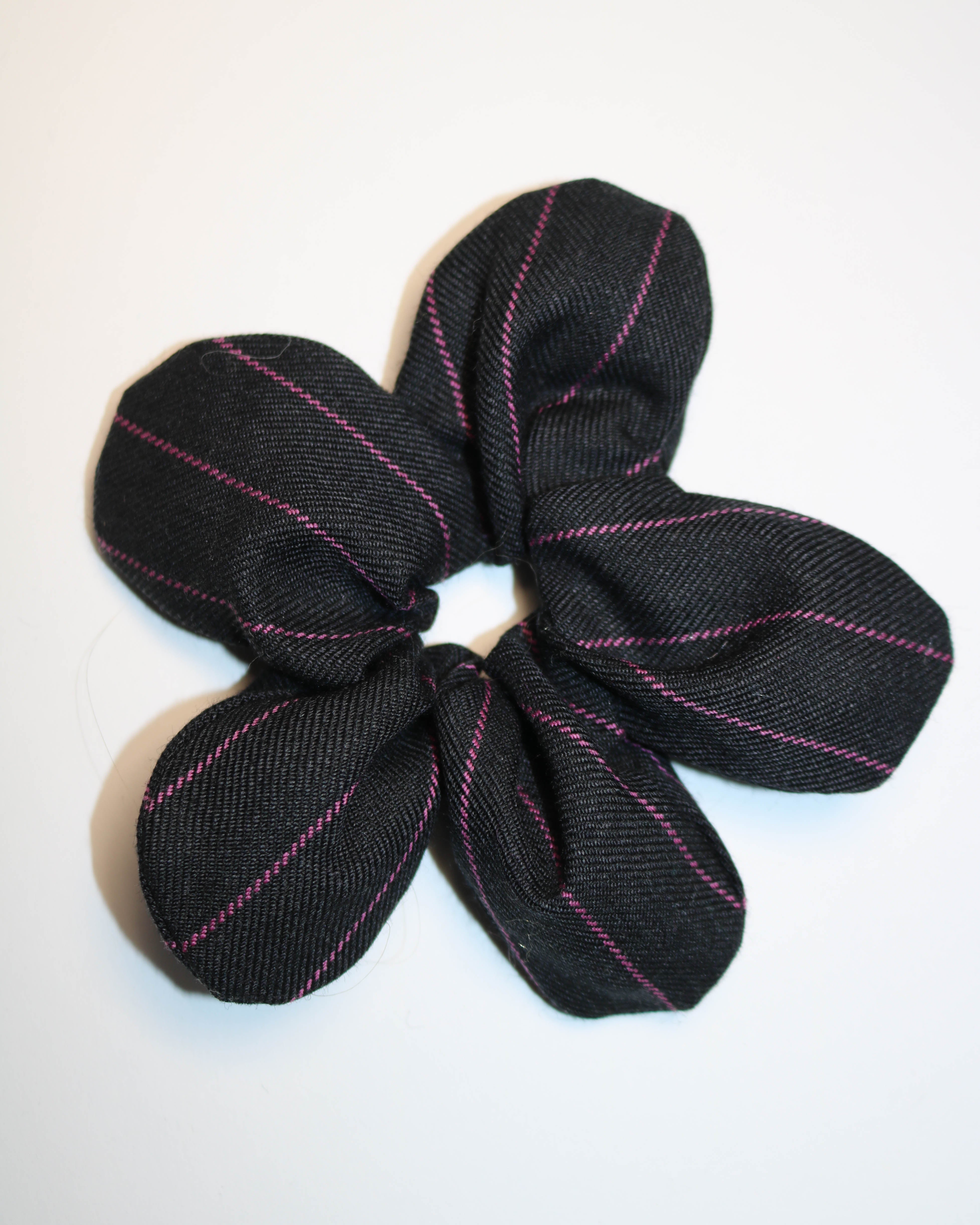 A playful hair accessory in sleek black with a pink pinstripe, which feels light and comfortable when worn. Lightly stuffed to hold its flower shape, with strong elastic for durability.