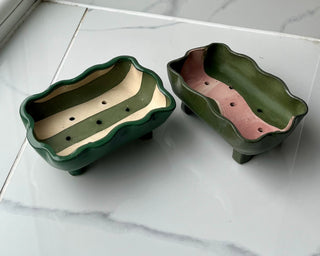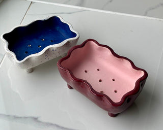 Hannah Inskip creates colourful, chubby ceramics designed to bring a bit of joy to everyday life. Each piece is handmade in small batches using white stoneware clay. Some are thrown on the wheel into wavy-shaped tableware, while others are stained with coloured pigments and rolled out into slabbed dishes, finished with her signature wavy rim. Hannah’s work blends functionality and ergonomic design with bold colours, textures and fun prints.