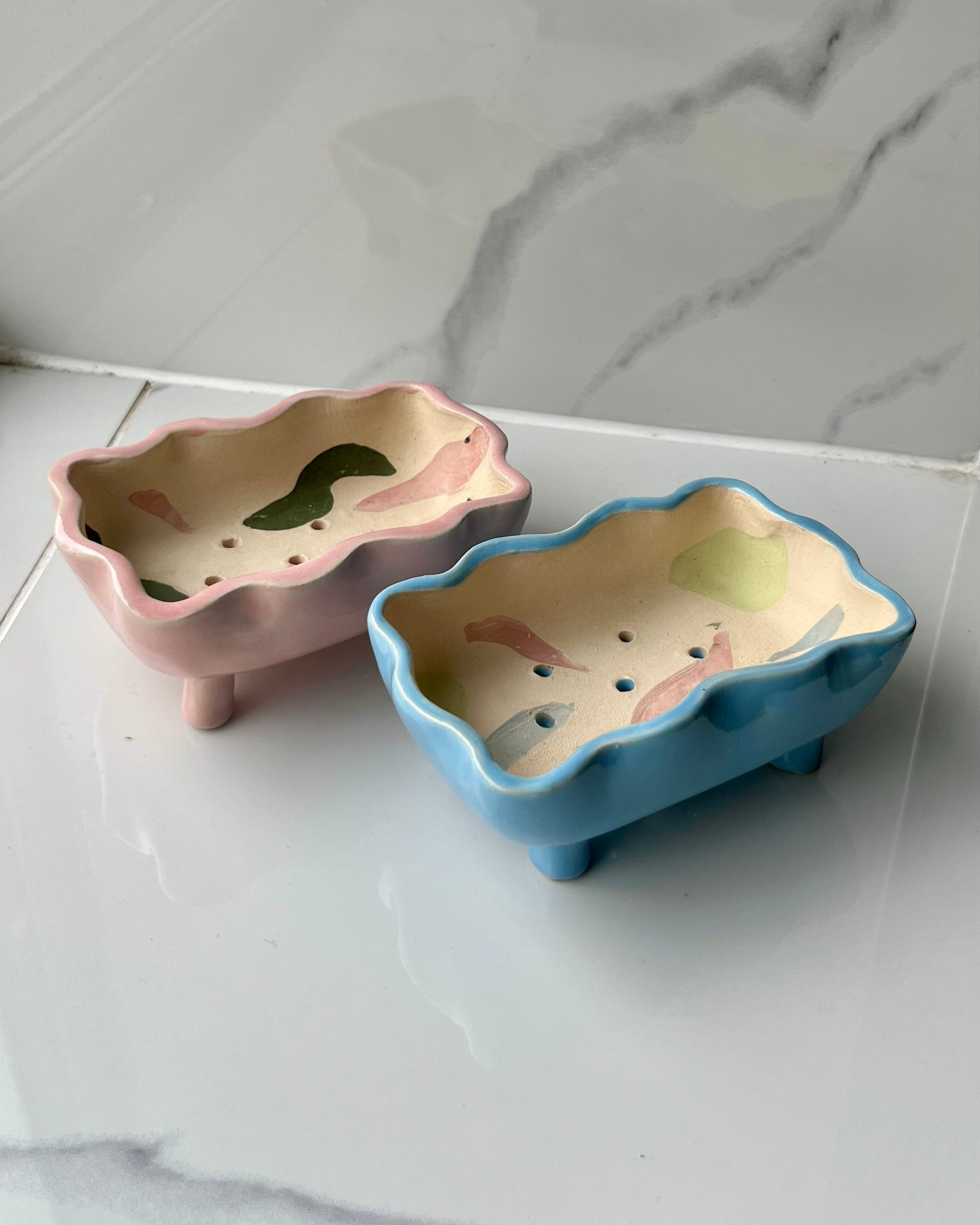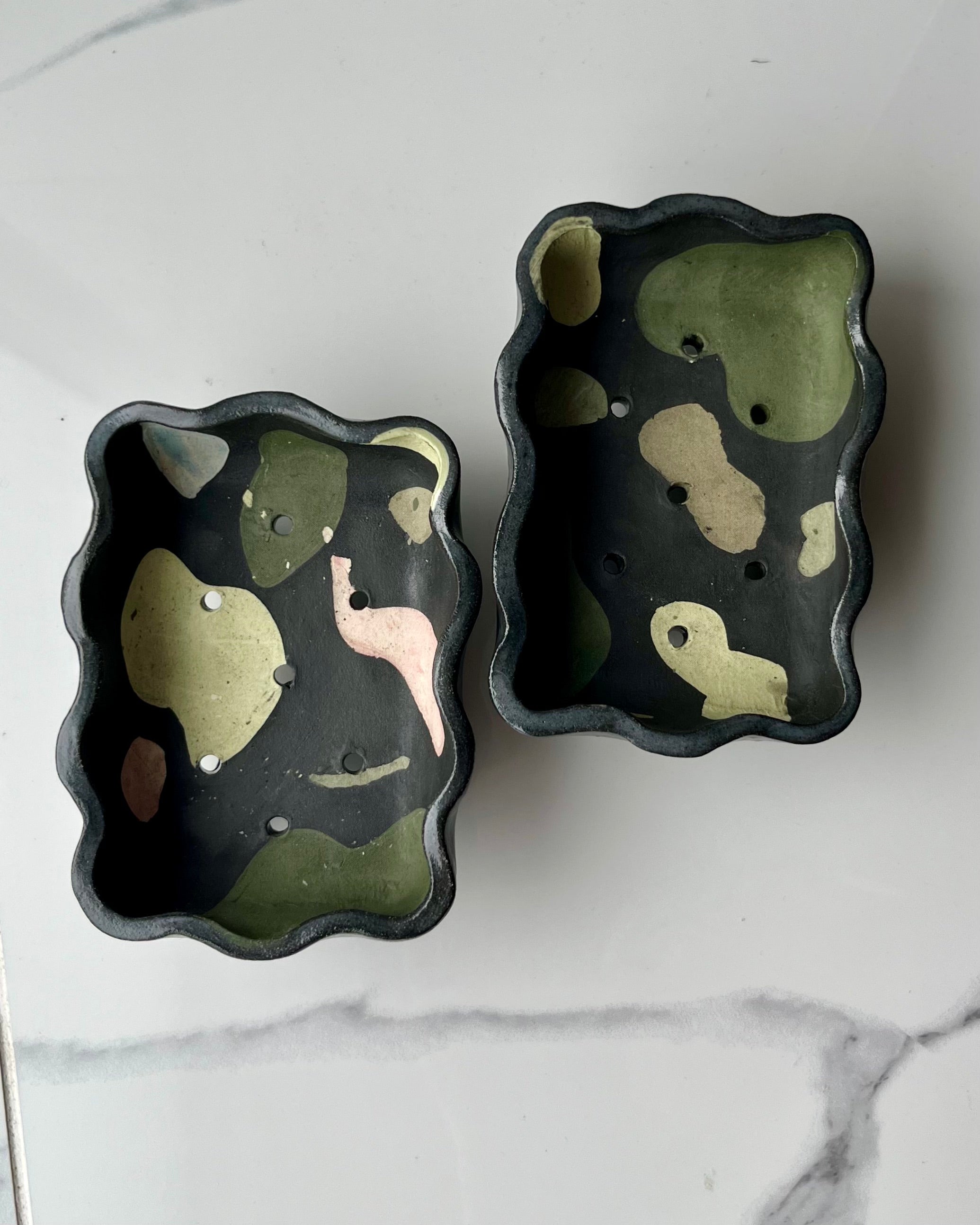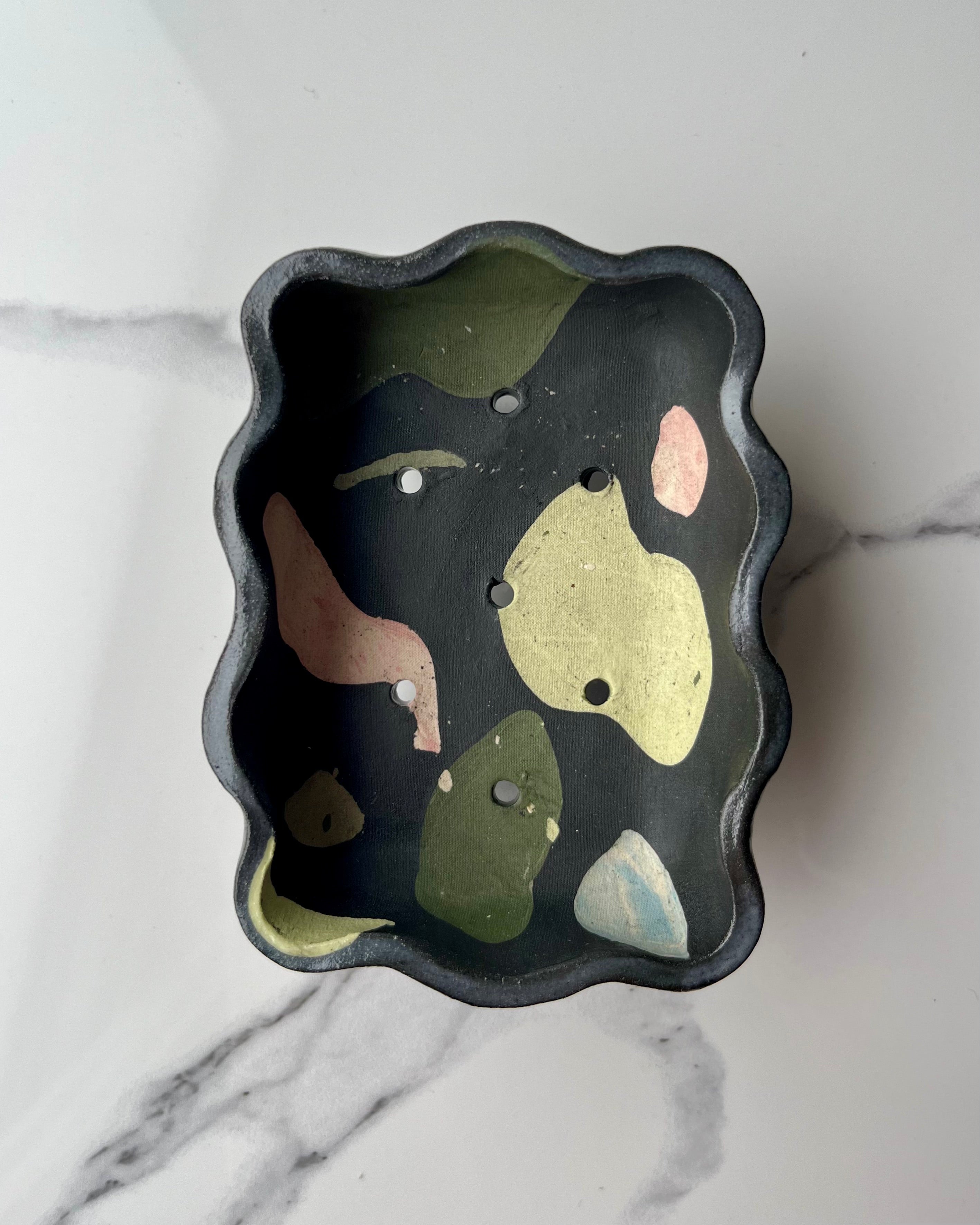 Handmade in London from stoneware clay and decorated with hand-cut shapes in colourful stained clays. Designed with small feet to keep it raised and drainage holes to let water flow through. The surface where the soap rests is left unglazed to absorb a little moisture and help keep your soap firm between uses. Finished with a smooth, durable glaze and softly wavy rim.