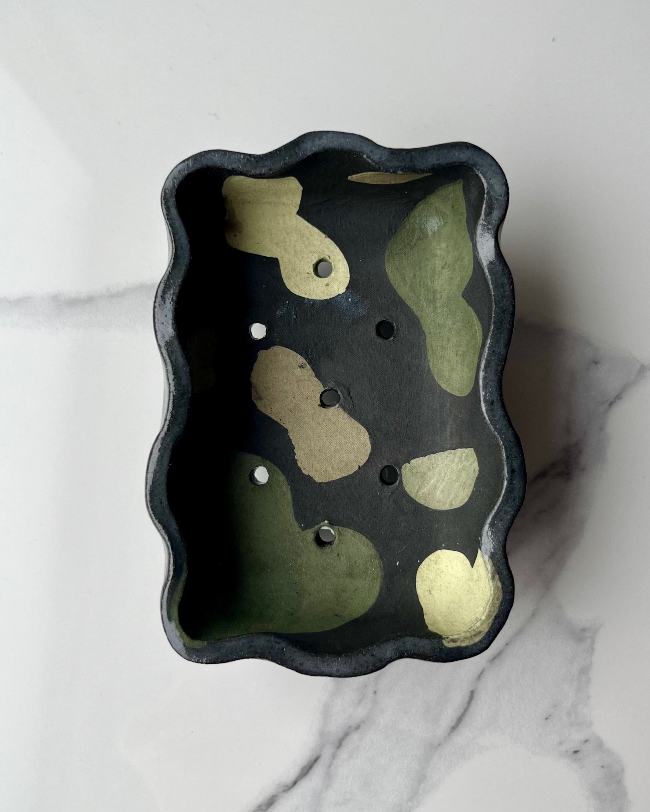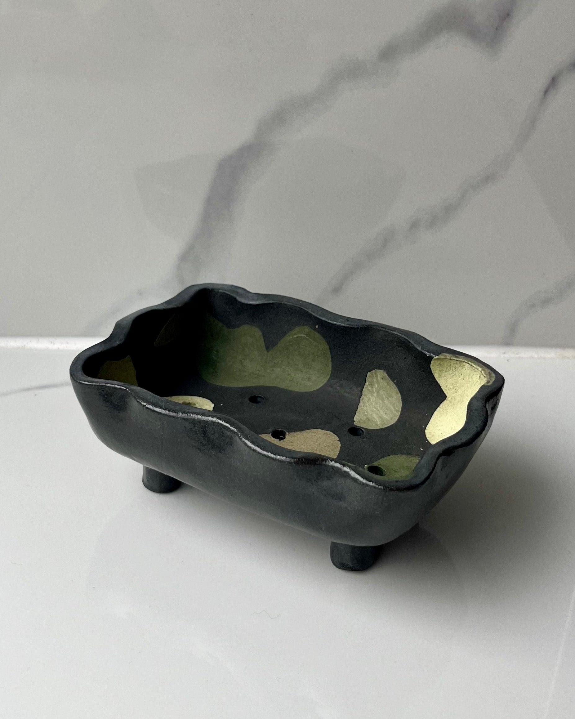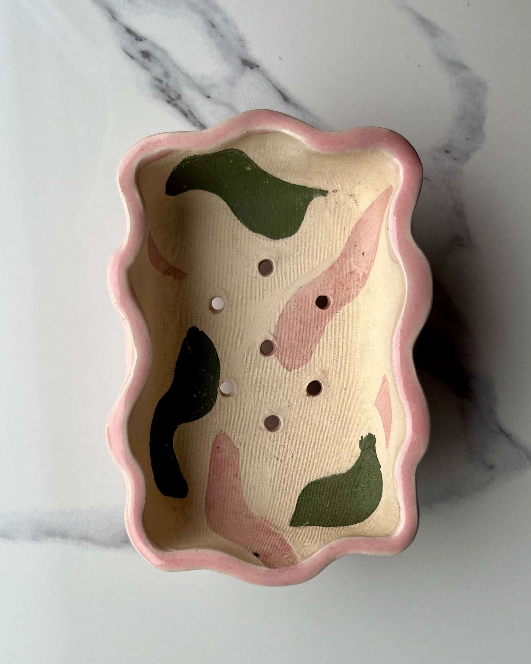Handmade in London from stoneware clay and decorated with hand-cut shapes in colourful stained clays. Designed with small feet to keep it raised and drainage holes to let water flow through. The surface where the soap rests is left unglazed to absorb a little moisture and help keep your soap firm between uses. Finished with a smooth, durable glaze and softly wavy rim.
