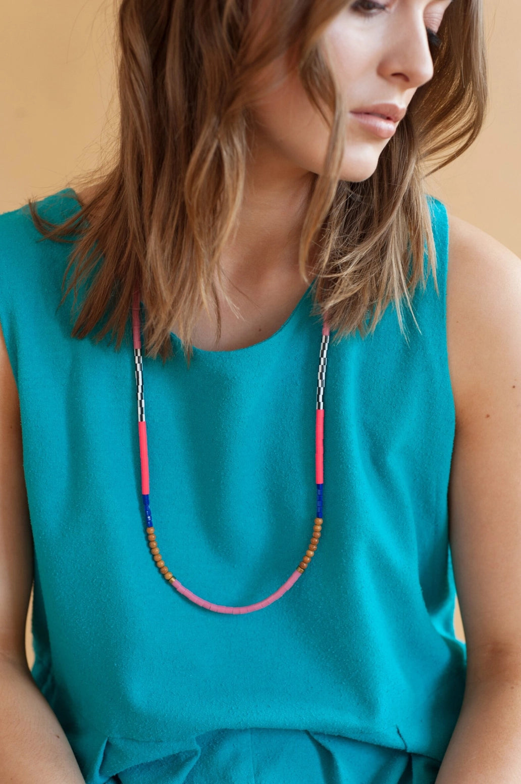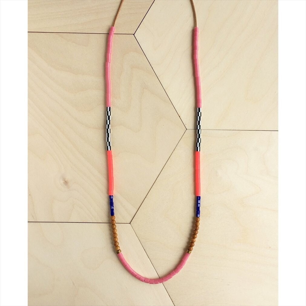 pink and black and white stripe acrylic beads, with wooden accent beads and glass cobalt beads. On a leather cord. Length 81cm.
