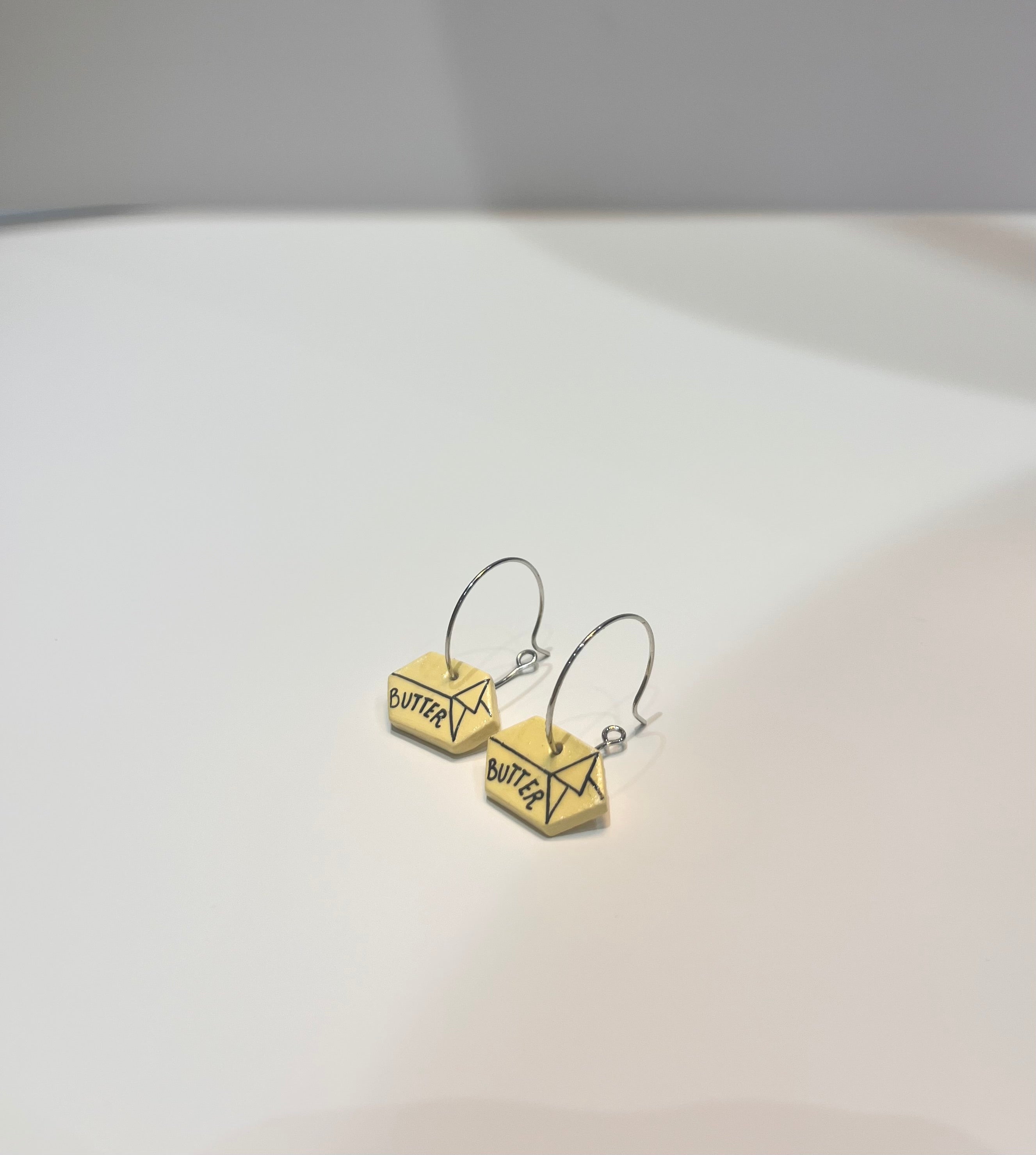 Miniature clay charms on thin hoop earrings, handmade from start to finish from my studio in Salford. The charms are painted and varnished on all sides, including on the backs. This means that they are fully protected from any weather damage, but please try not to wear them in the shower/bath/sea swimming! The earring hoops are stainless steel.