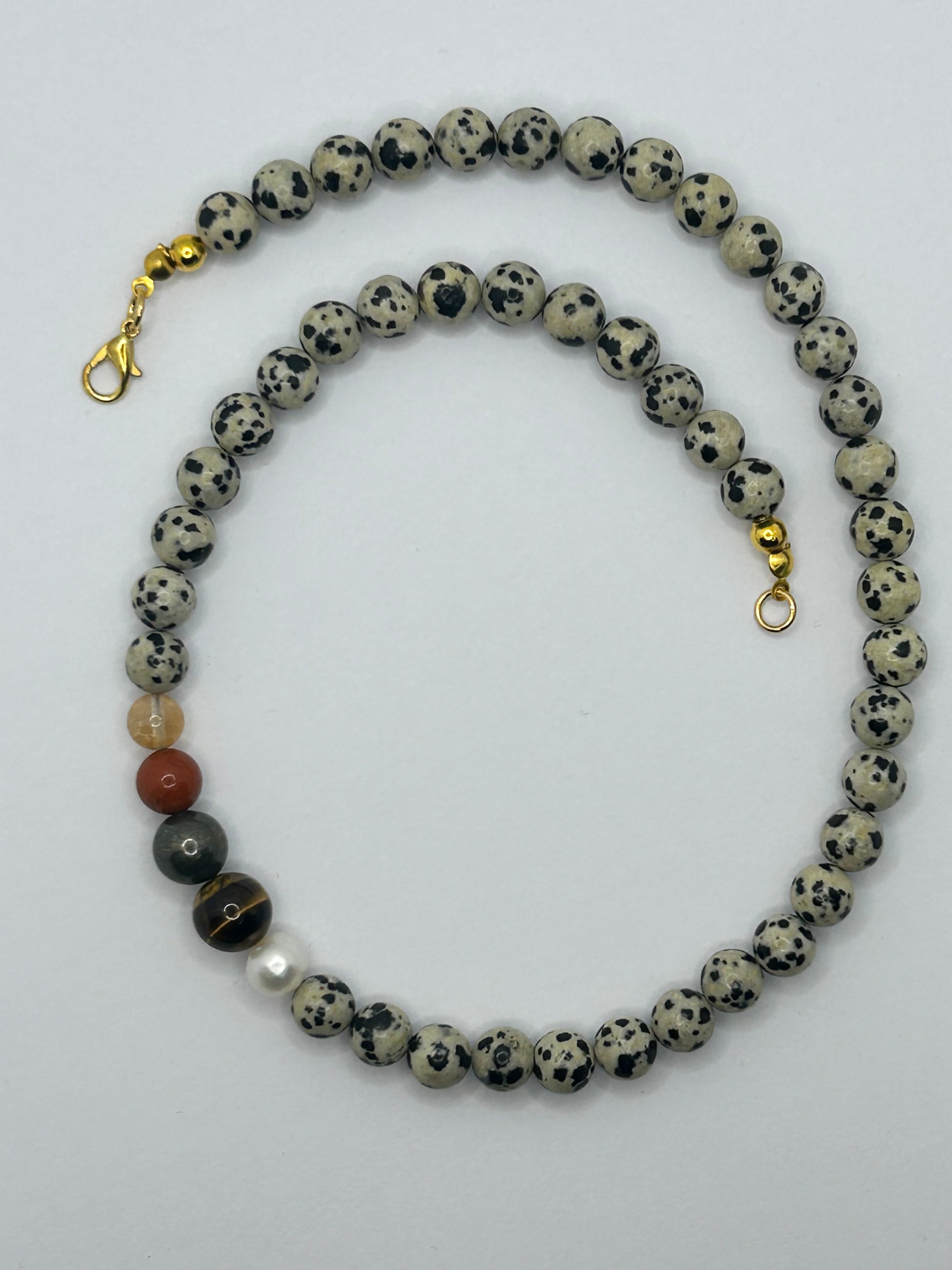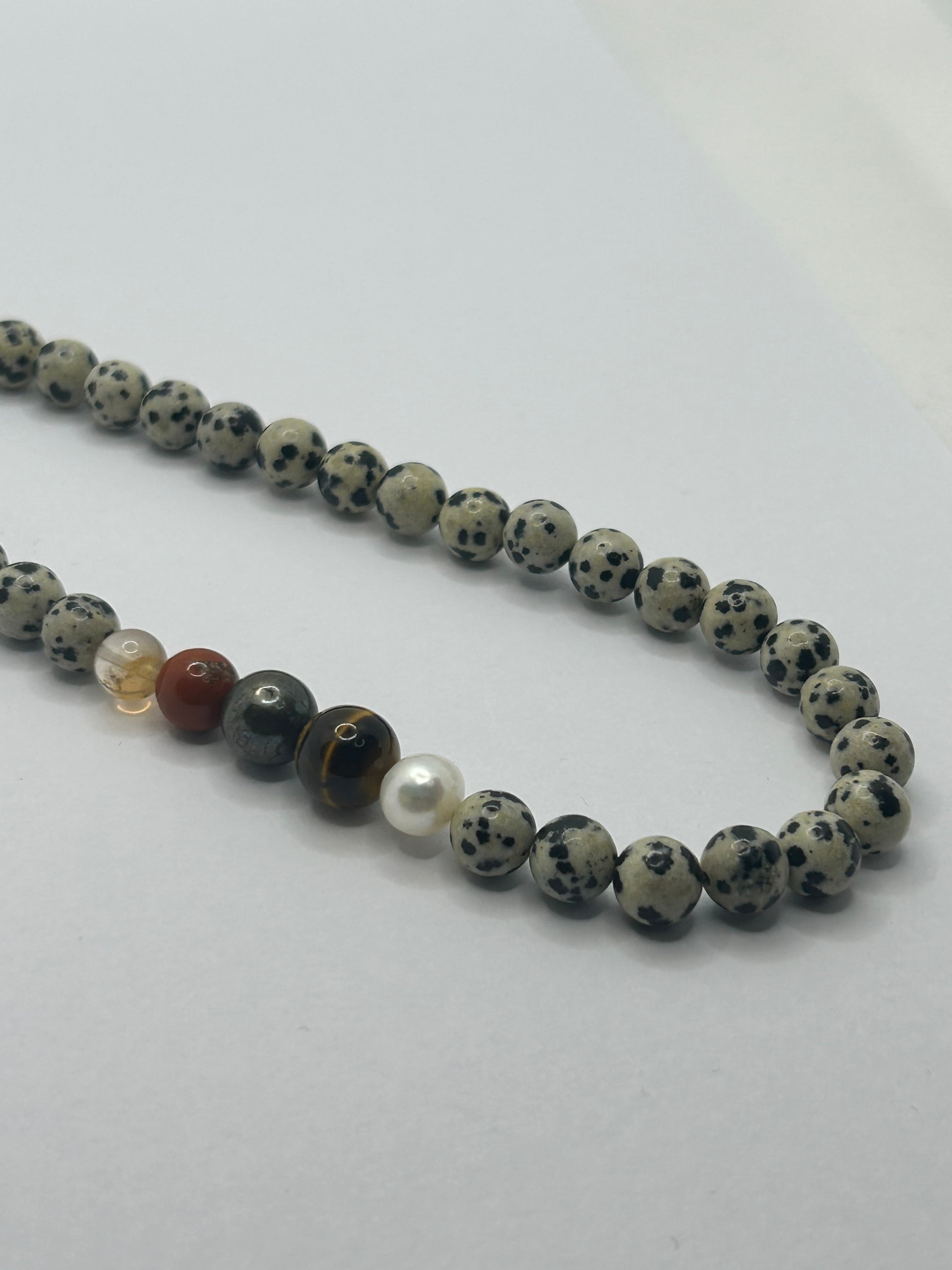 Dalmation Jasper Necklace with Mixed Gemstones: Citrine, Red Jasper, Pyrite, Tigers Eye & Pearl.