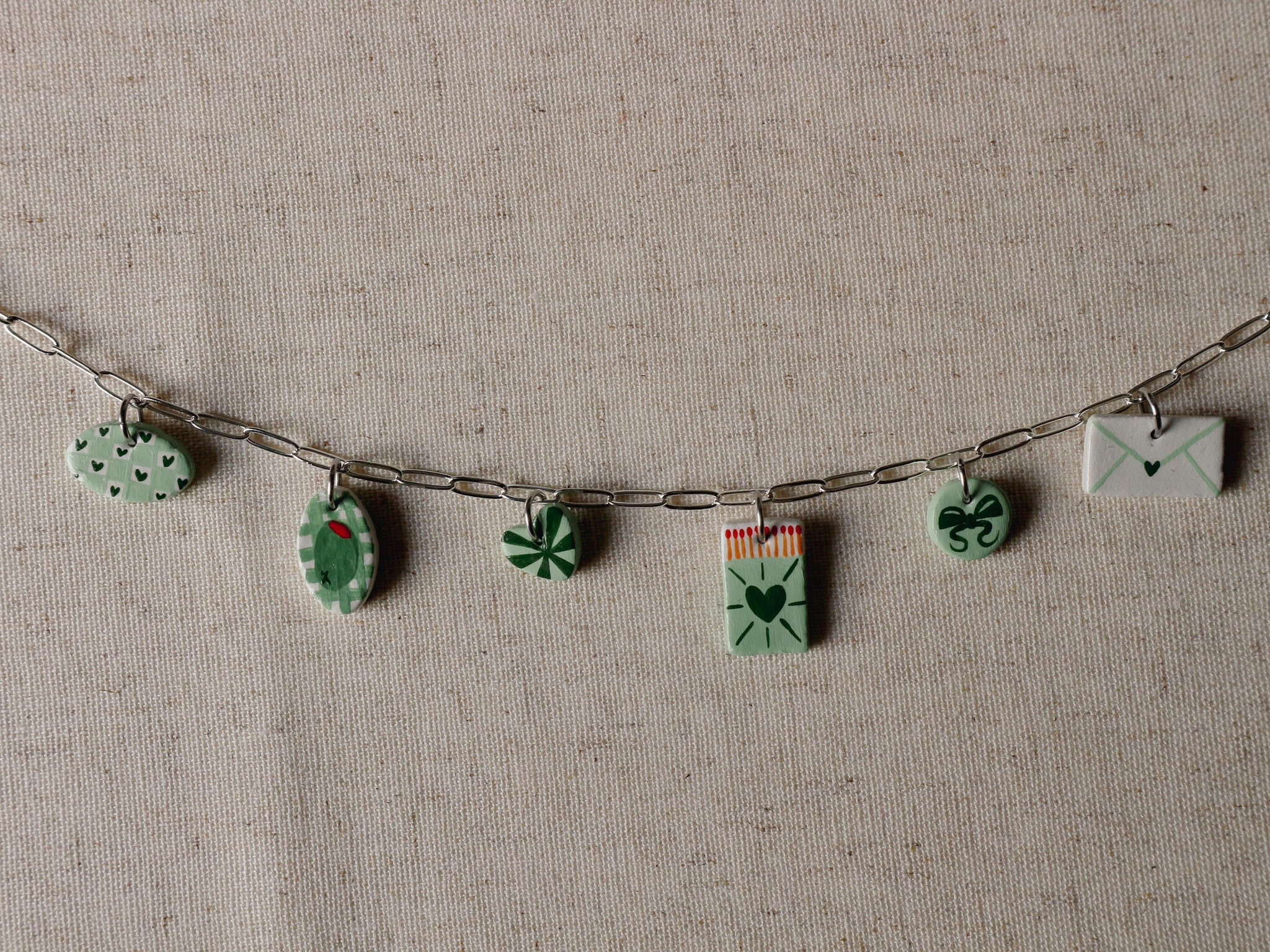 Tiny clay charms, handmade from start to finish from my studio in Salford. The charms are painted and varnished on all sides, including on the backs. This means that they are fully protected from any weather damage, but please try not to wear them in the shower/bath/sea swimming! The necklace chains I use are tarnish free and waterproof, and come in silver.
