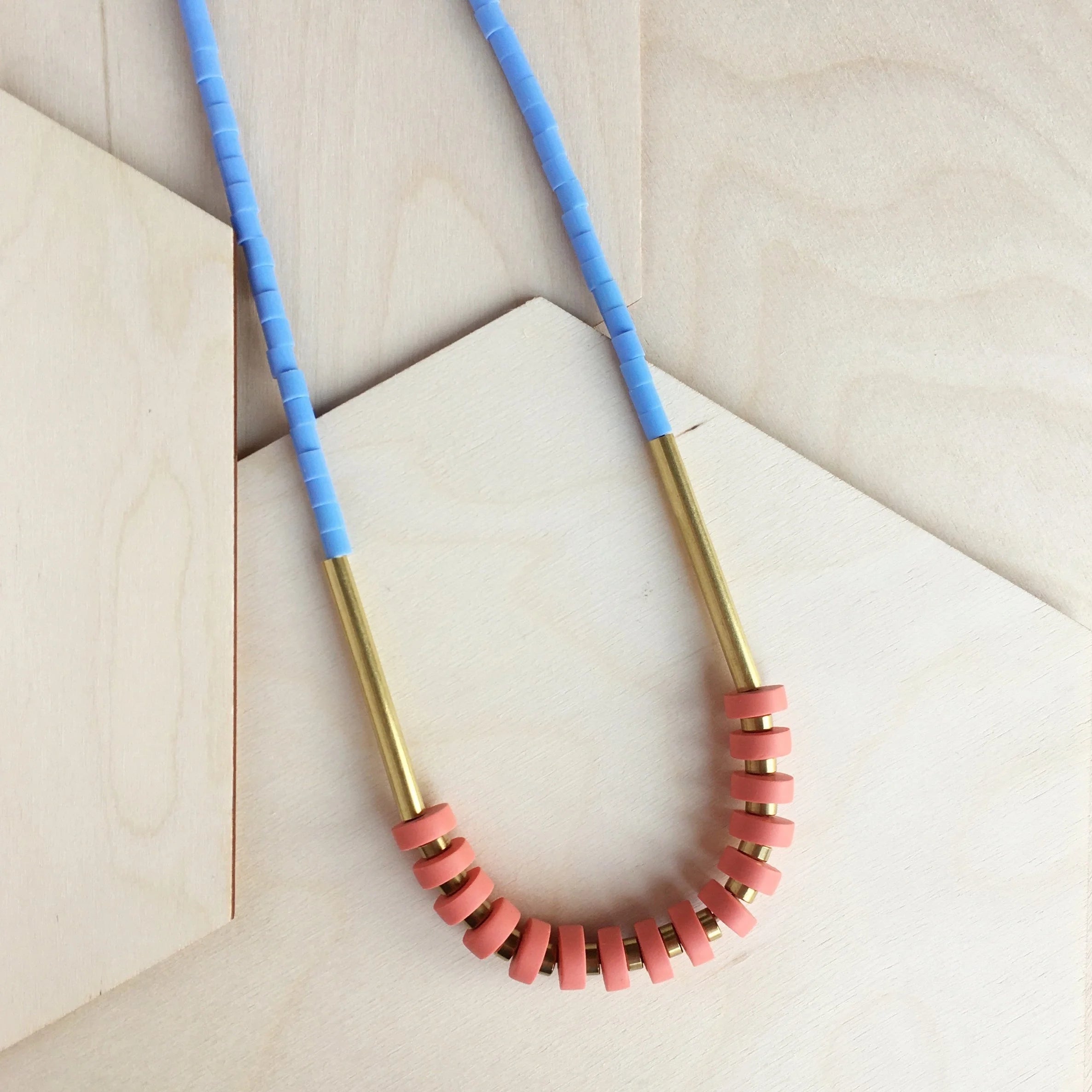 Polymer clay heishi beads with brass accent beads and a vivid lilac beaded cord.