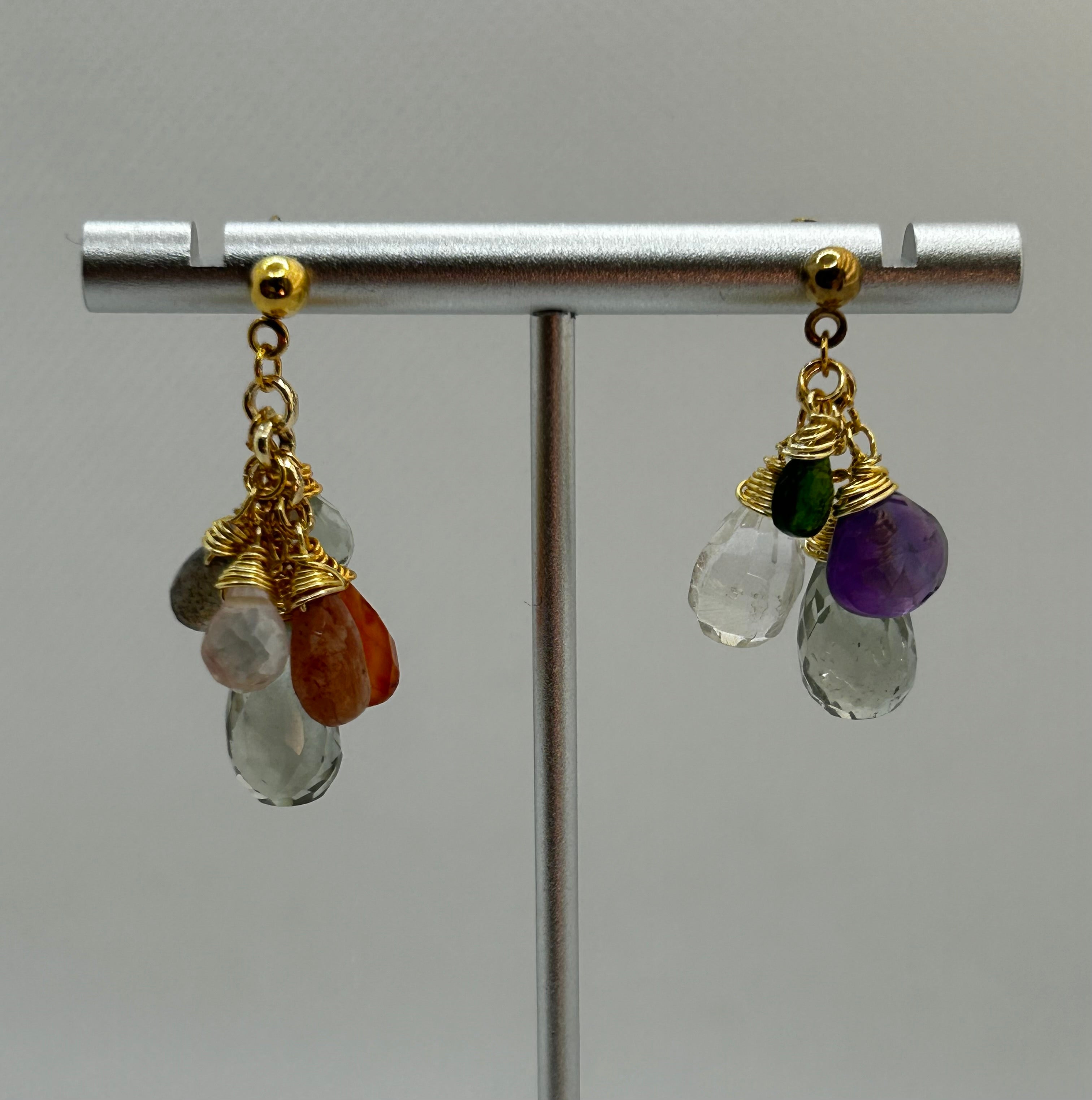 Mismatched Multi Gemstone Drops Earrings: Green Amethyst, Amethyst, Rose Quartz, Carnelian, Sunstone, Garnet & Labradorite.