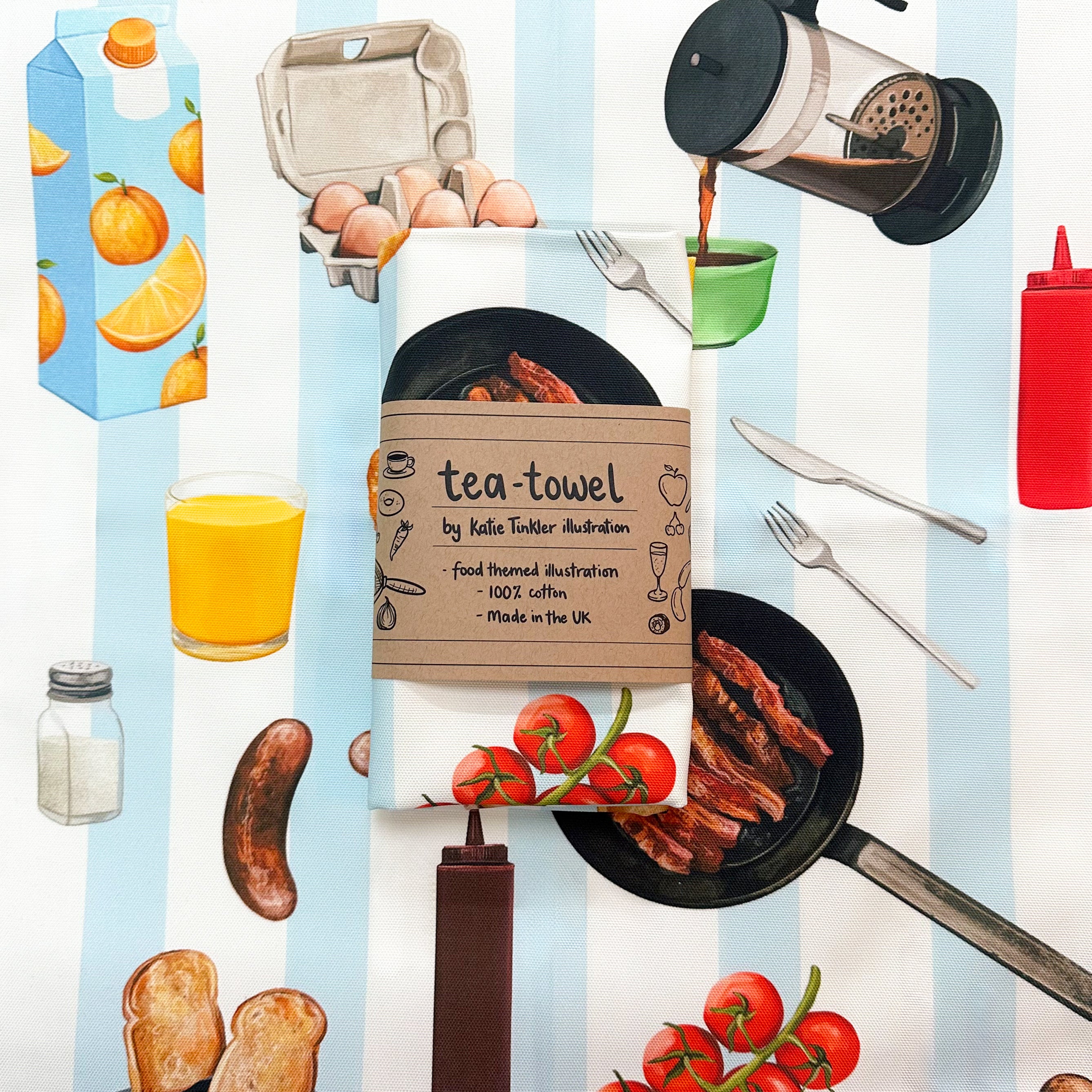 Breakfast themed tea towel on 100% cotton tea towel. Made in the UK