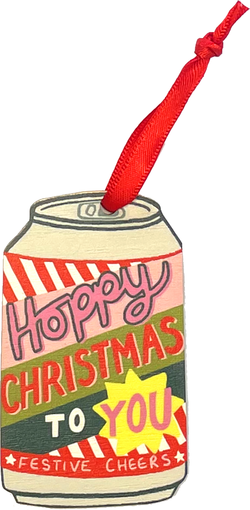 Craft Beer Can Christmas Decoration. A colourful, illustrated tree decoration, perfect for beer fans and pub enthusiasts. Bottle reads ‘Hoppy Christmas to you’.