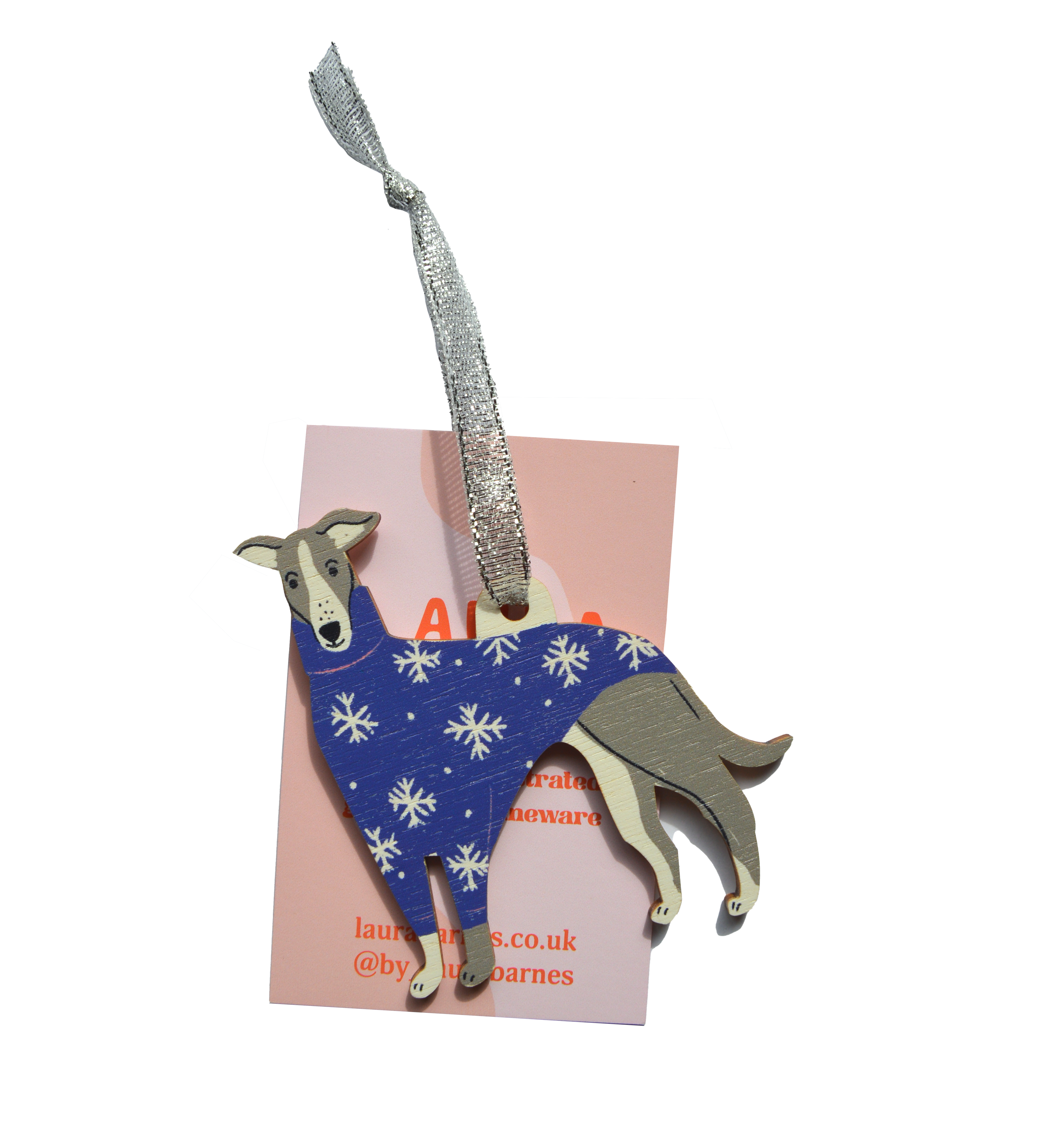 "This graceful Whippet decoration features a stylish winter coat and plenty of festive charm, perfect for sighthound lovers.