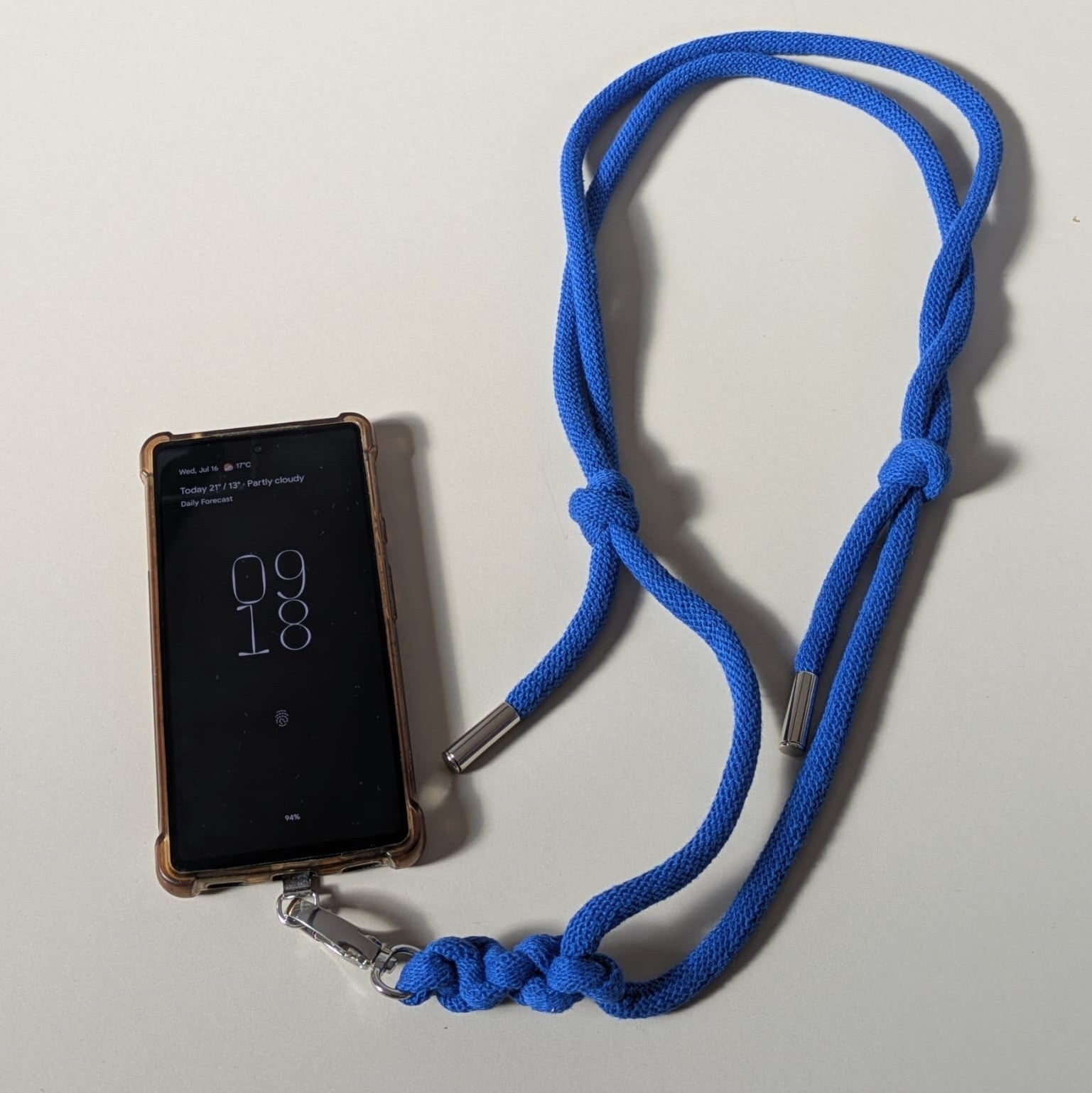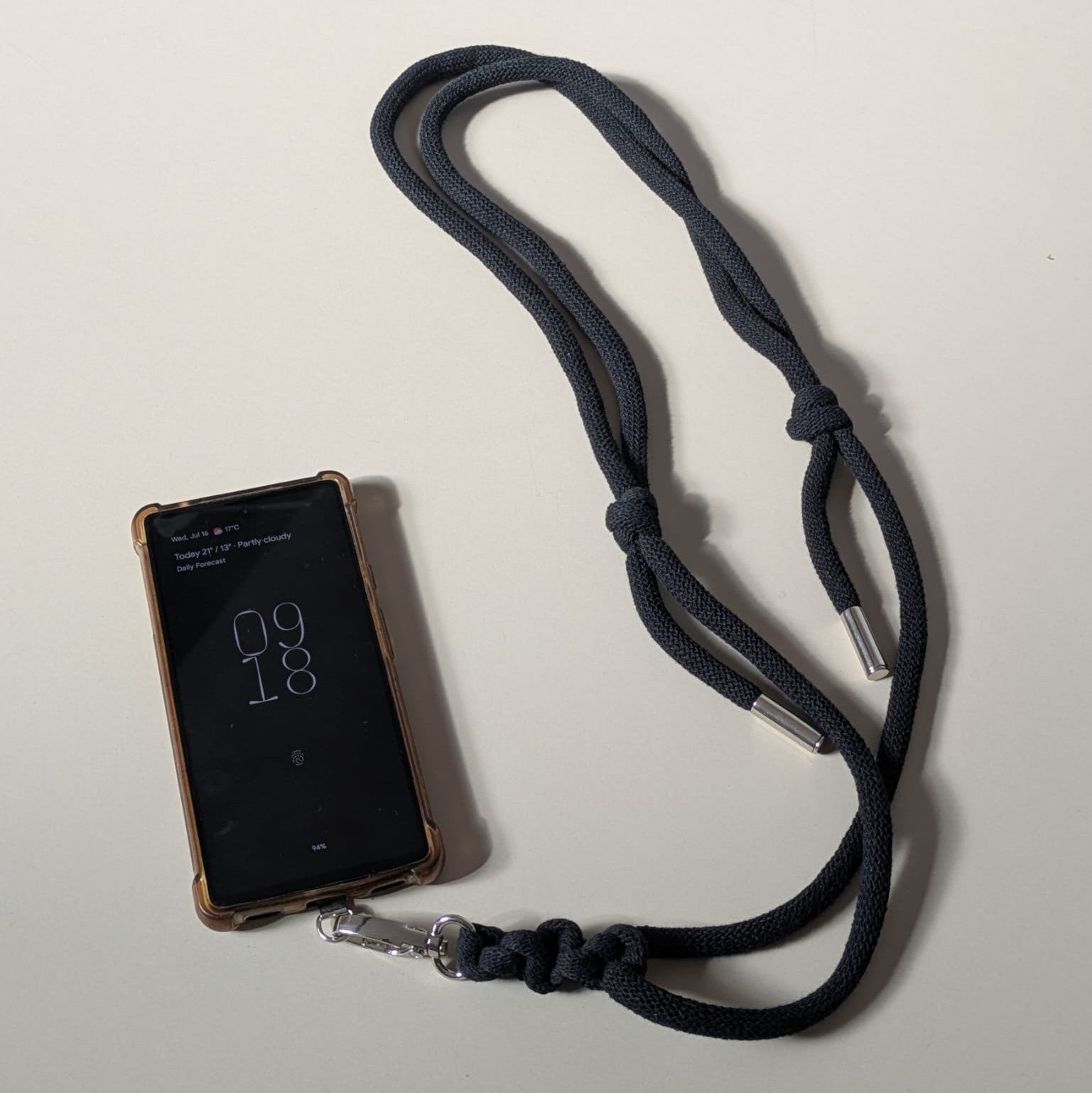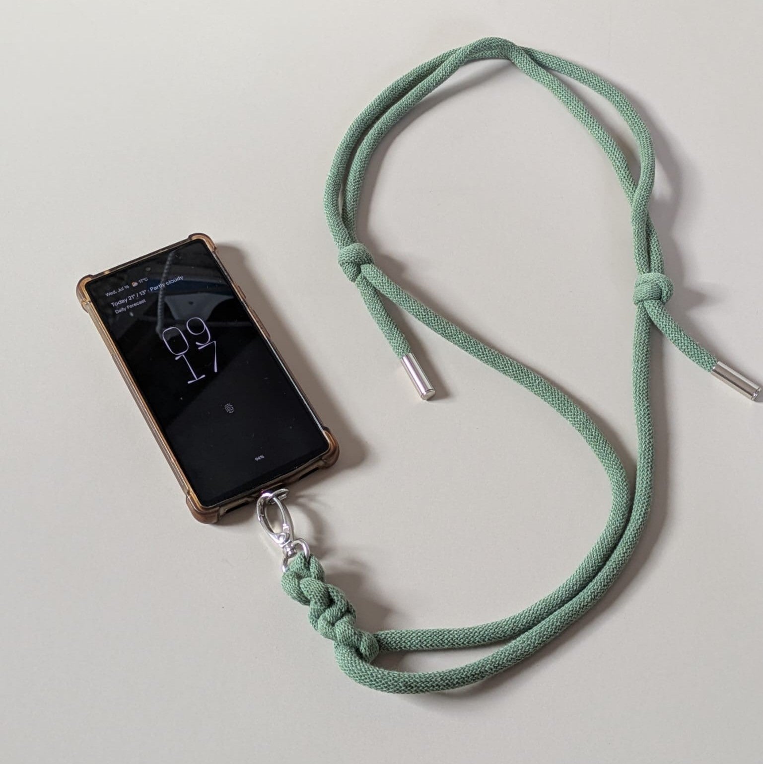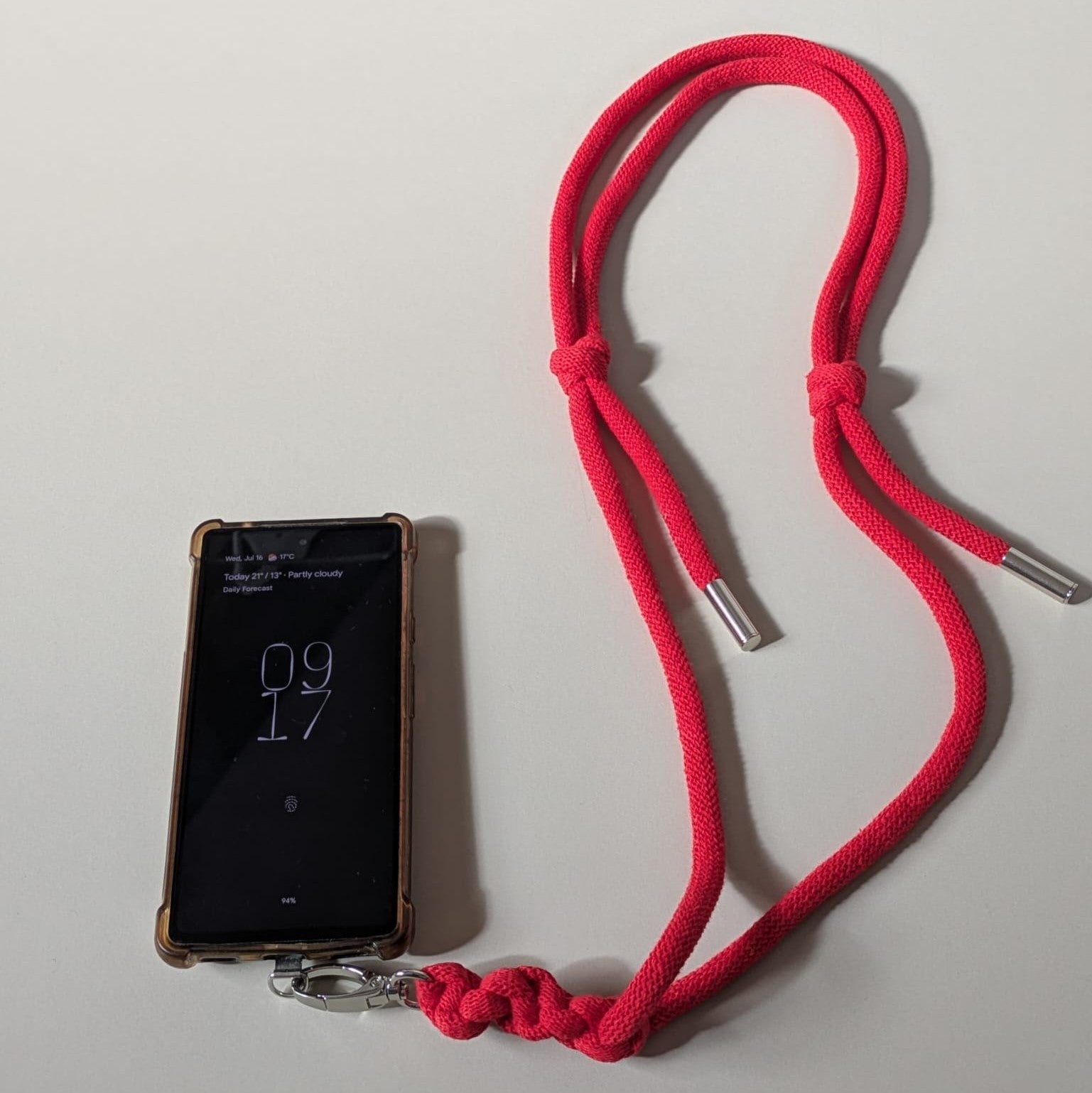 Made from the highest quality 9mm rope made from 100% recycled cotton and featuring chunky silver tone carabiner clip and hardware. Each strap comes with a black fabric phone tether tab which slots easily between your phone and phone case. The strap can be fully adjusted, allowing you to wear the strap as a shorter lanyard style or as a crossbody strap. To adjust the length simply slide the two knots evenly until the strap is at the desired length. When laid flat at the shortest length the strap measures approximately 46cm and 86cm at the longest length.