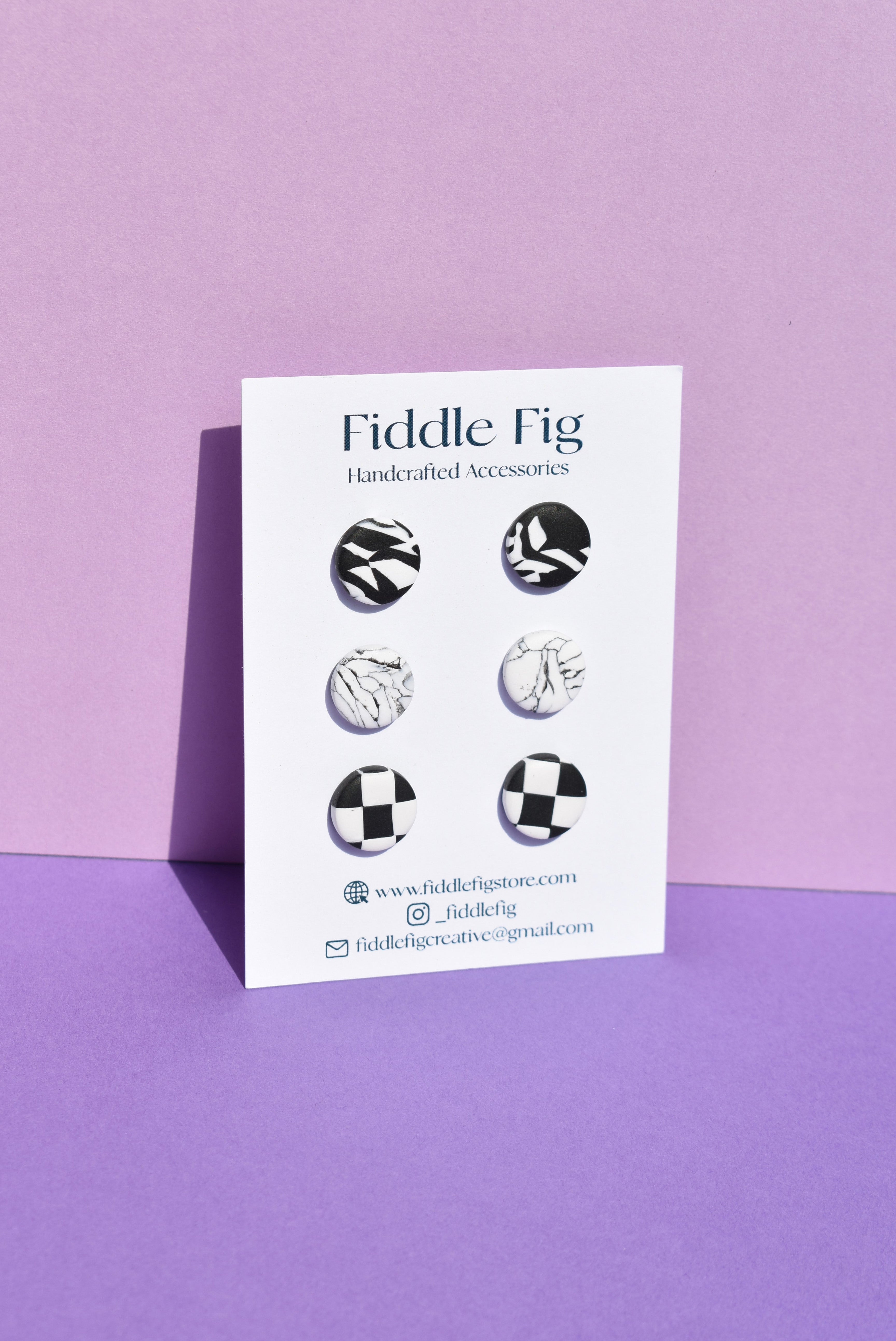 Set of three pairs of black and white stud earrings. Attached to nickel free stainless steel posts. Handmade using polymer clay.
