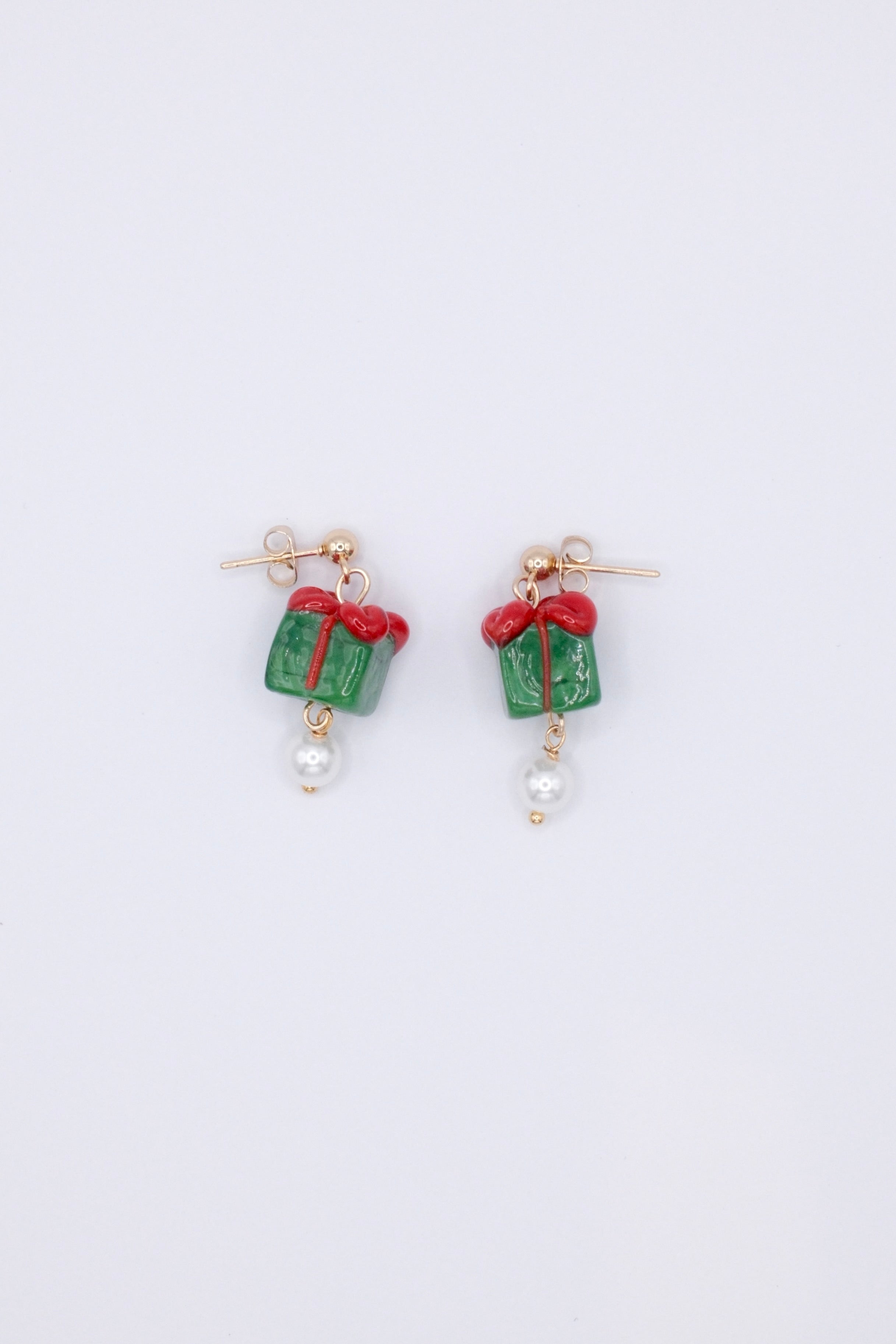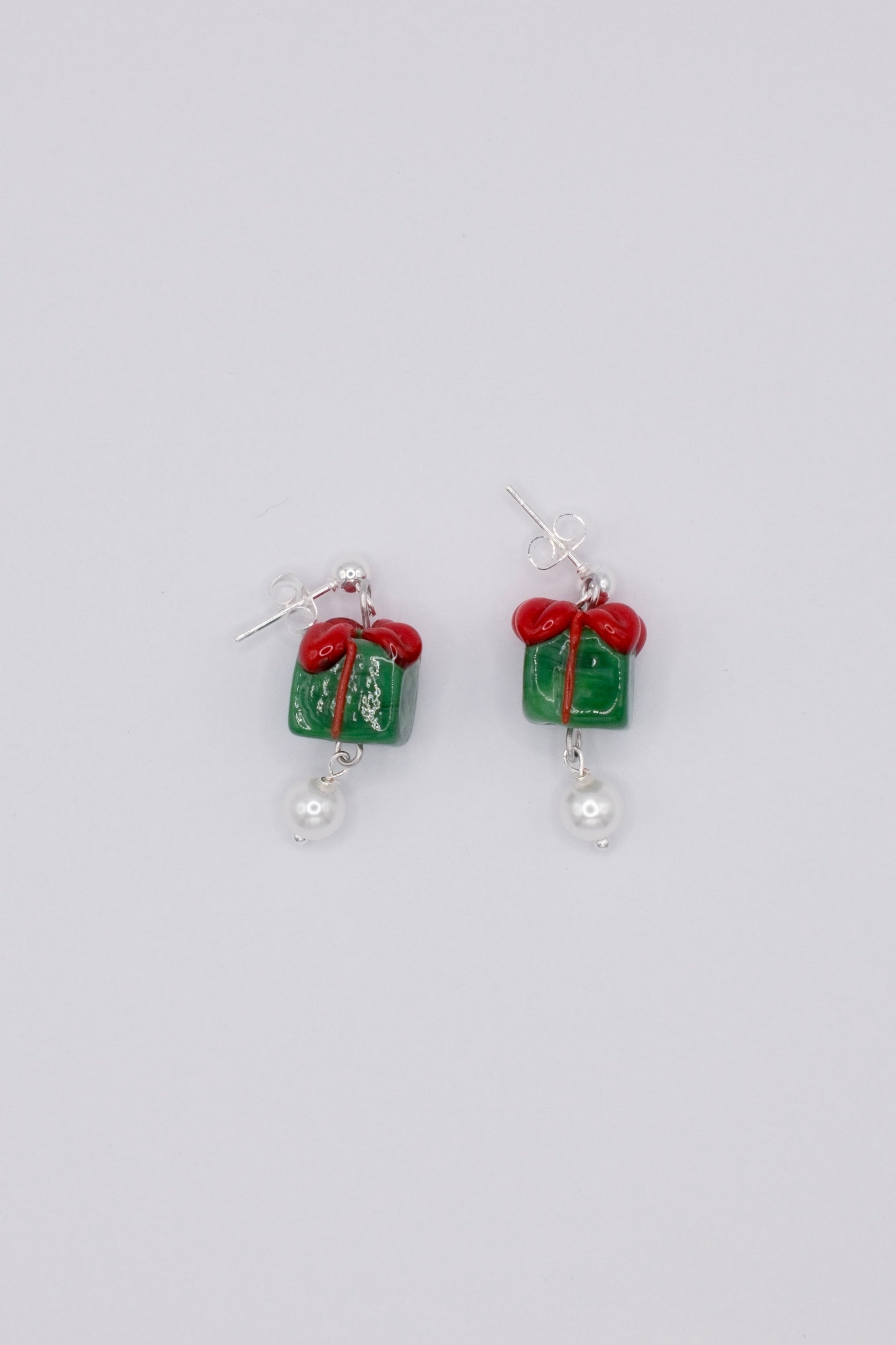 Lampwork glass present bead with an acrylic pearl dangling below, hanging from 18k gold or sterling silver studs. Perfect for the festive period. Please note, each pair may vary due to the handmade nature of the materials. Approx. 3cm in length.