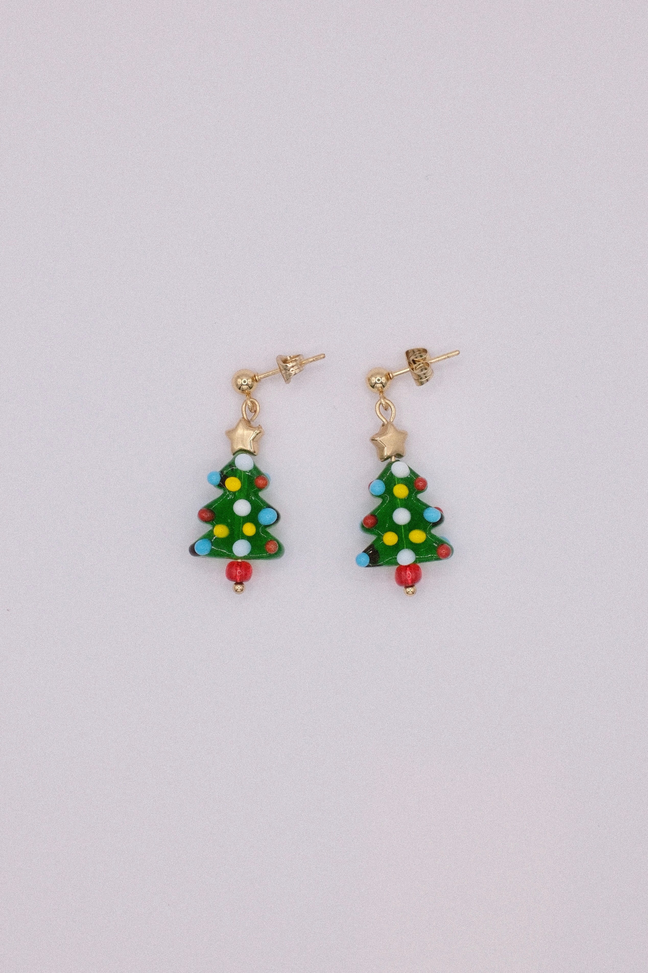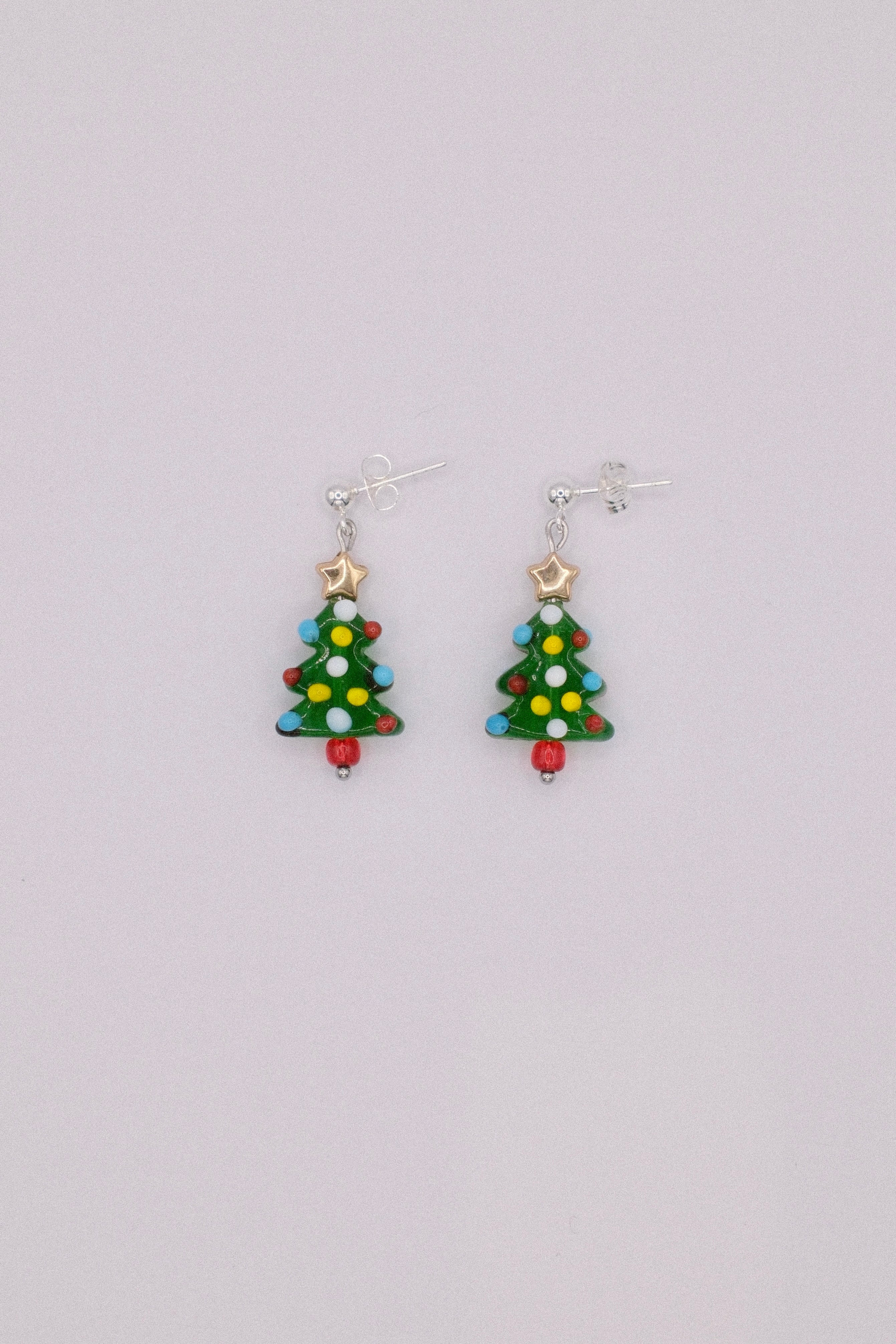 Lampwork glass Christmas tree with a golden bead on top, hanging from 18k gold or sterling silver studs. Perfect for the festive period. Please note, each pair may vary due to the handmade nature of the materials. Approx. 3.5cm in length.