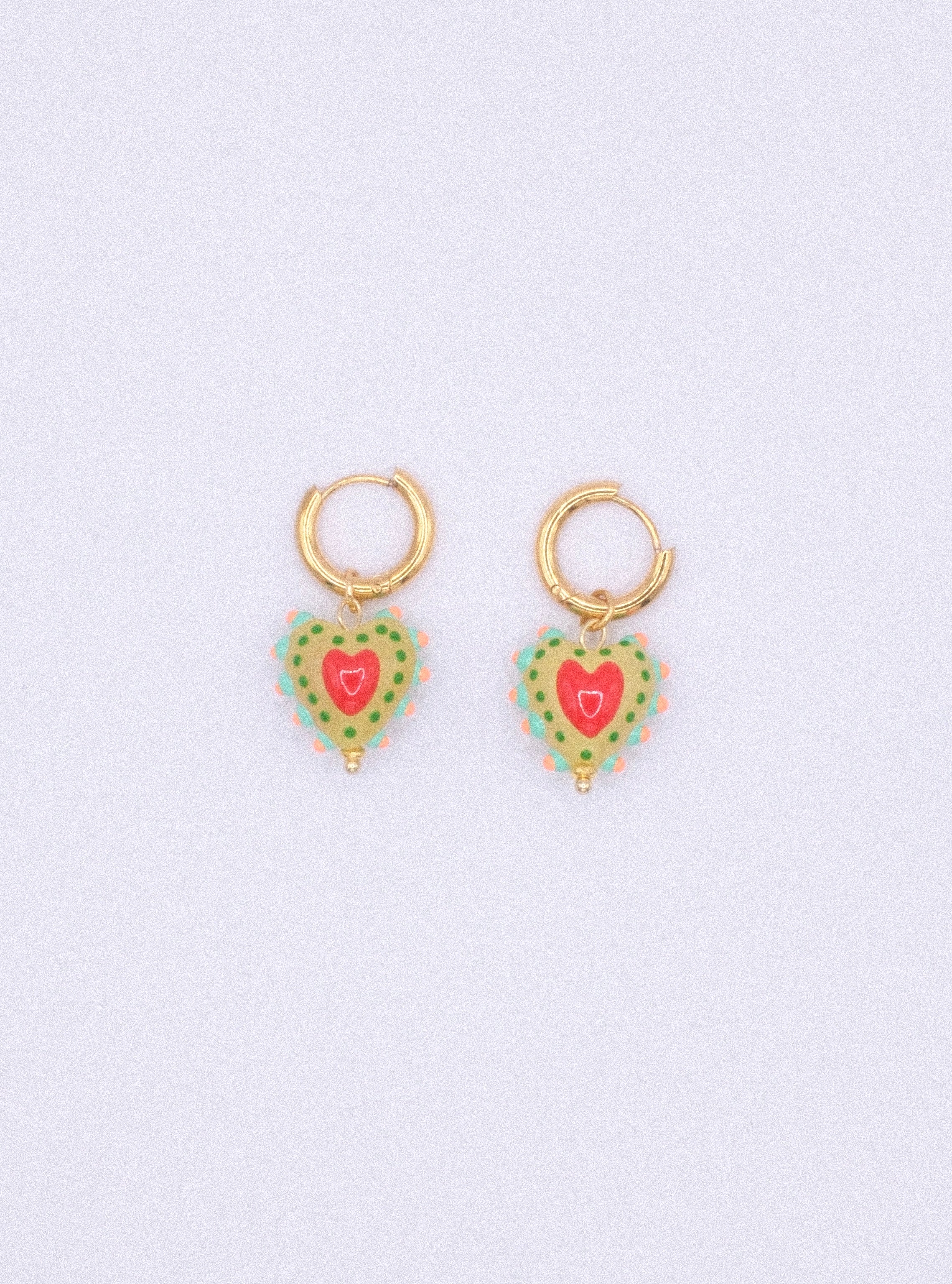 Handmade glass heart beads in green and red, finished with orange and turquoise spots. Attached to stainless steel hoops, these earrings bring a playful pop of colour to any outfit. Please note, each pair may vary slightly due to the handmade nature of the materials. Approx. 3cm in length.