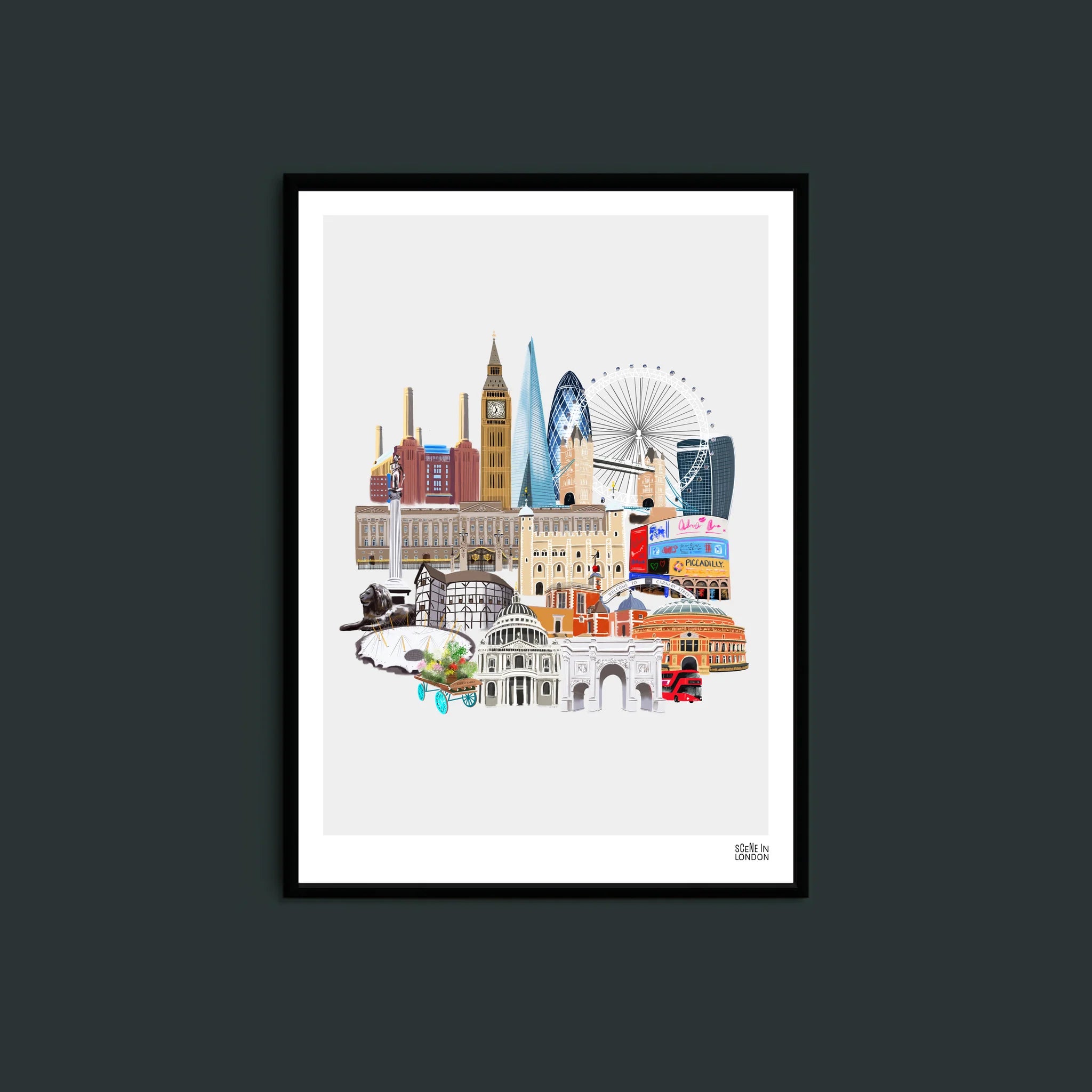 This art print includes Big Ben, Buckingham Palace, The London Eye, The Shard, Marble Arch, St. Paul's Cathedral, Trafalgar Square, The Walkie Talkie Tower, Battersea Power Station, The Royal Albert Hall, O2, Piccadilly Circus, Covent Garden Market, Carnaby Street, Royal Observatory Greenwich, Nelson's Column, Tower of London, The Gherkin, Tower Bridge and The Globe Theatre.