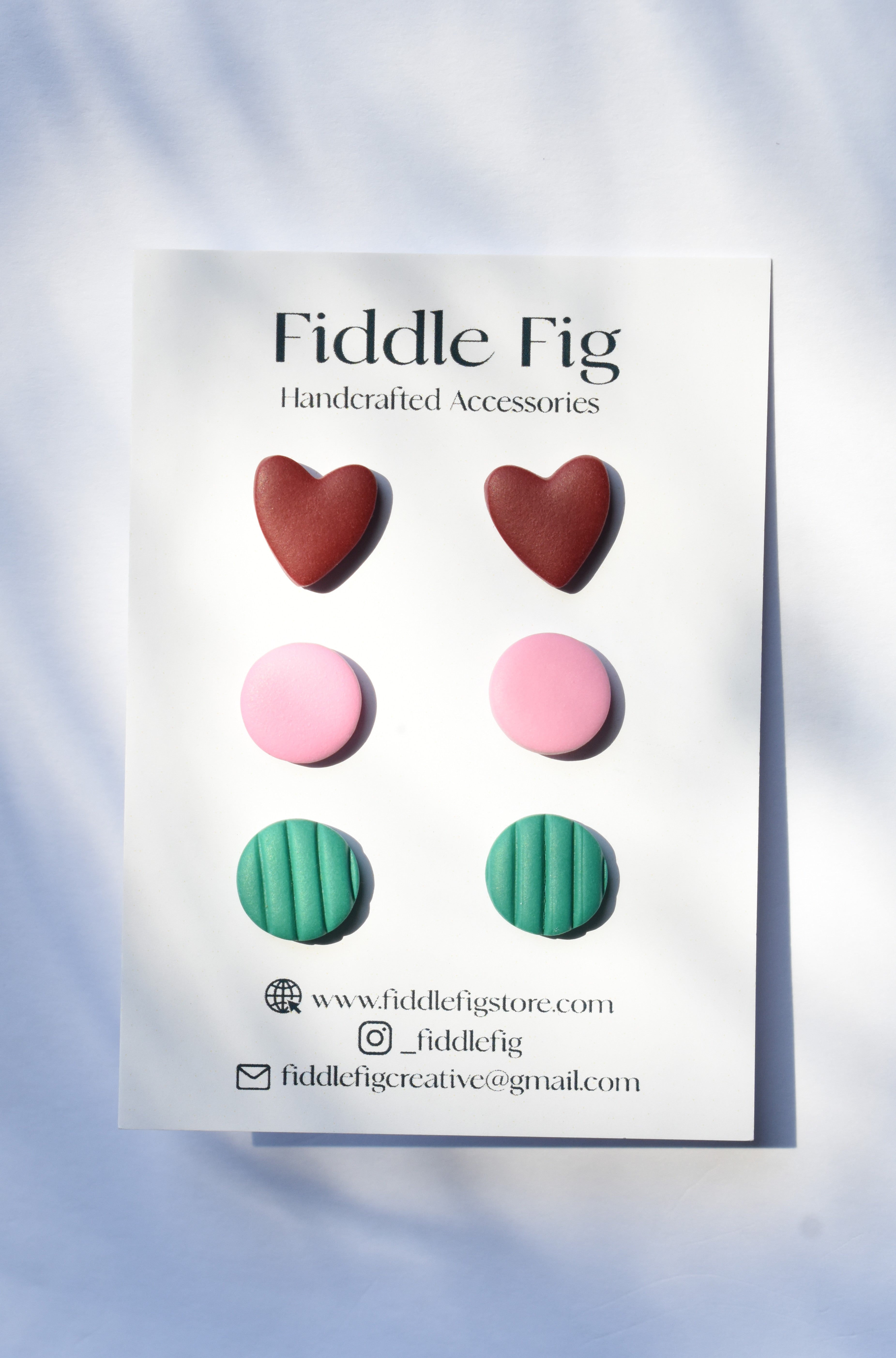 Set of three pairs stud earrings. Attached to nickel free stainless steel posts. Handmade using polymer clay.