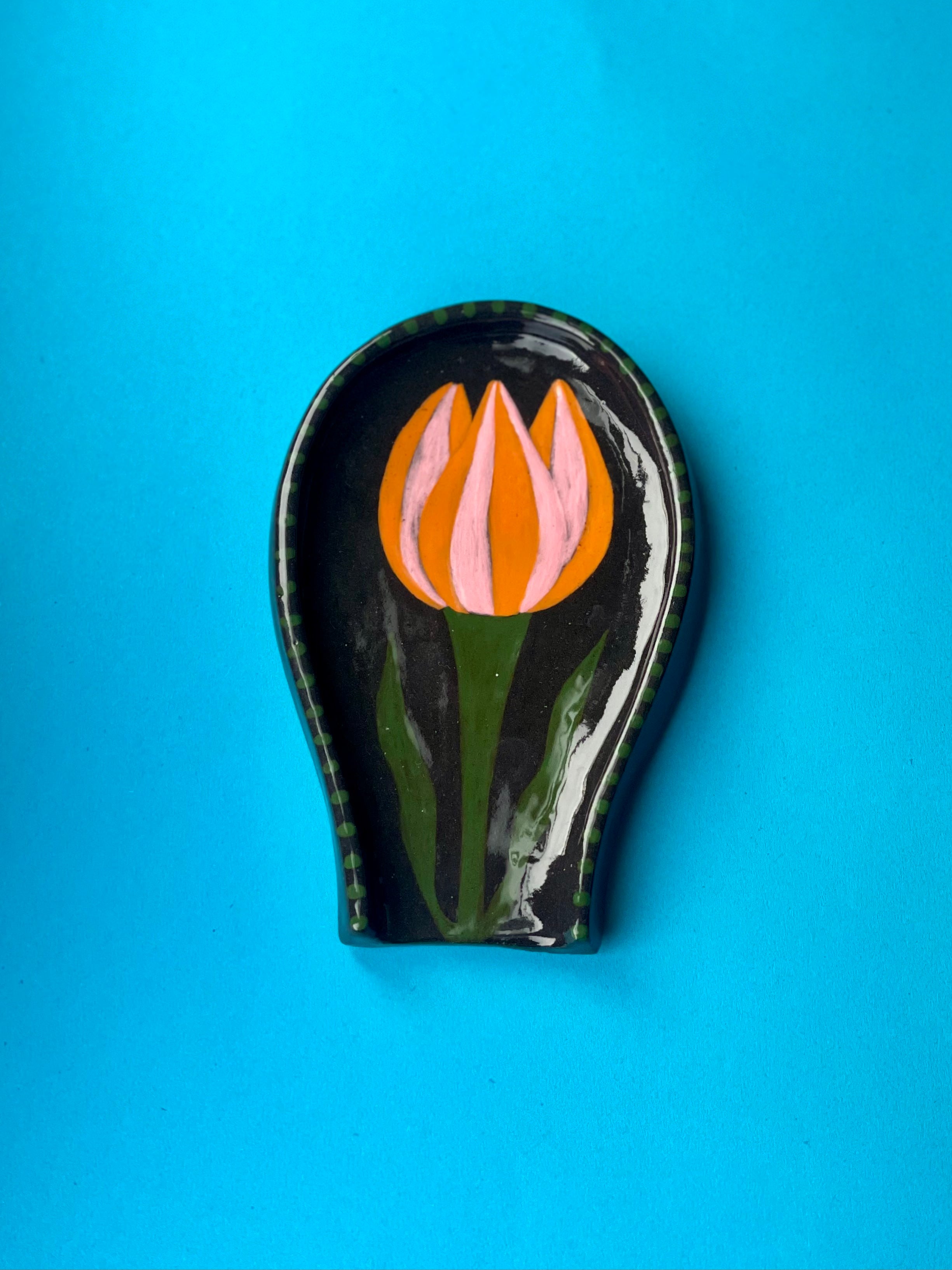 This spoon rest is handmade using a slab building technique in black stoneware clay. The tulip design is hand painted with underglaze, finished with a transparent glaze. Dimensions: W9cm x L14cm