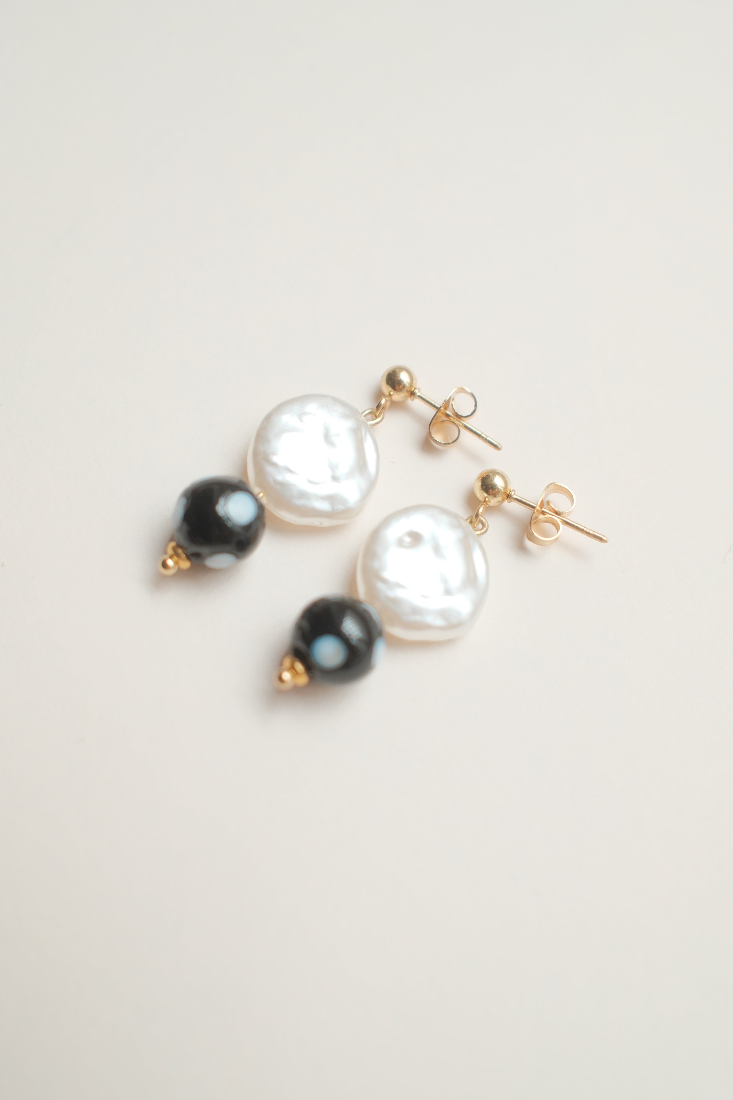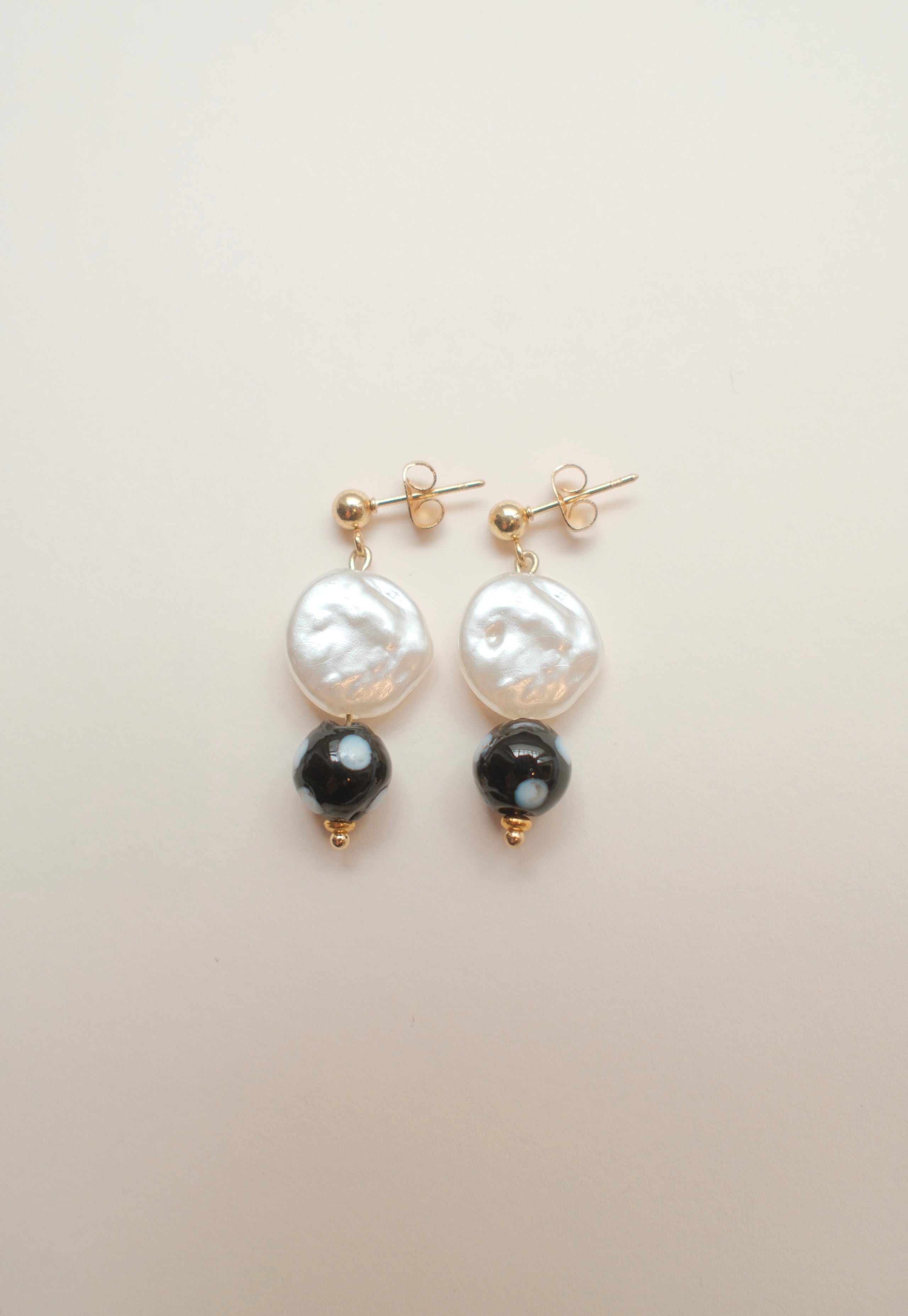 Acrylic round pearls with lampwork black and white polka dot beads on sterling sliver studs, perfect for day-to-night wear. Please note, each pair may vary slightly due to the handmade nature of the materials. Approx. 3cm in length.