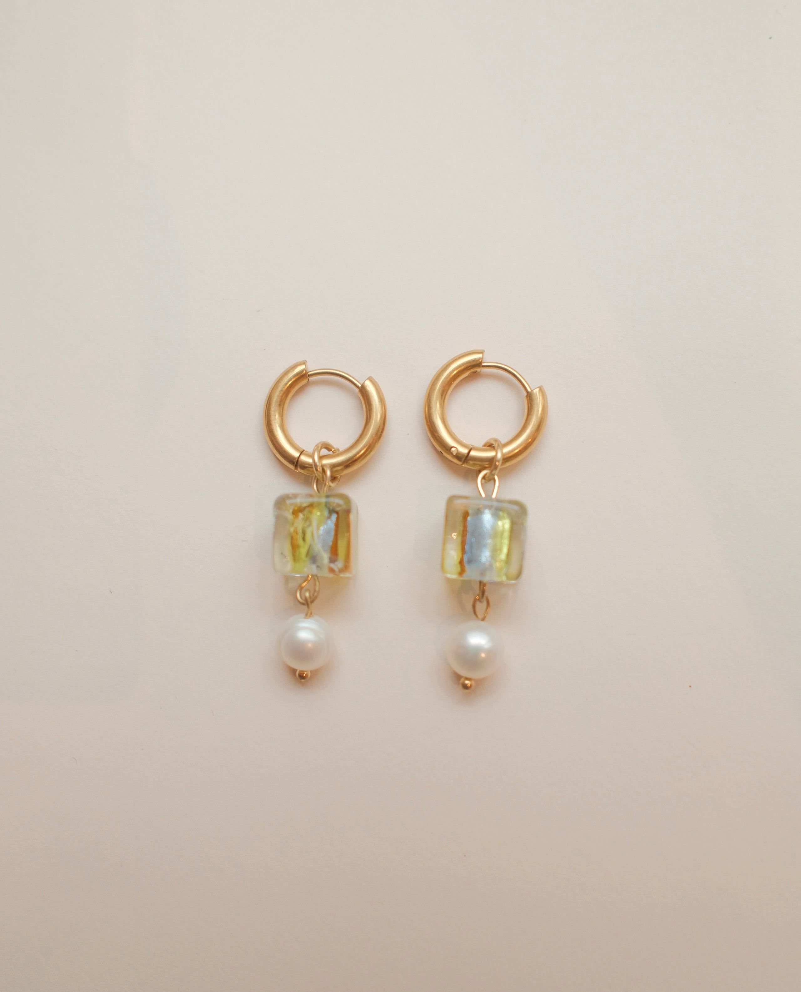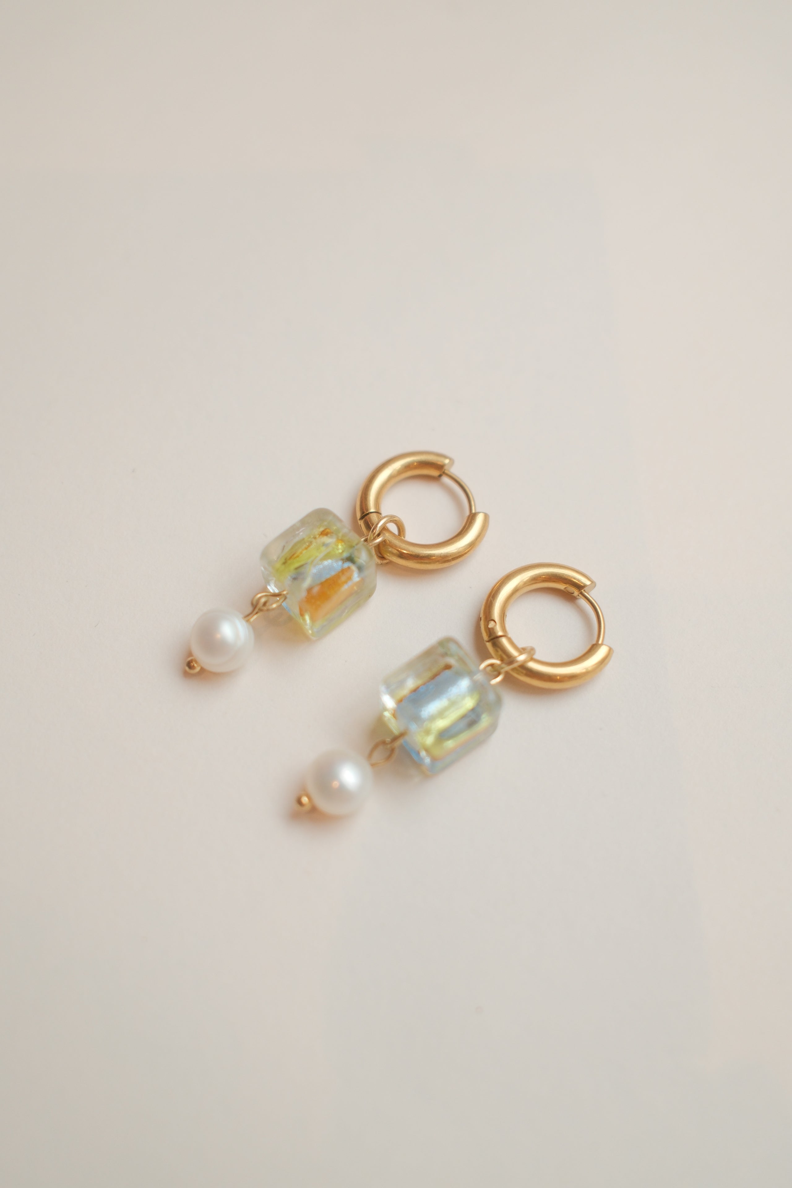 Handmade lampwork glass cube beads with shimmery layers of green, brown and blue, paired with a freshwater pearl attached to stainless steel hoops. Please note, each pair may vary slightly due to the handmade and natural materials. Approx. 4cm in length.